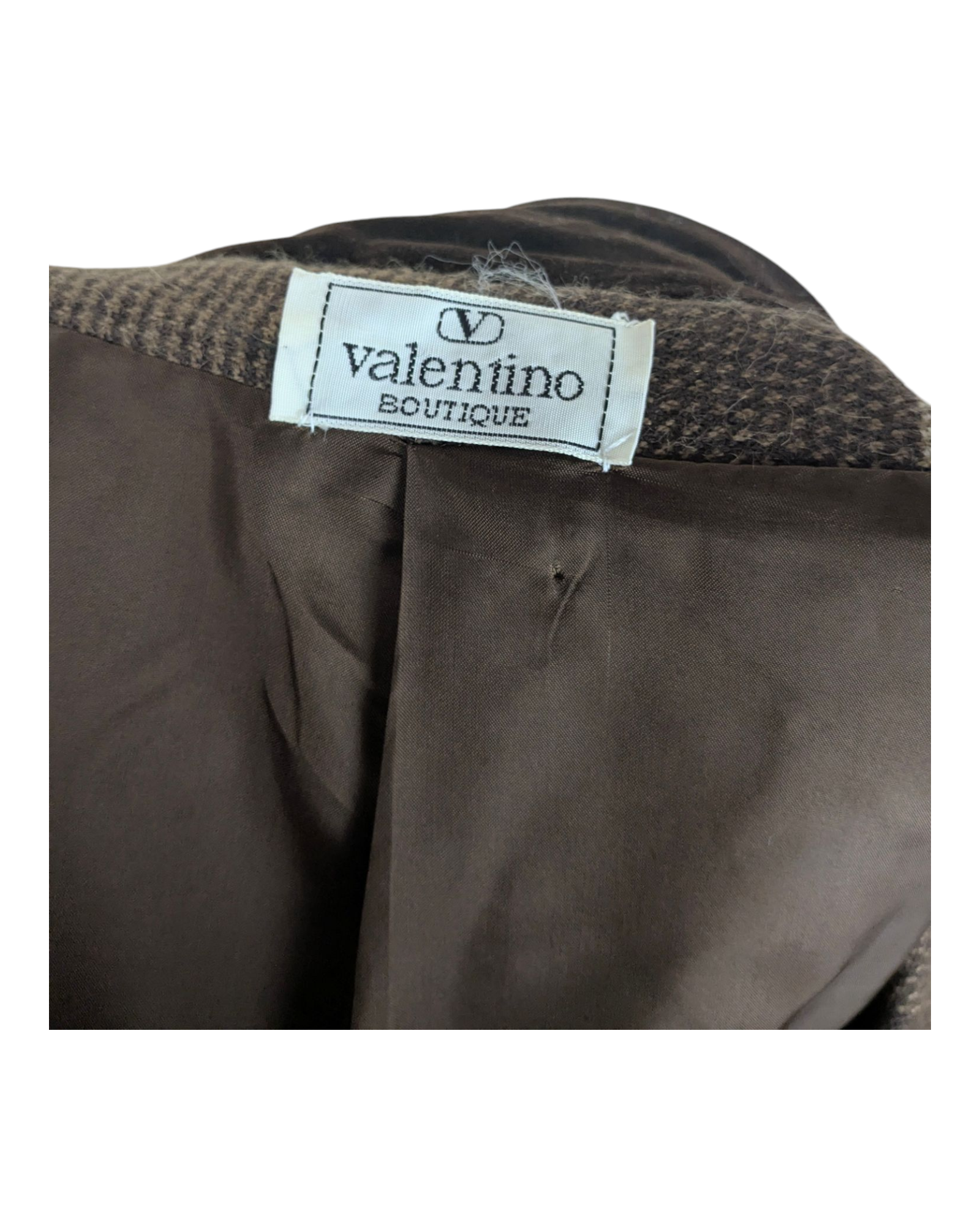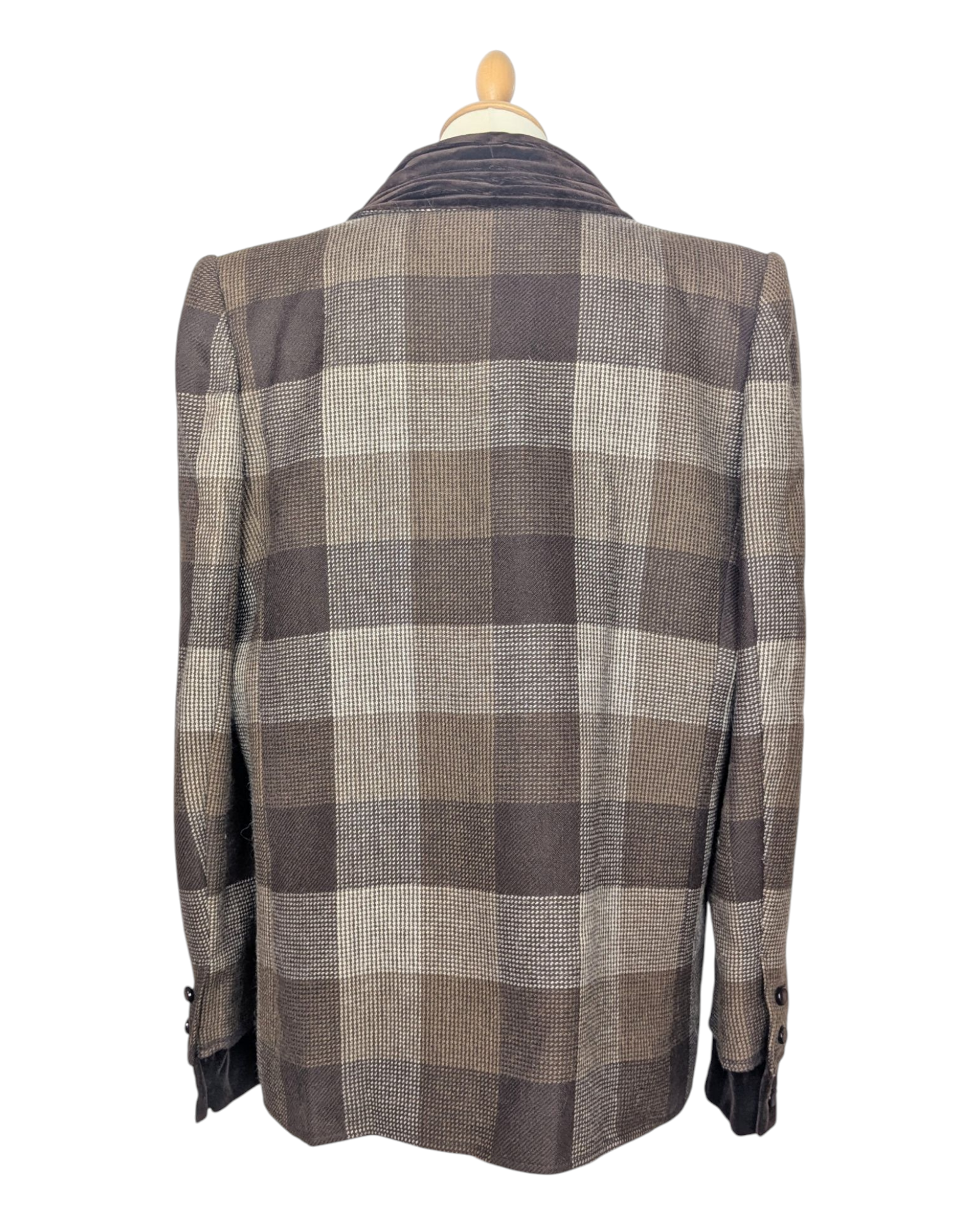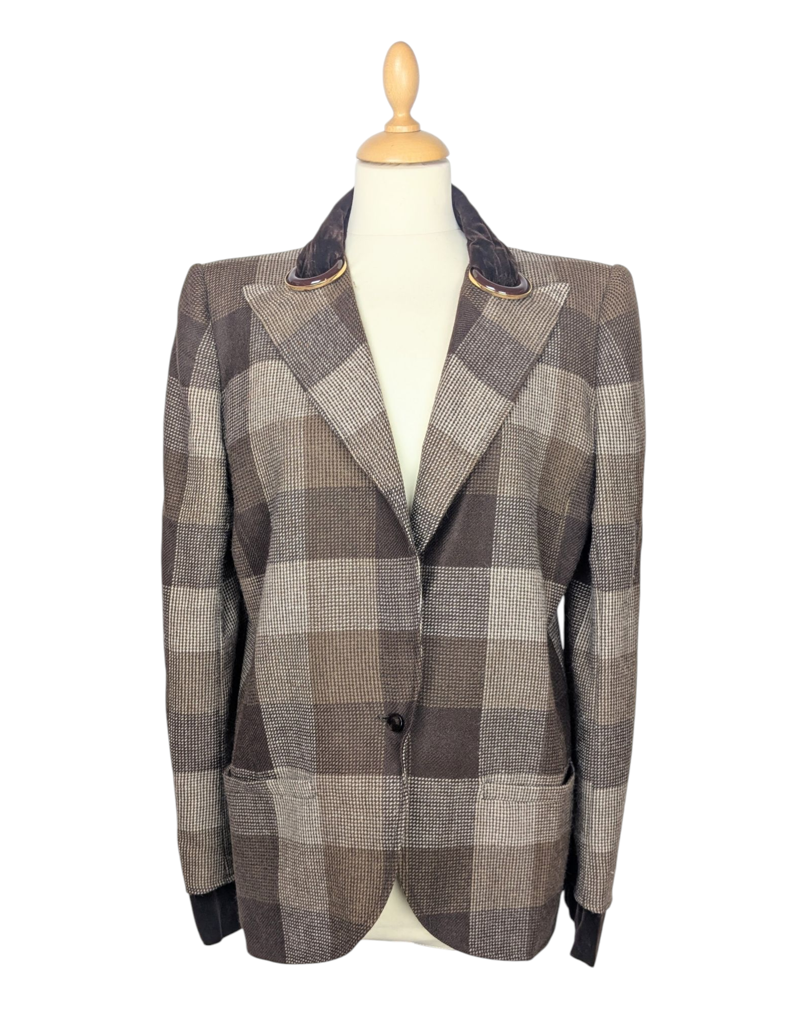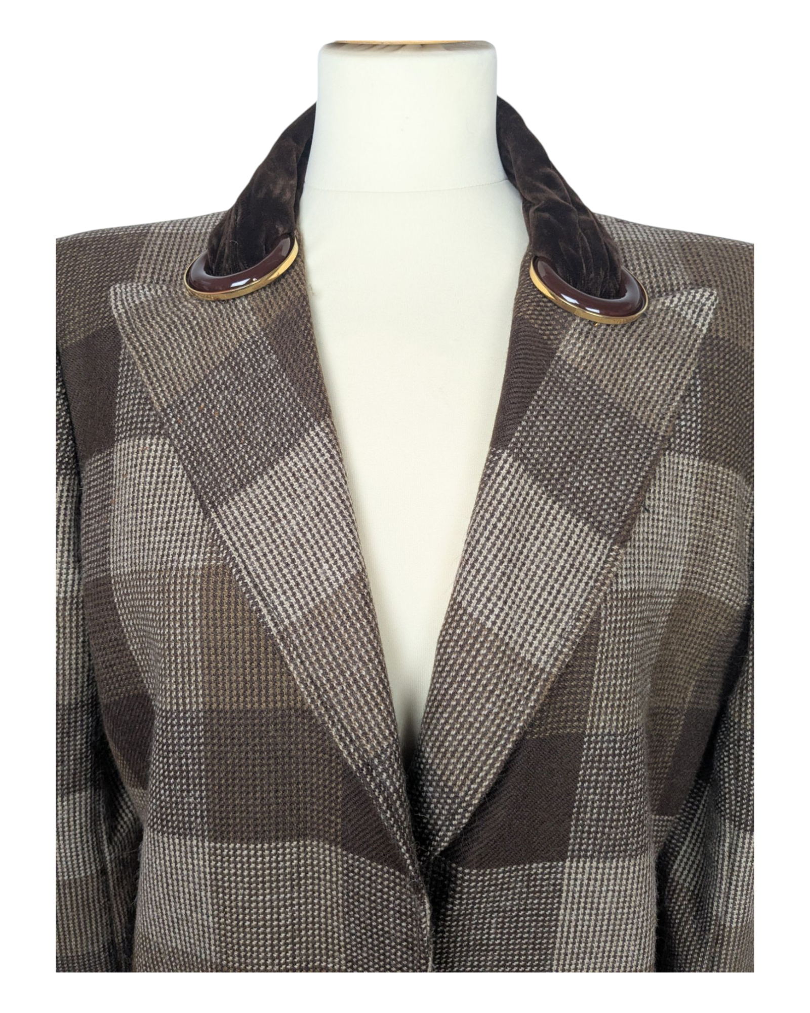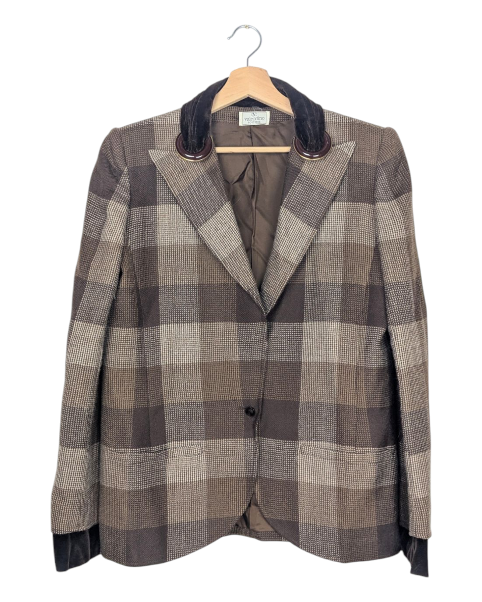 Très belle veste à carreaux en laine très douce de la marque Valentino. Très beau col en velours avec anneaux dorés. Coupe droite.