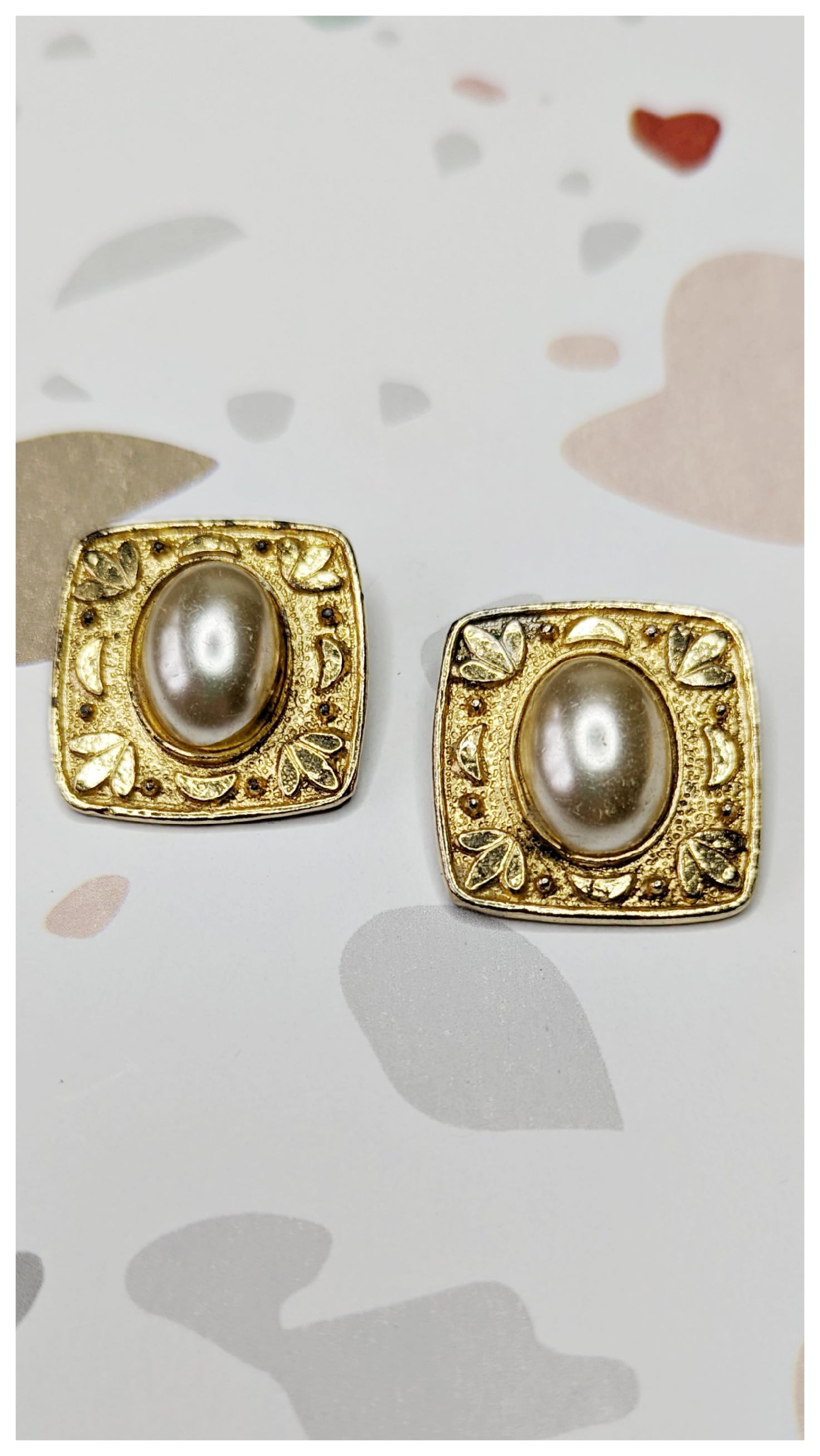 Boucles d'oreilles, clips, carrée avec perles nacrées. En métal.