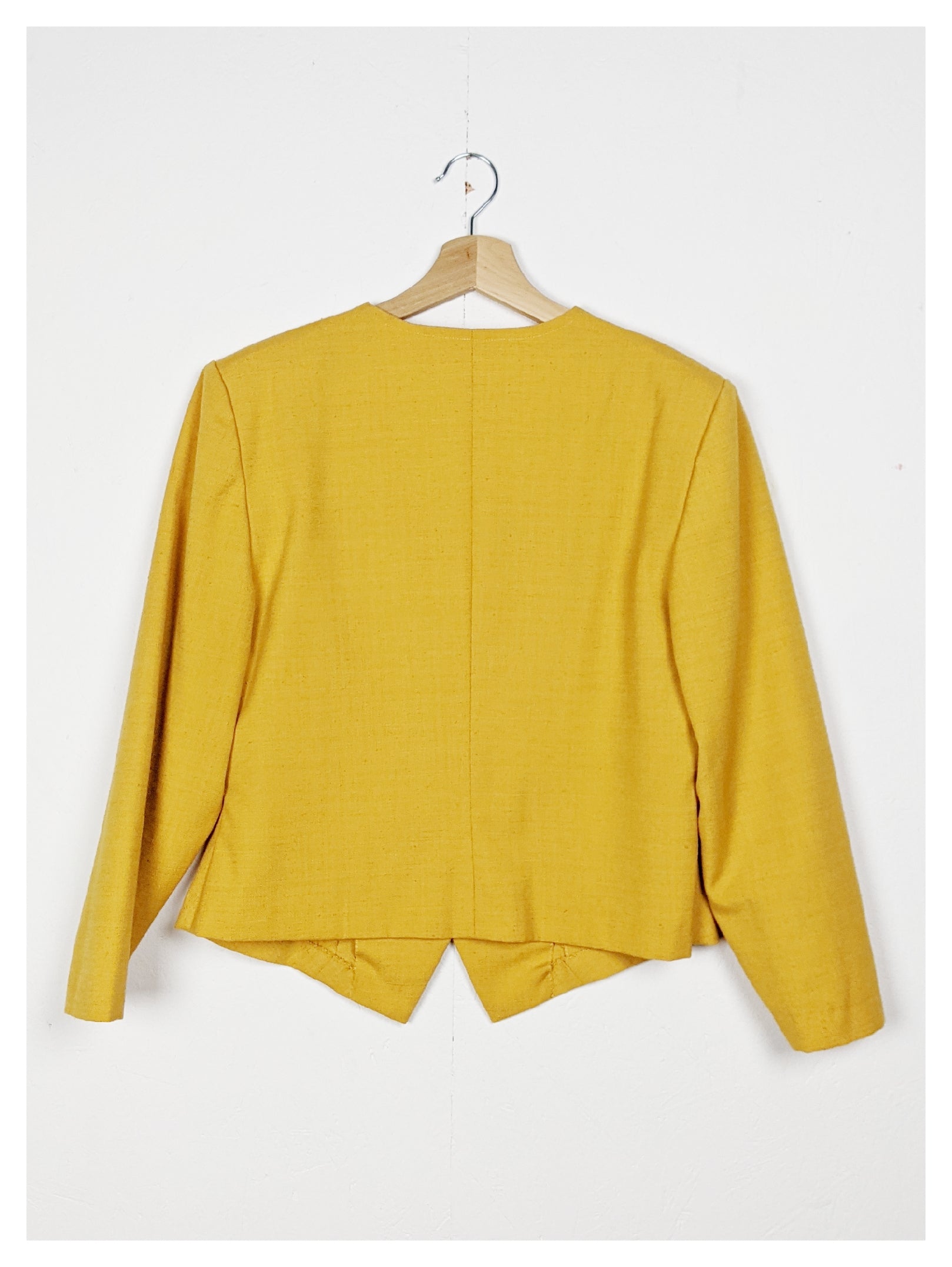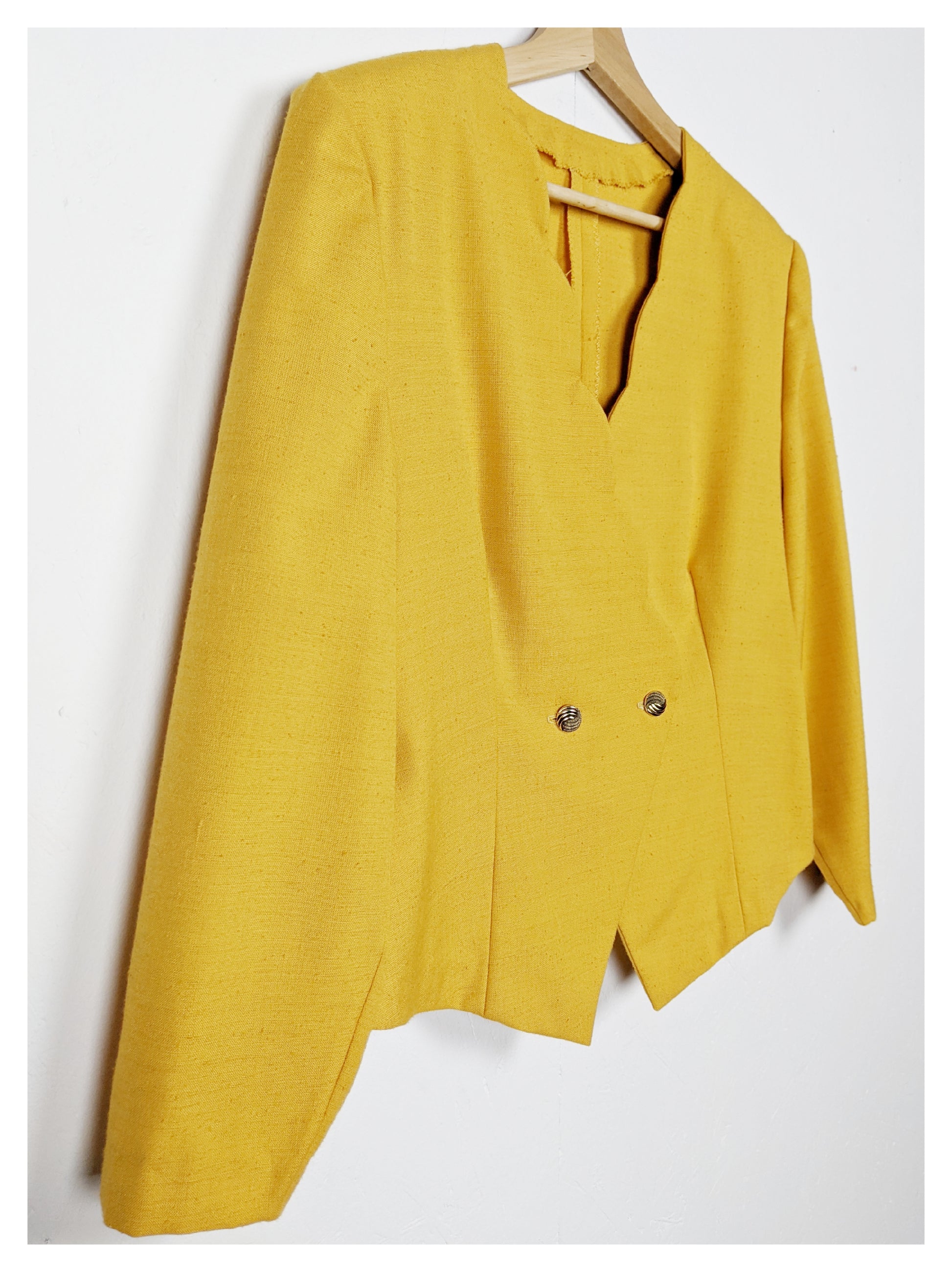 Petite pépite de veste moutarde aux jolis détails. Encolure en V, avec arrondis bombés. Deux pinces sur le devant de la poitrine au fond pour cintrer la veste. Elle s'attache en croisé avec deux jolis boutons dorés estampillés. Se termine en deux pointes sur le devant. Petites épaulettes pour structurer la silouhette (elles peuvent très facilement être décousues). Très élégante !