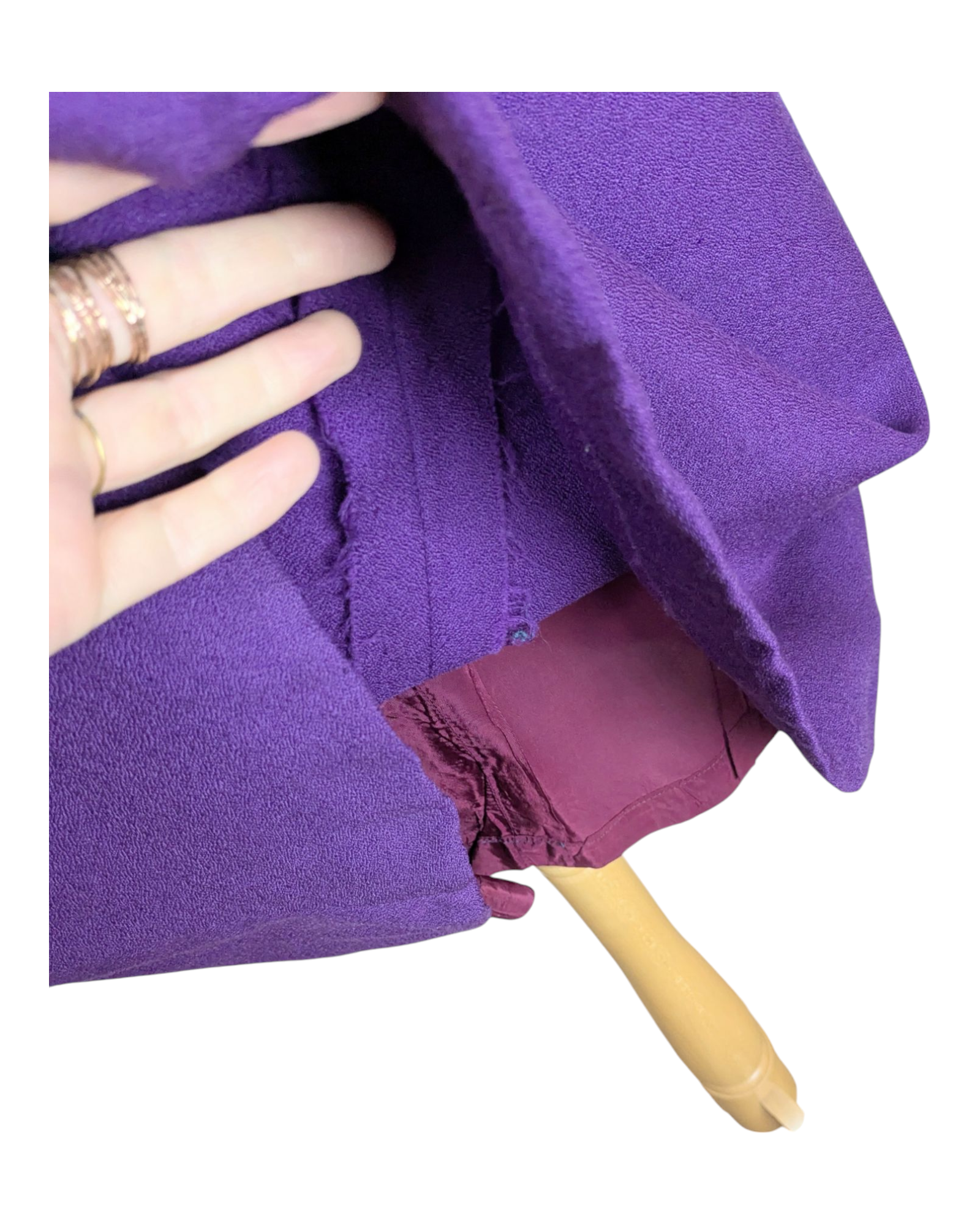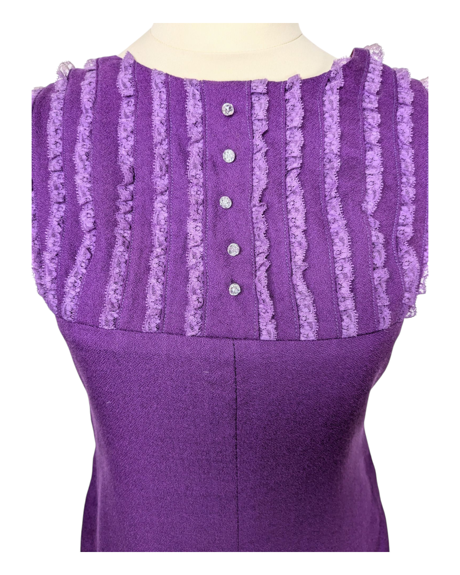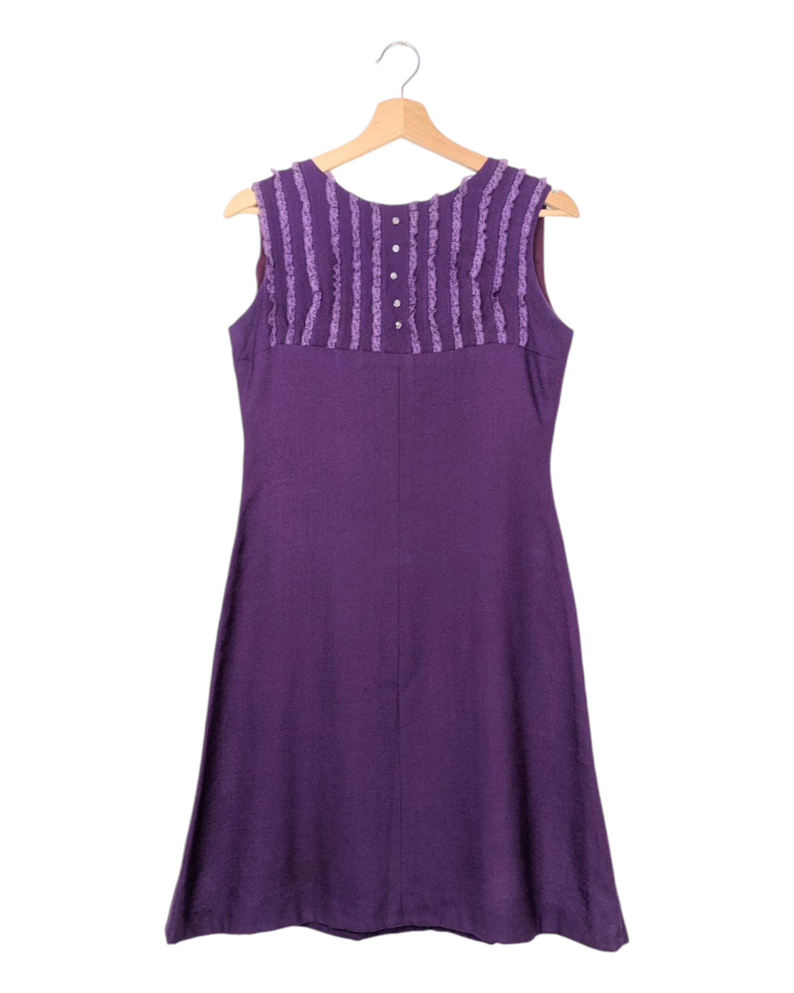 Petite robe typique des années 60. En crêpe mauve avec corsage décoré. Doublée. Coupe trapèze avec buste lègement cintré. Très jolie pour le printemps.