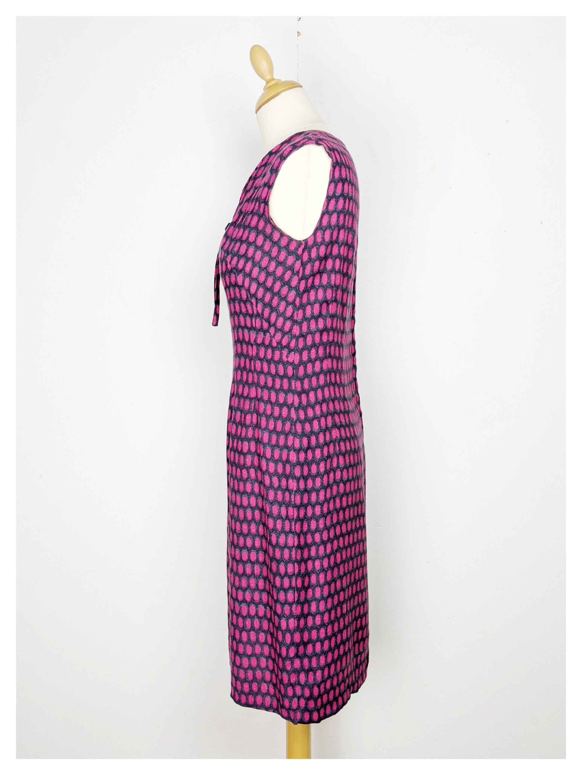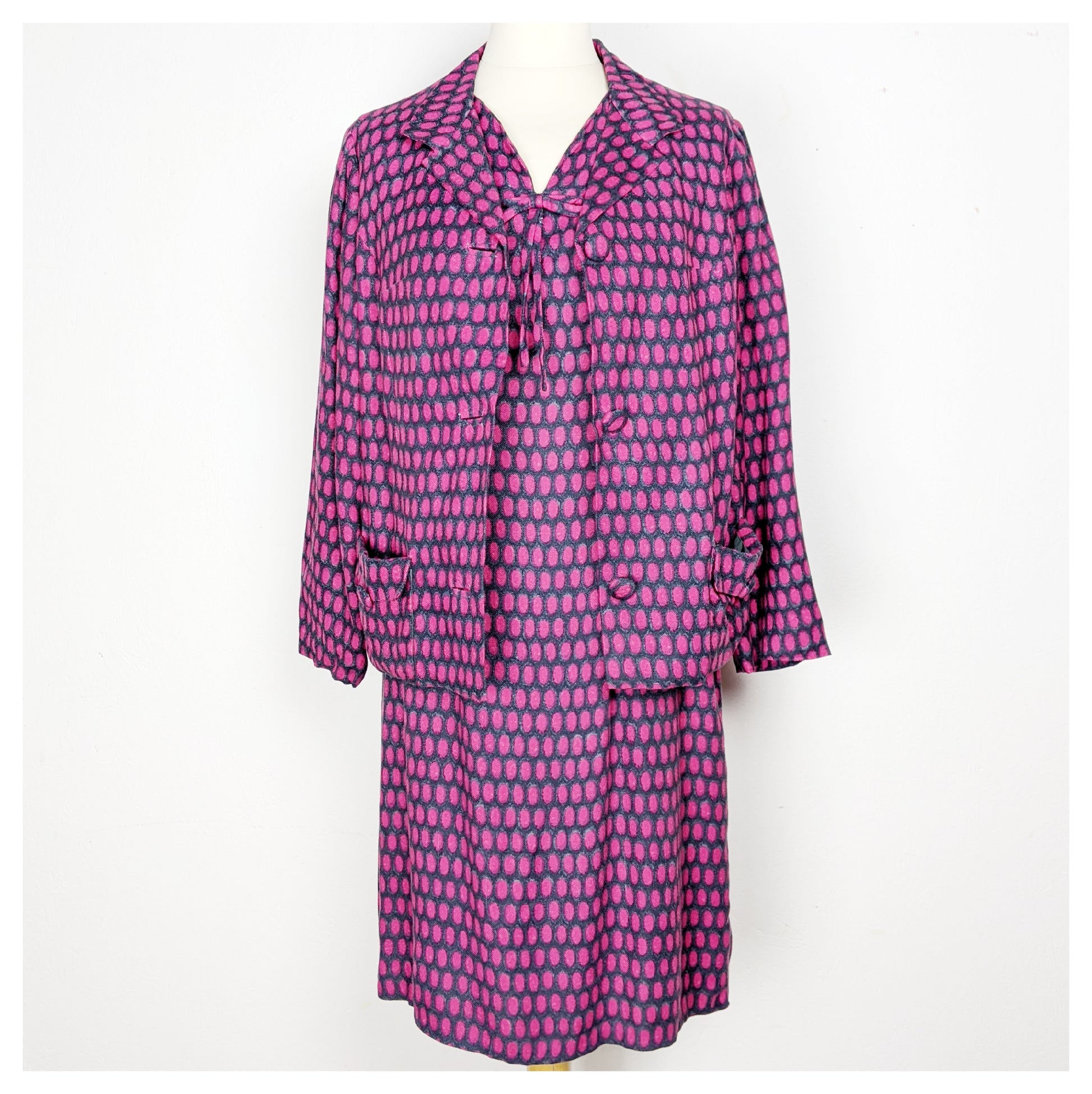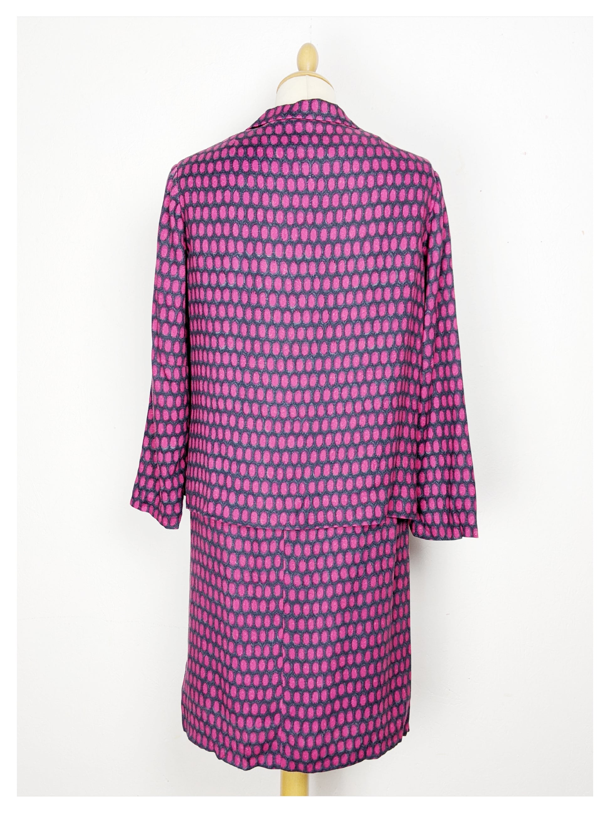 Très joli tailleur, typique des années 60 avec sa robe à la coupe classique et sa petite veste droite. Tissu fluide et très doux à motif ovale dans les tons gris, noir, fuchsia et mauve. Le tombé est parfait !