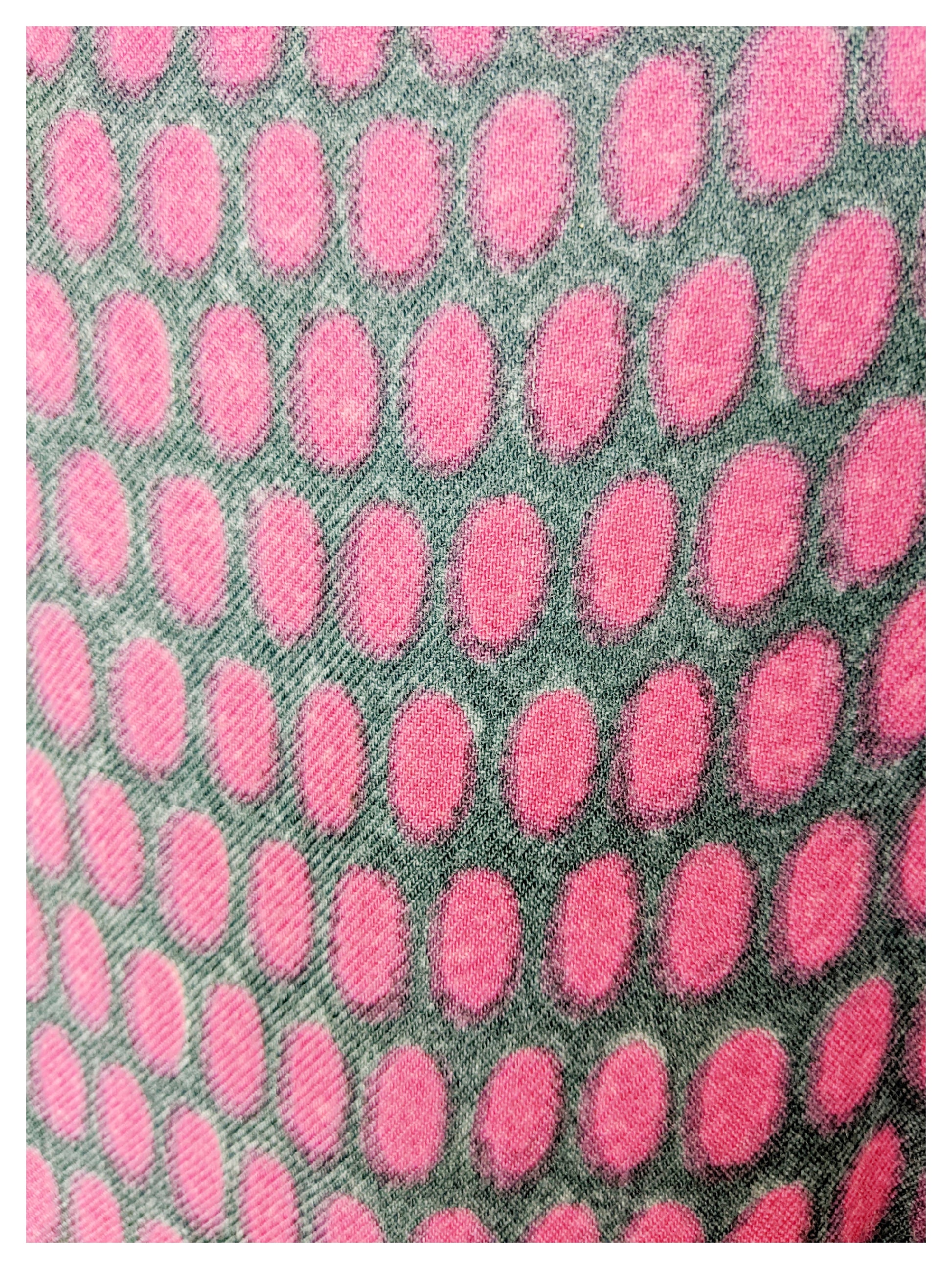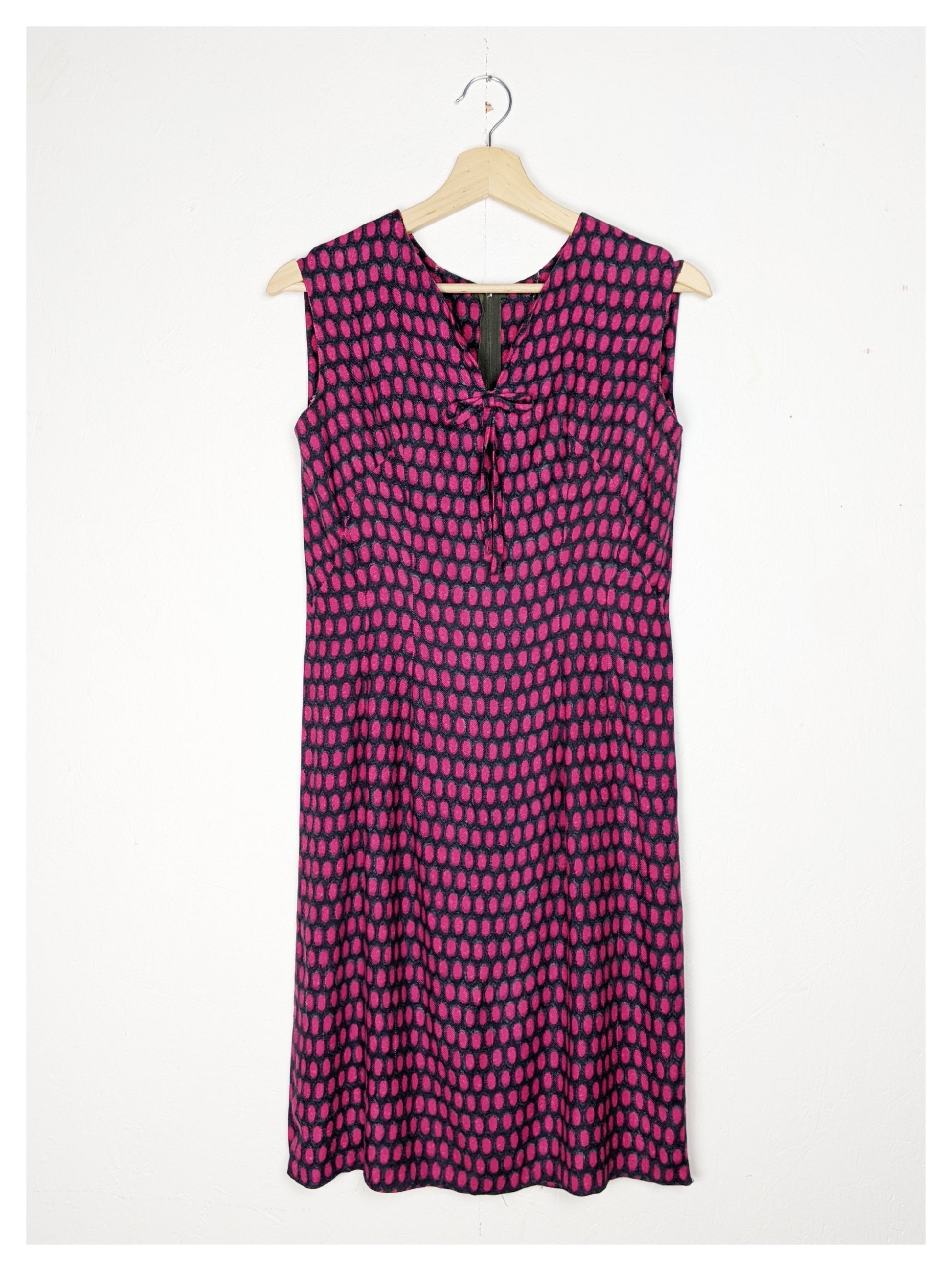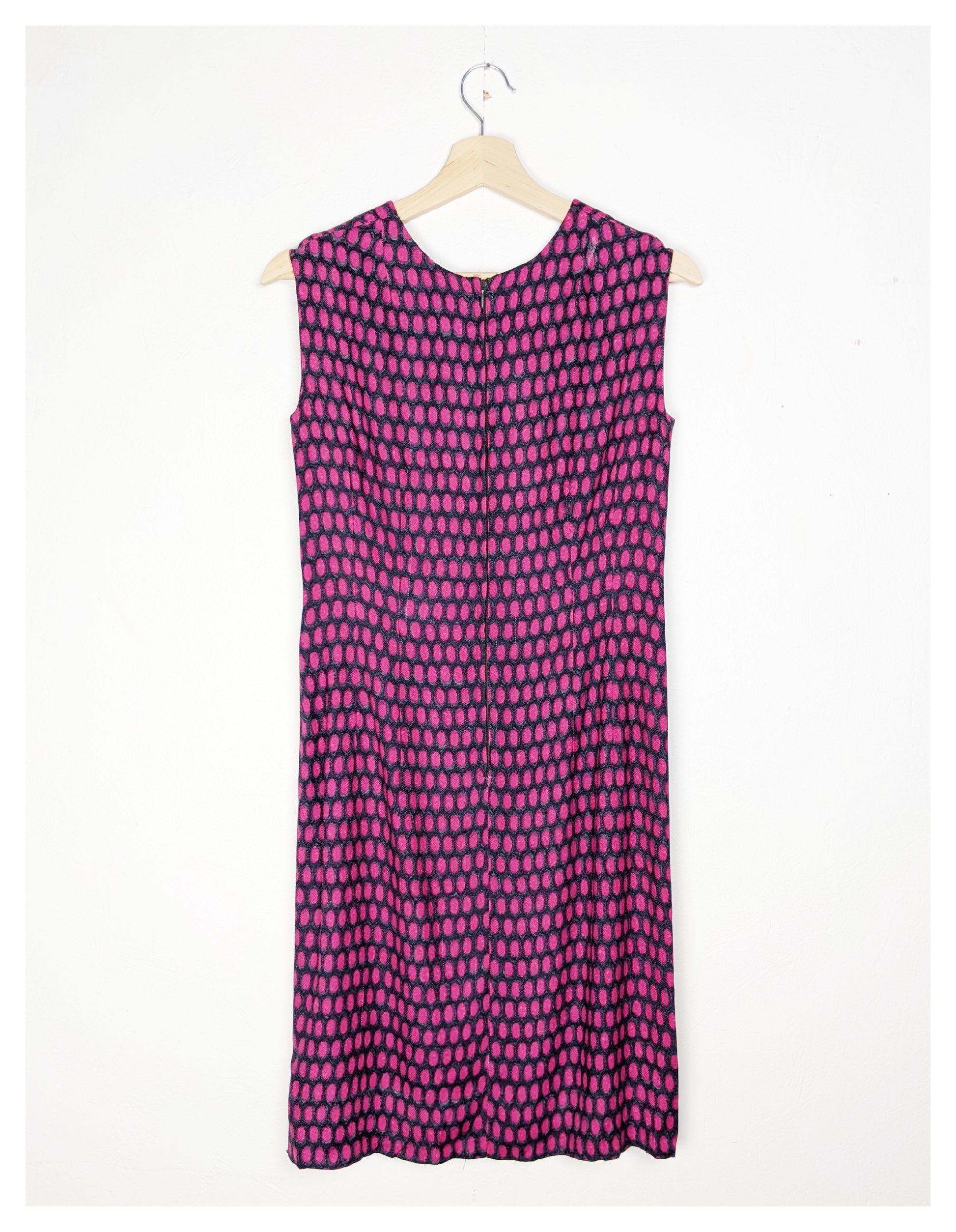 Très joli tailleur, typique des années 60 avec sa robe à la coupe classique et sa petite veste droite. Tissu fluide et très doux à motif ovale dans les tons gris, noir, fuchsia et mauve. Le tombé est parfait !