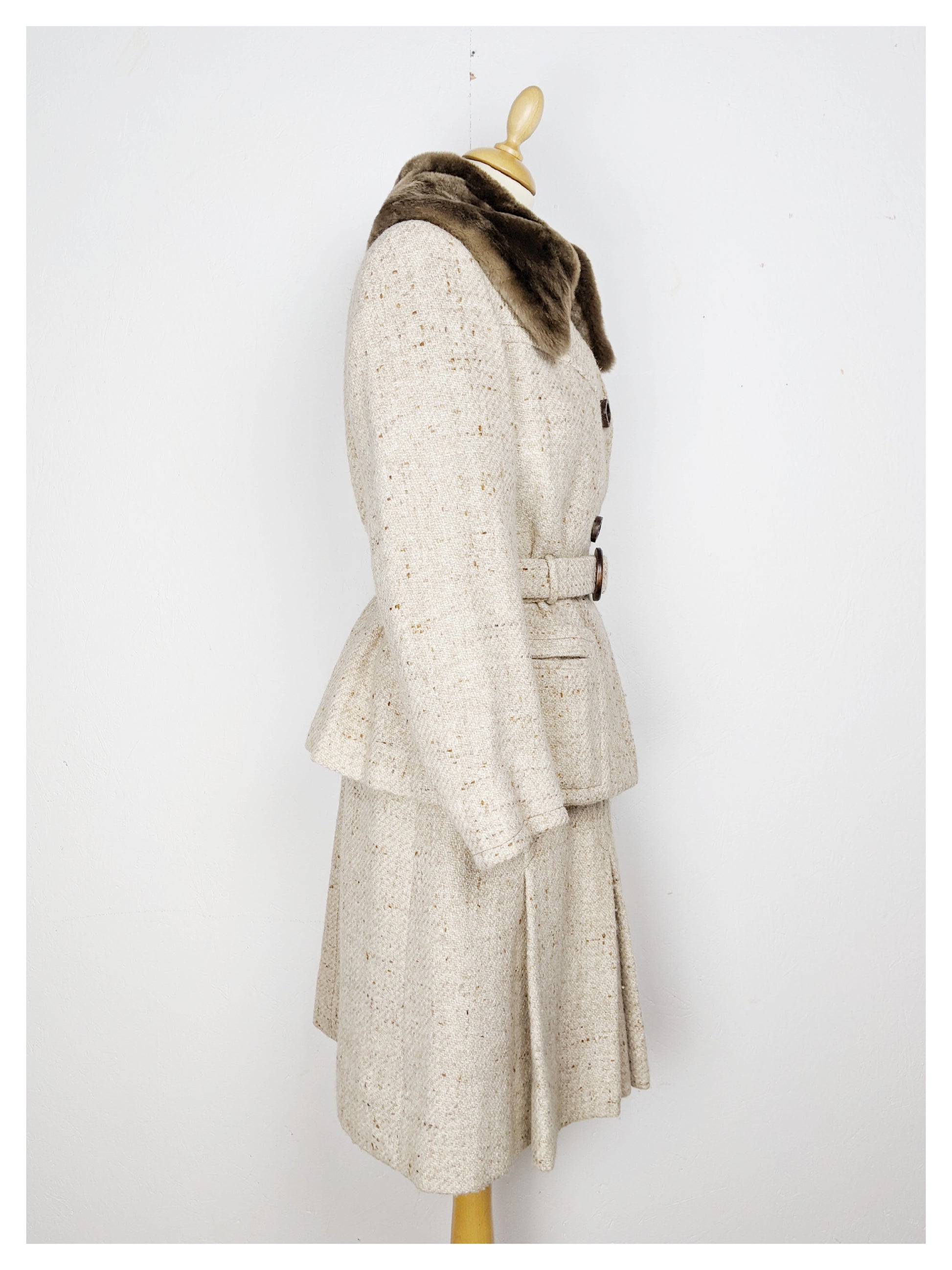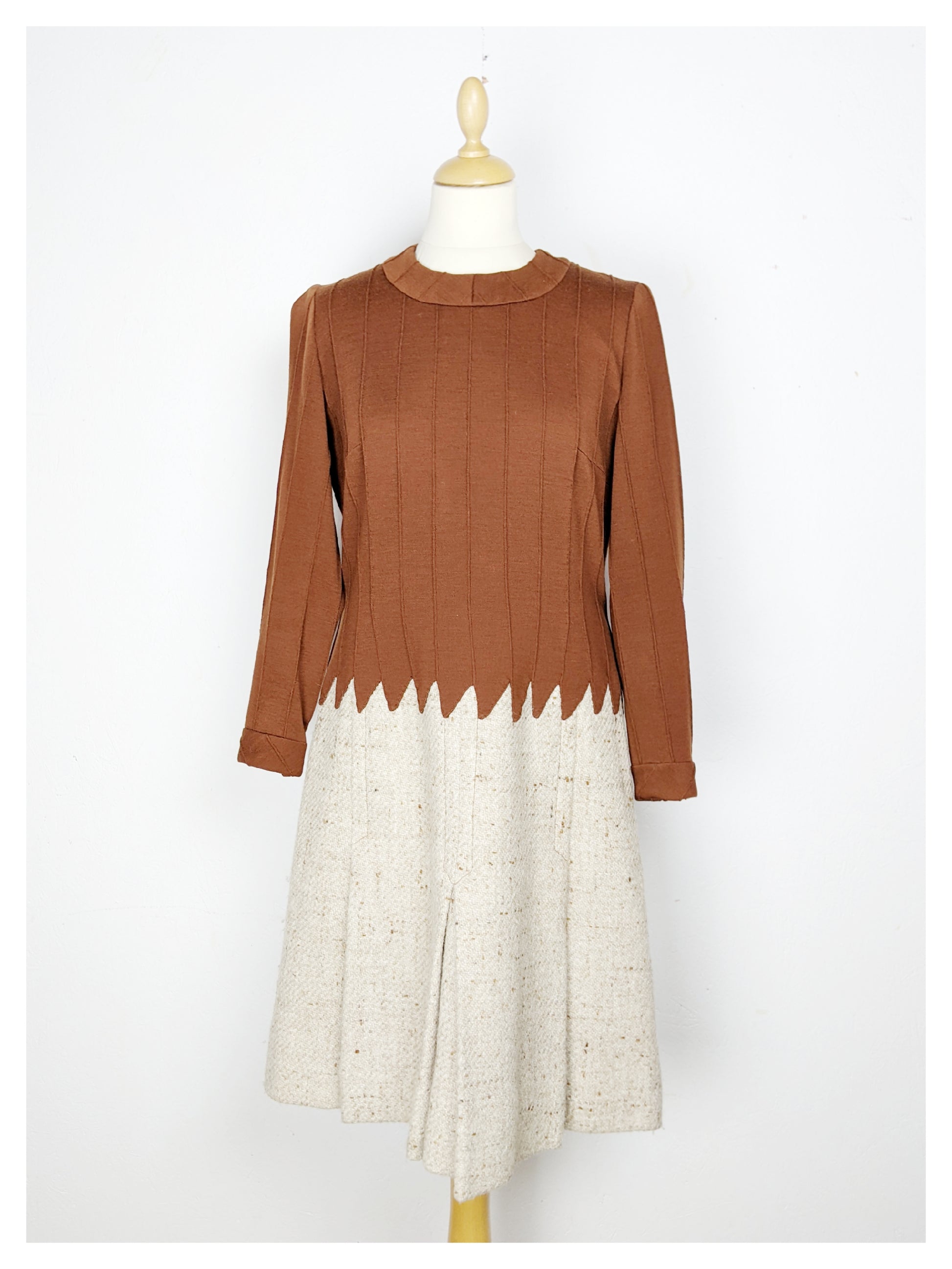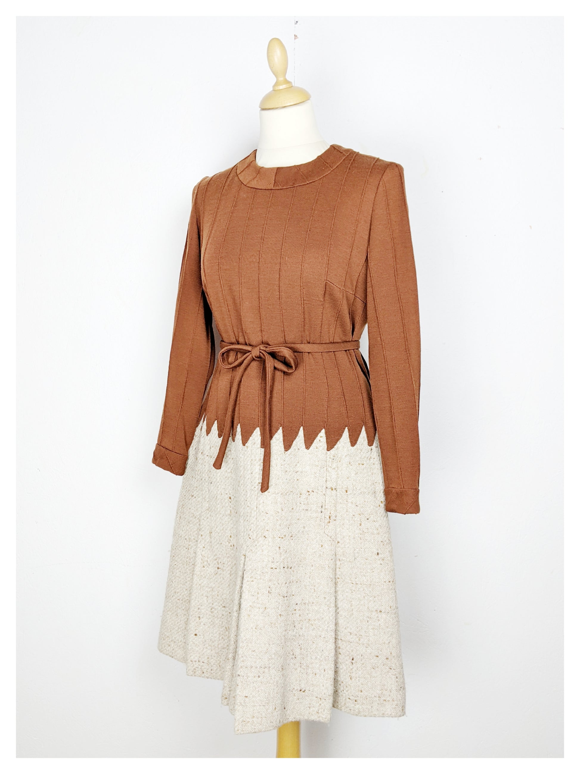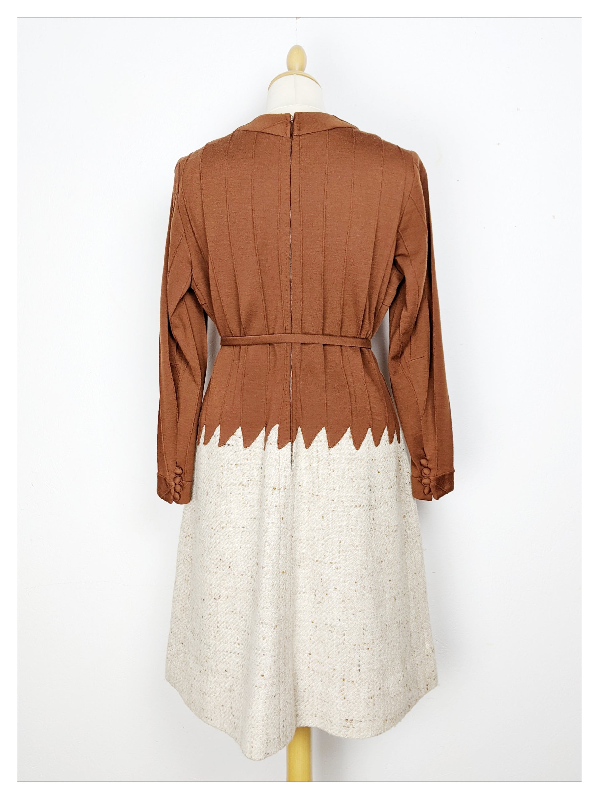 Magnifique tailleur-robe avec multiple détails. La robe est juste sublime et originale. Dans deux tissus différents. Le marron est assez épais, le second est en laine et épais également. Il est moucheté dans les tons beige, crème et marron. Le col en fourrure est extrêmement doux. L'ensemble est très chaud.