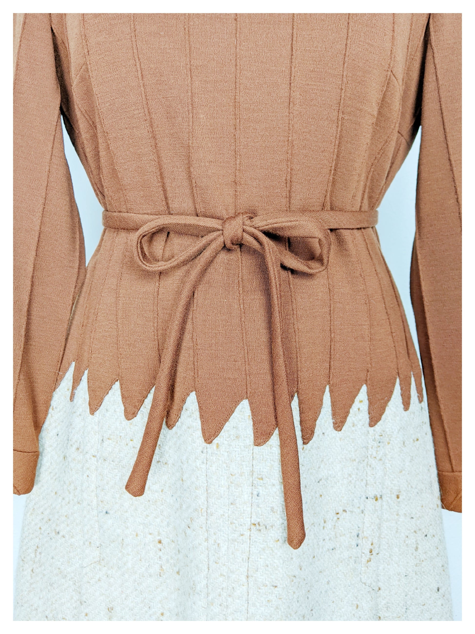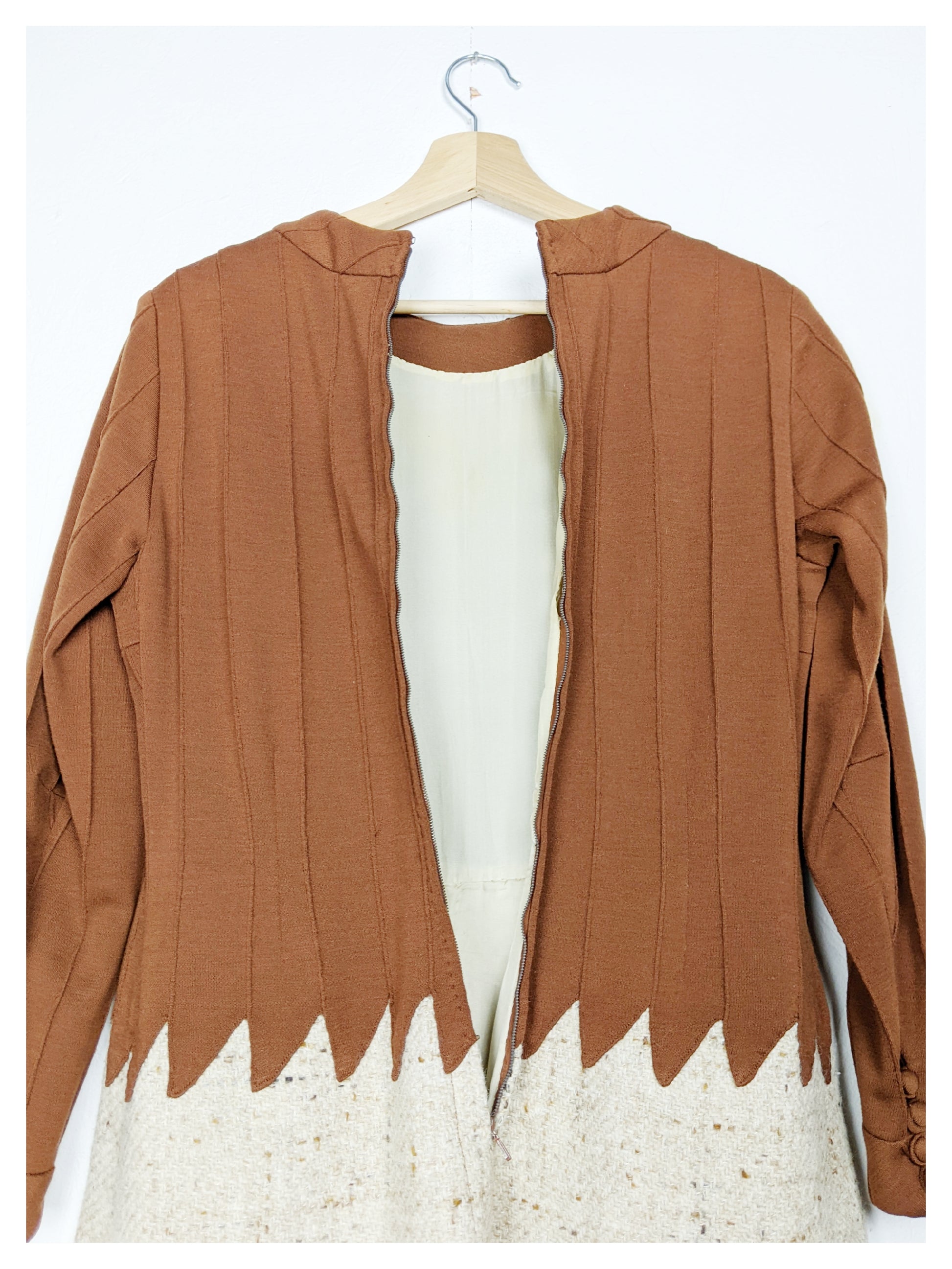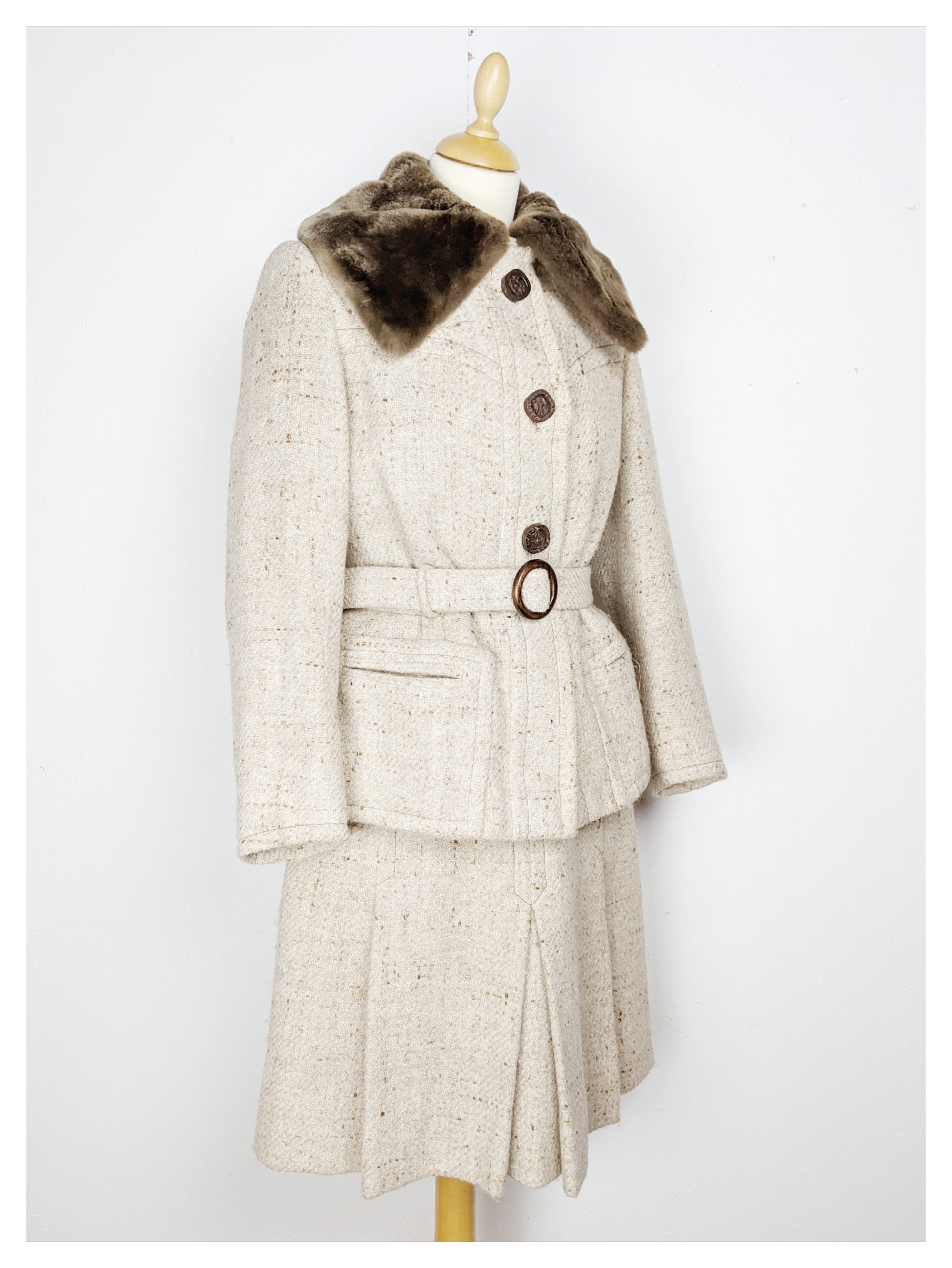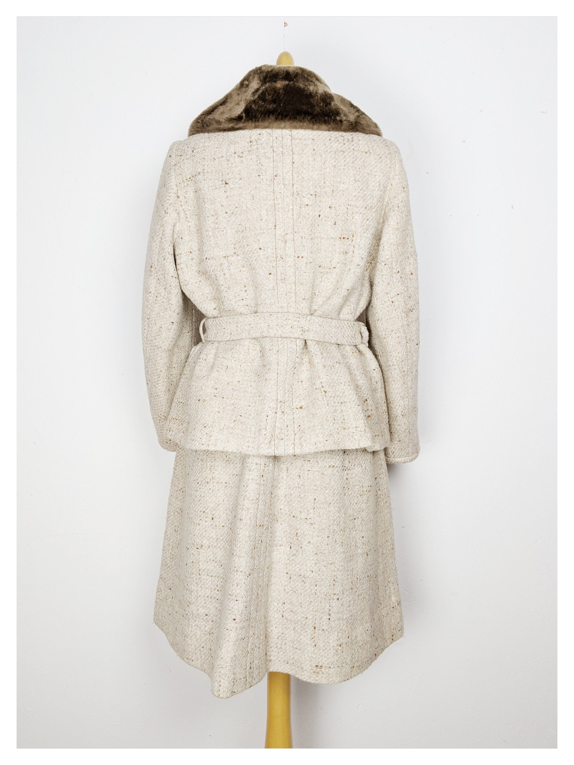 Magnifique tailleur-robe avec multiple détails. La robe est juste sublime et originale. Dans deux tissus différents. Le marron est assez épais, le second est en laine et épais également. Il est moucheté dans les tons beige, crème et marron. Le col en fourrure est extrêmement doux. L'ensemble est très chaud.