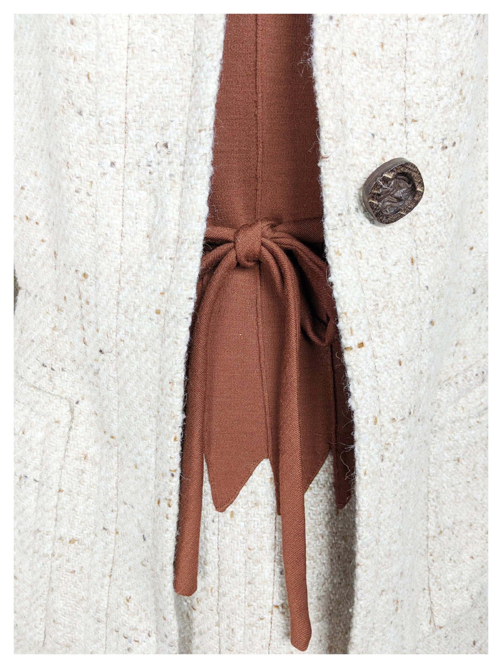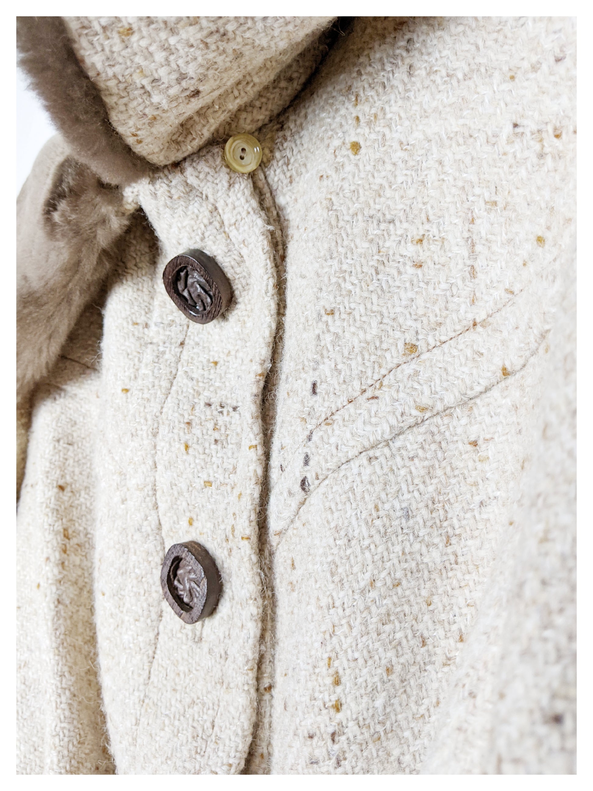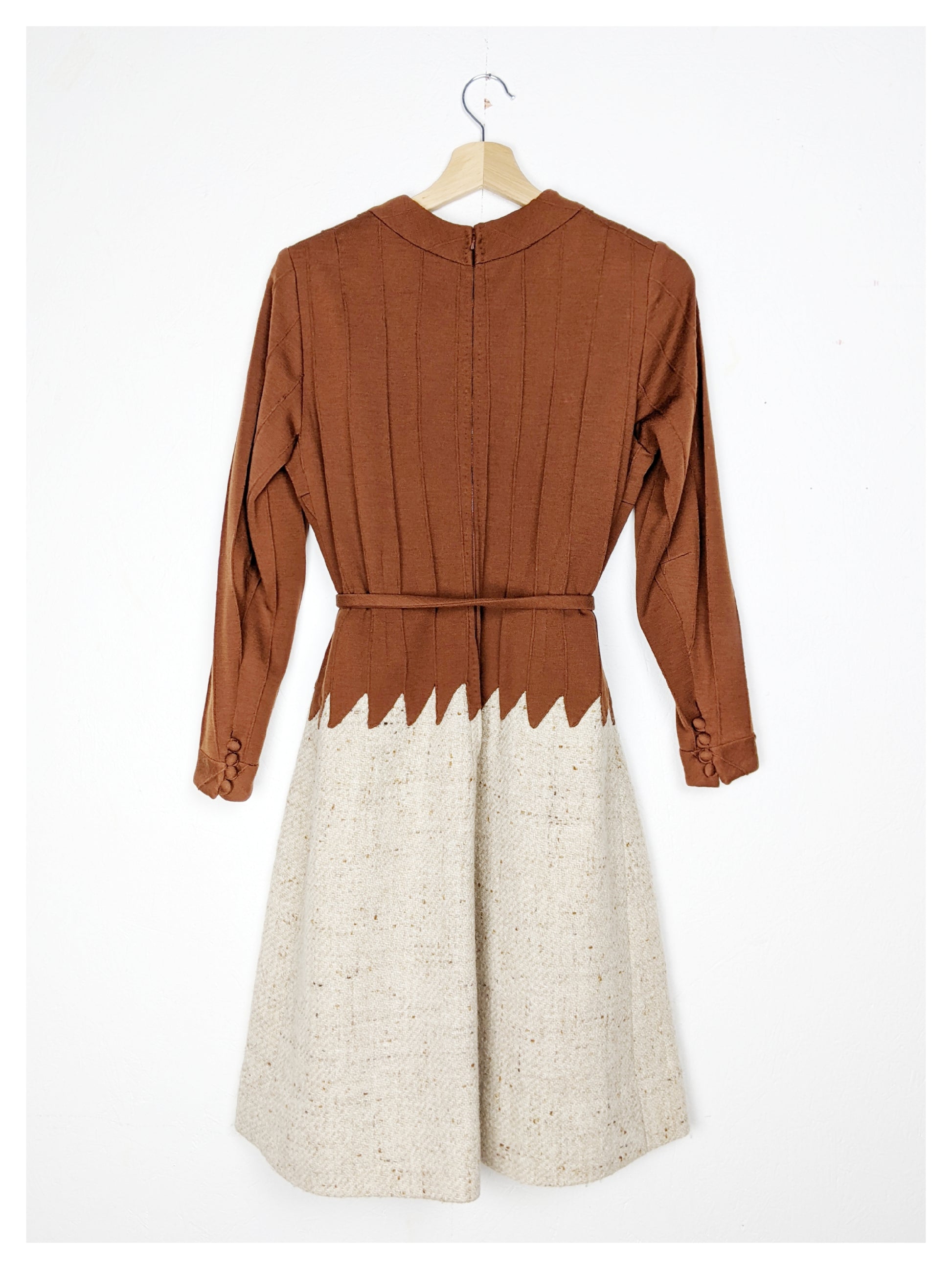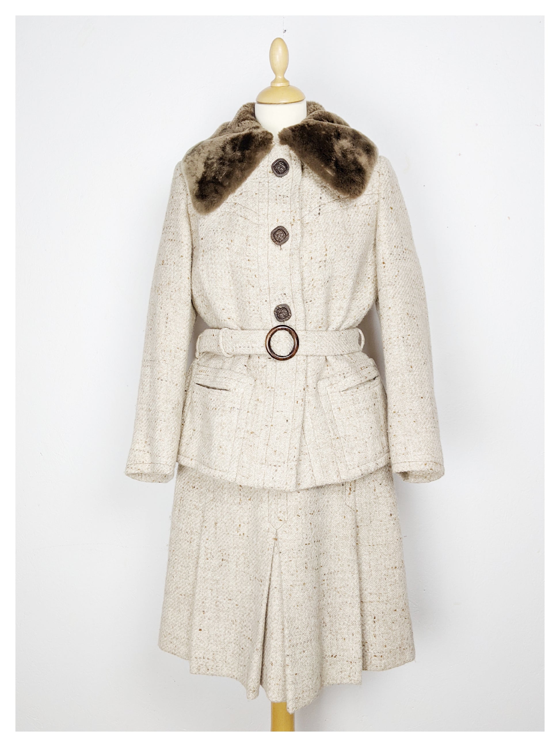 Magnifique tailleur-robe avec multiple détails. La robe est juste sublime et originale. Dans deux tissus différents. Le marron est assez épais, le second est en laine et épais également. Il est moucheté dans les tons beige, crème et marron. Le col en fourrure est extrêmement doux. L'ensemble est très chaud.