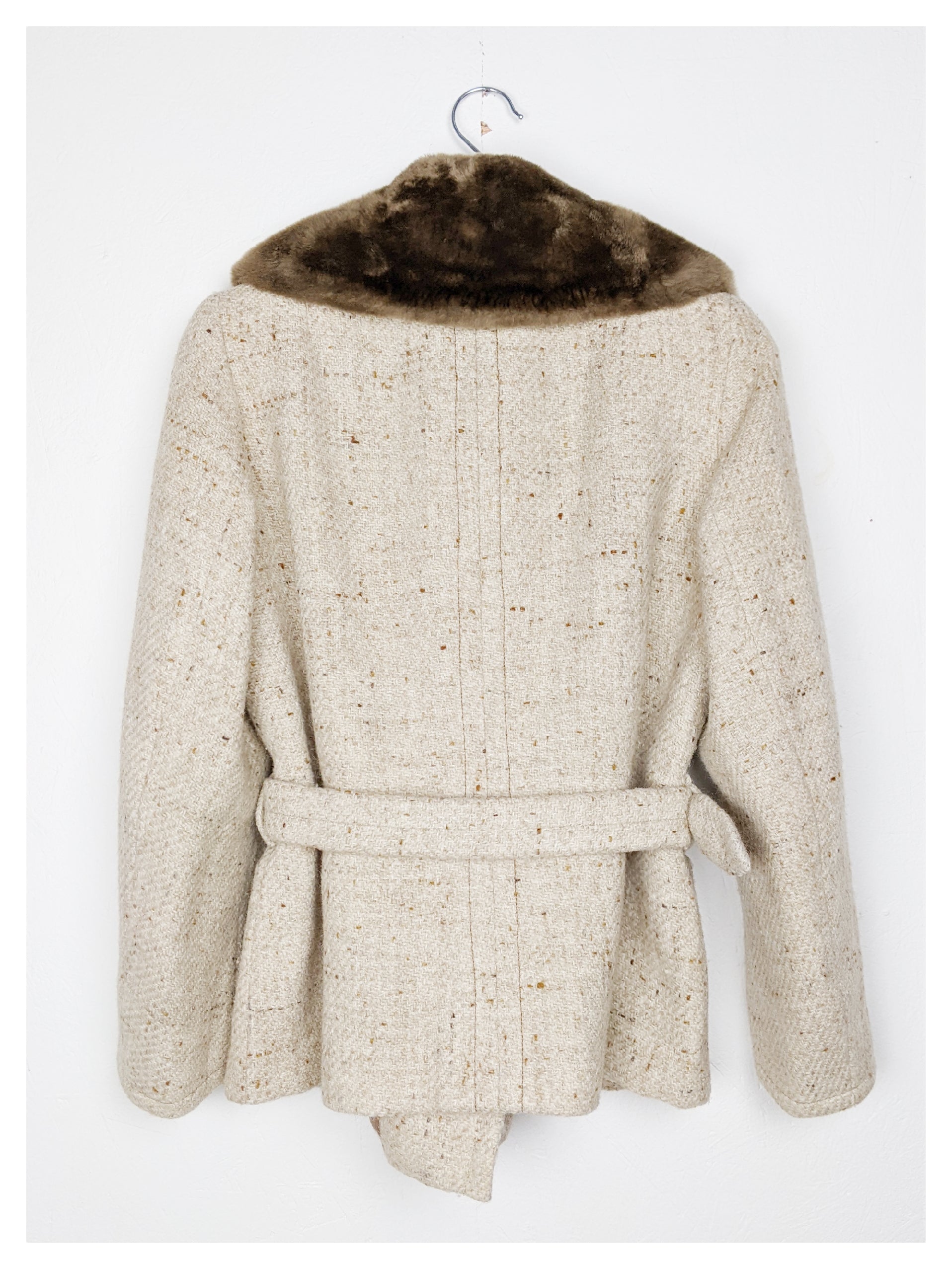 Veste / Superbe veste avec grand col en fourrure (lapin). Manches longues. Empiècement au niveau de la poitrine. Cintrée avec deux pinces à la taille. Deux passants de chaque côté, pour faire passer la ceinture assortie, avec boucle ronde en bois brun. Boutonnée jusqu'à taille, sur le devant avec trois jolis boutons bruns carrés, à motif froissé et en bois. Petit bouton supplémentaire en-dessous du col. Deux poches soufflet et plaquées de chaque côté. Entièrement doublée. Lainage assez épais. Très grand col en fourrure qui dépasse la carrure.