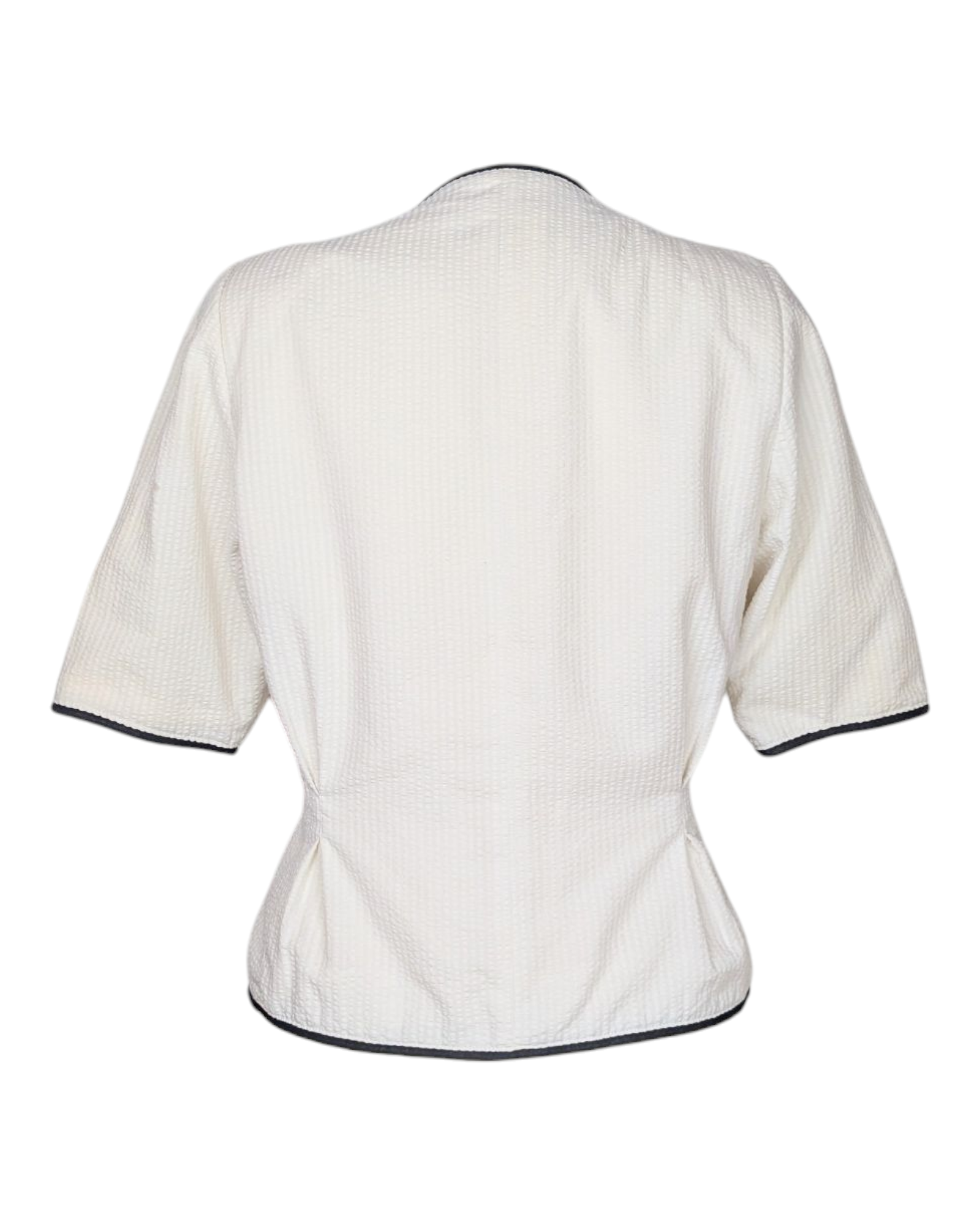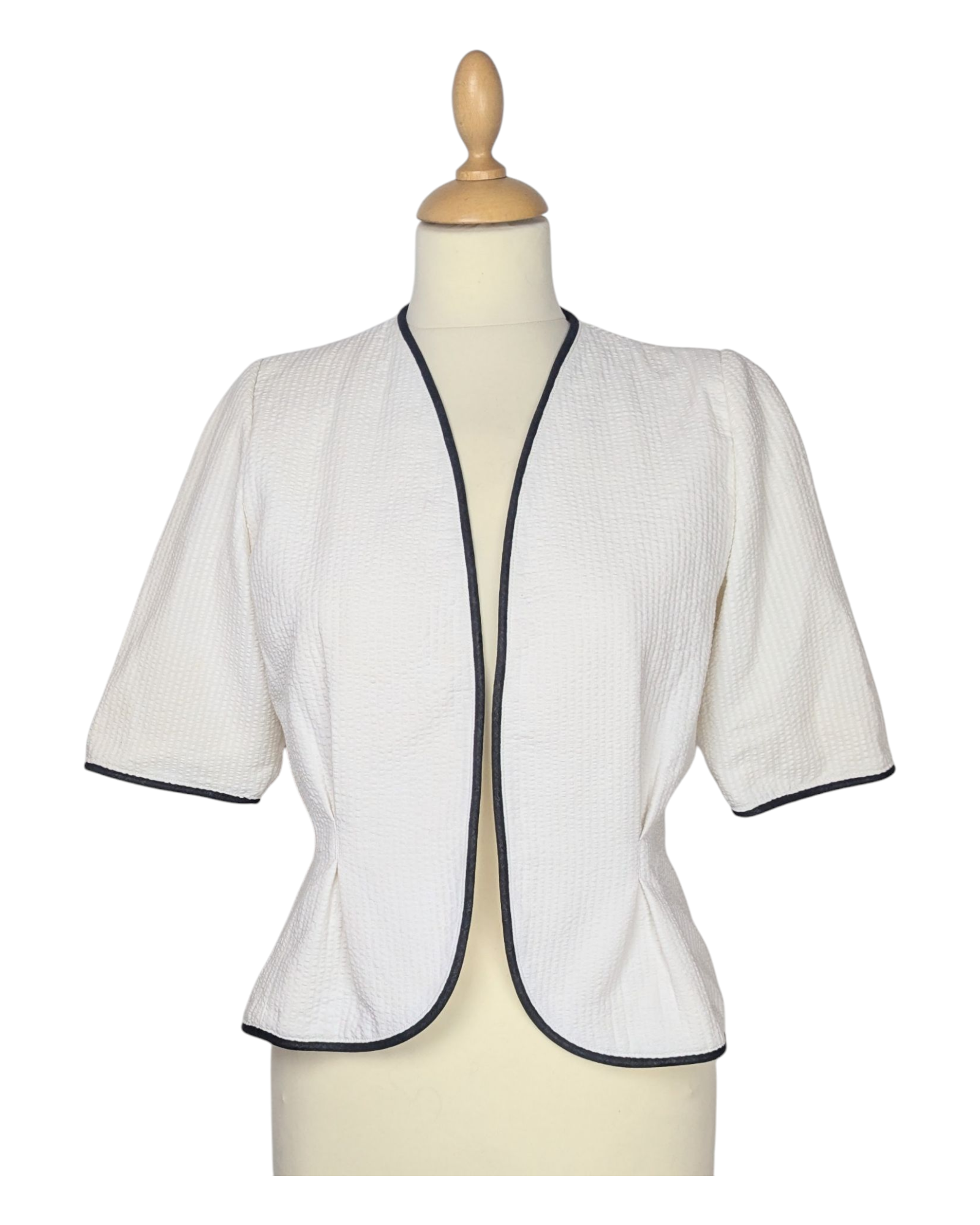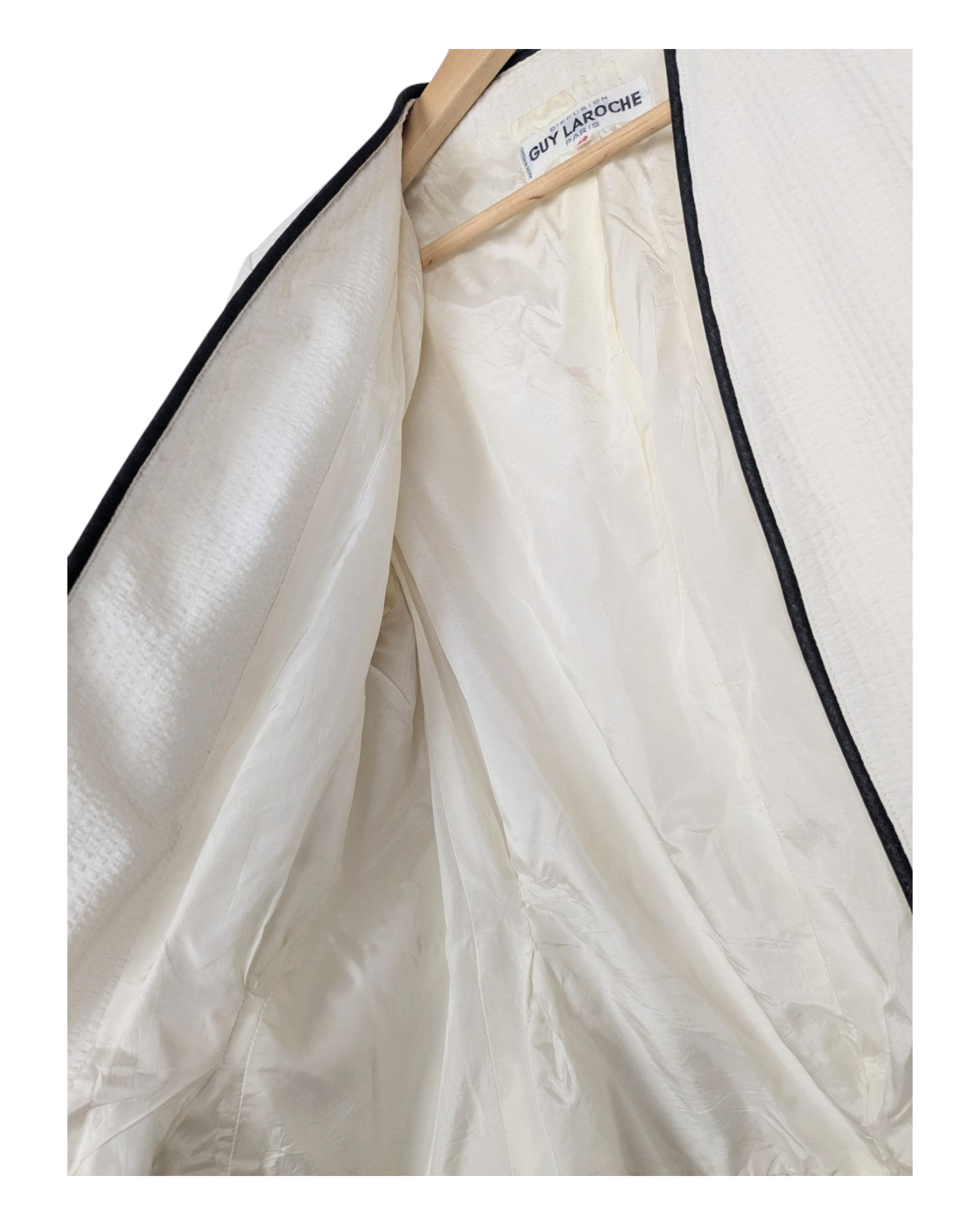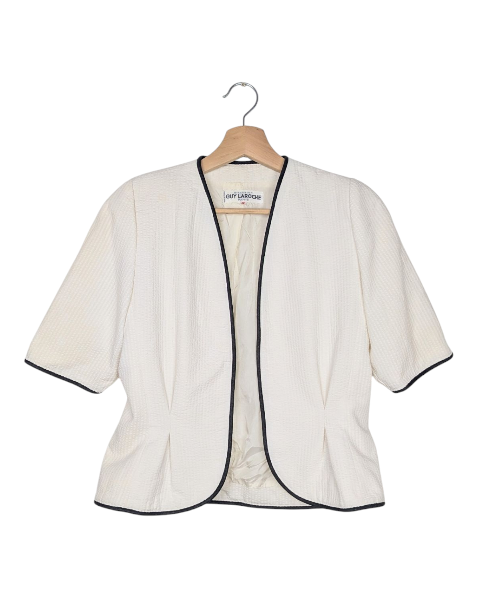 Très joli blazer Guy Laroche d'été blanc et bleu marine, légèrement à lignes. Cintré à la taille, sans fermeture. Complètement doublé. Manches courtes, légèrement ballon.