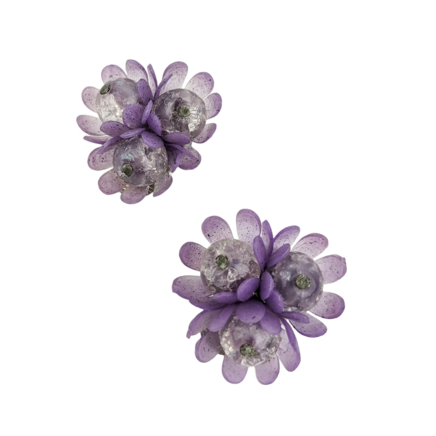 Boucles d'oreilles clips, ronde, bouquet de fleurs mauve, avec perles irisées. En plastique.