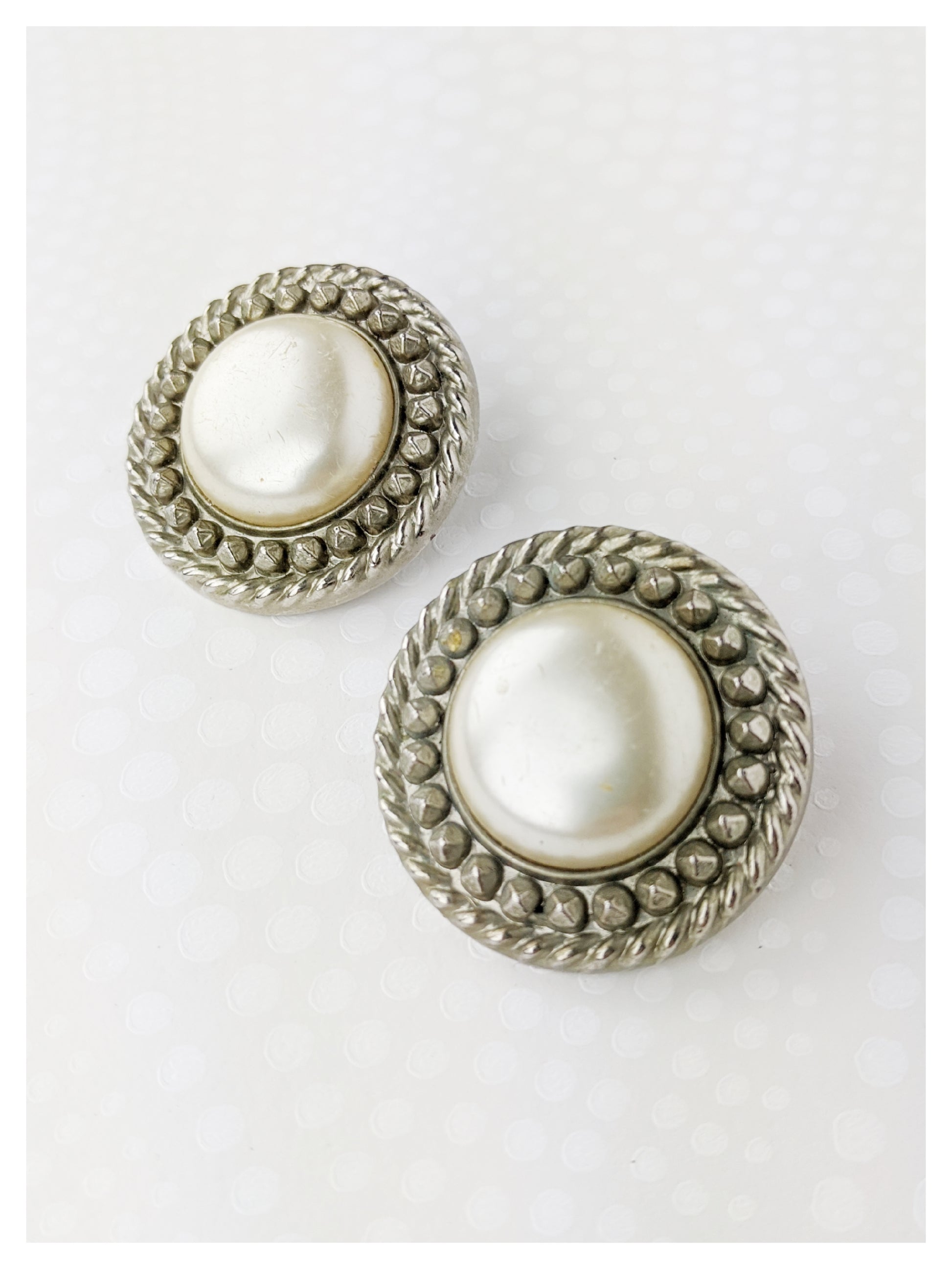 Boucles d'oreilles rondes. Demi-sphères centrales nacrées. Attaches "clips". En plastique.