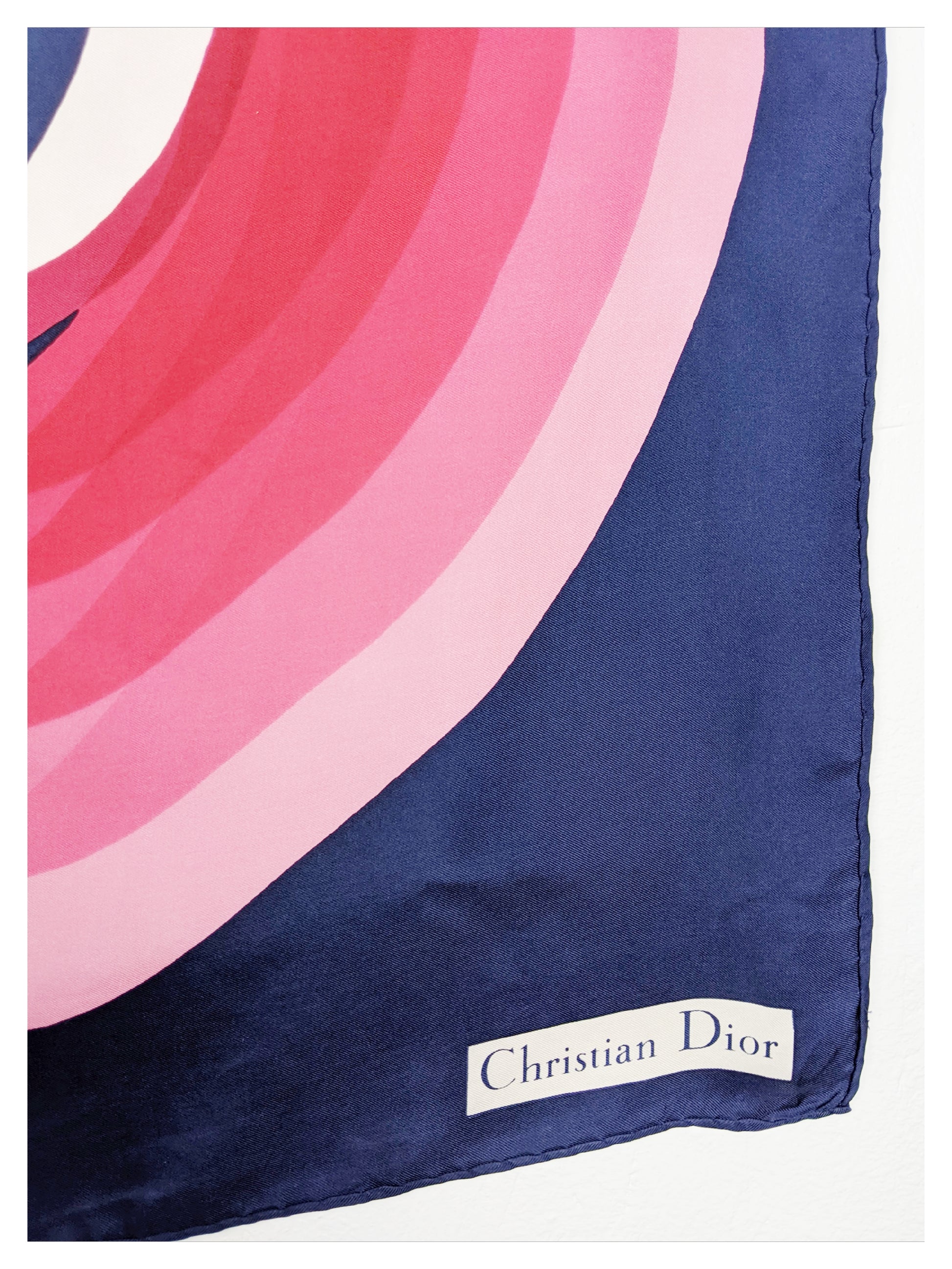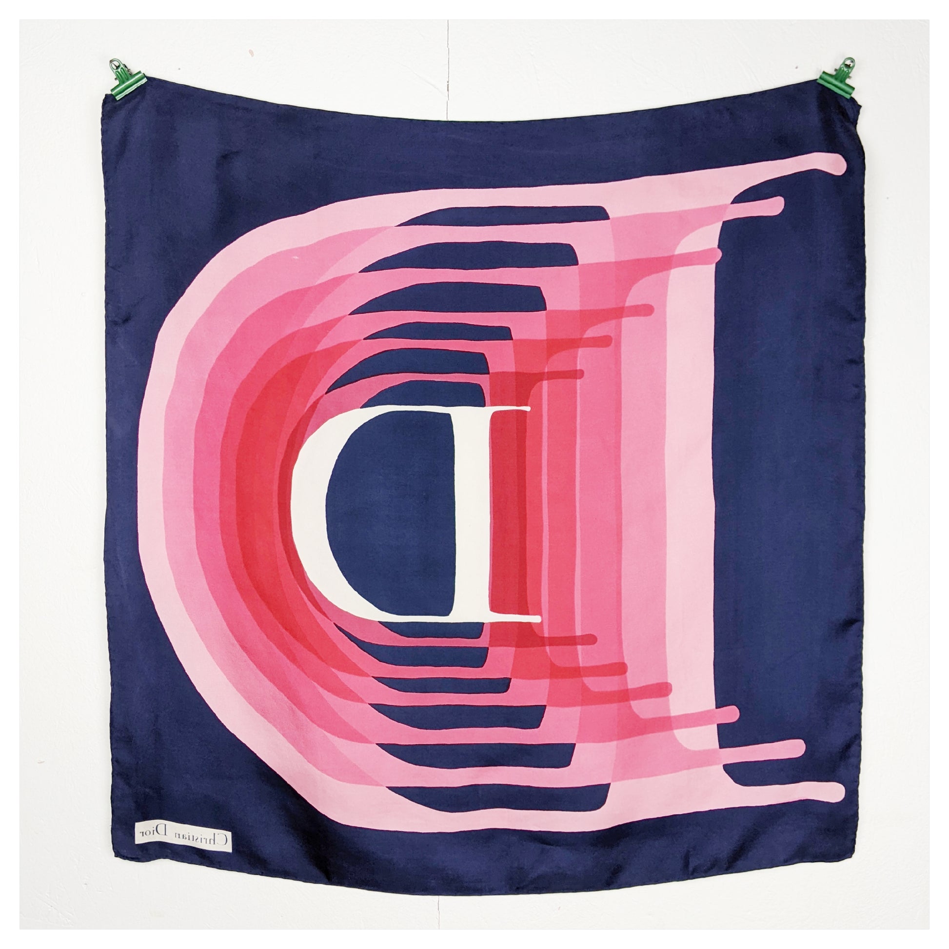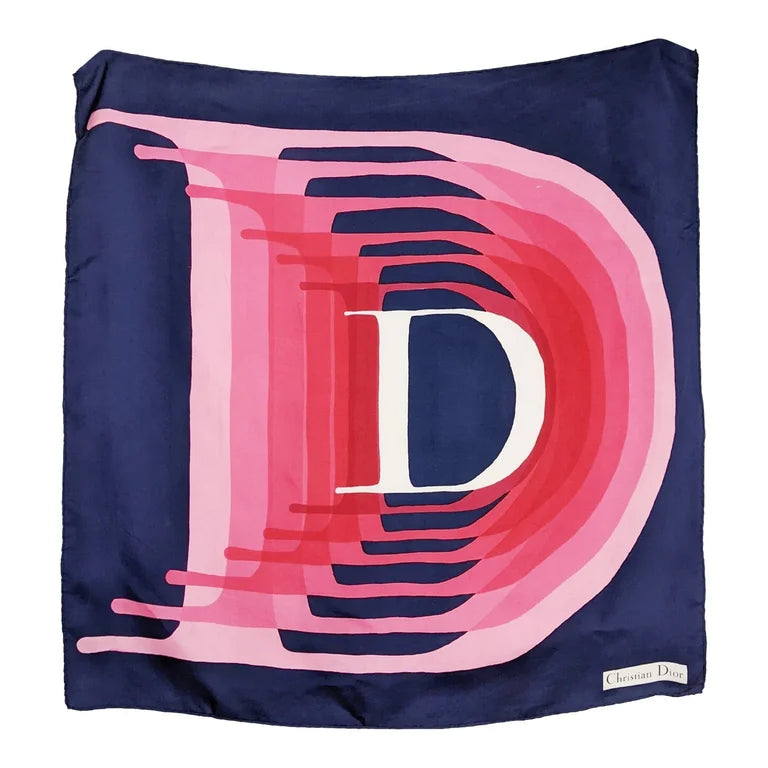 Carré de soie imprimé D, comme Dior, bleu, rose, rouge. Monogramme. Ourlet roulé, cousu à la main. Une pièce phare de la maison Dior
