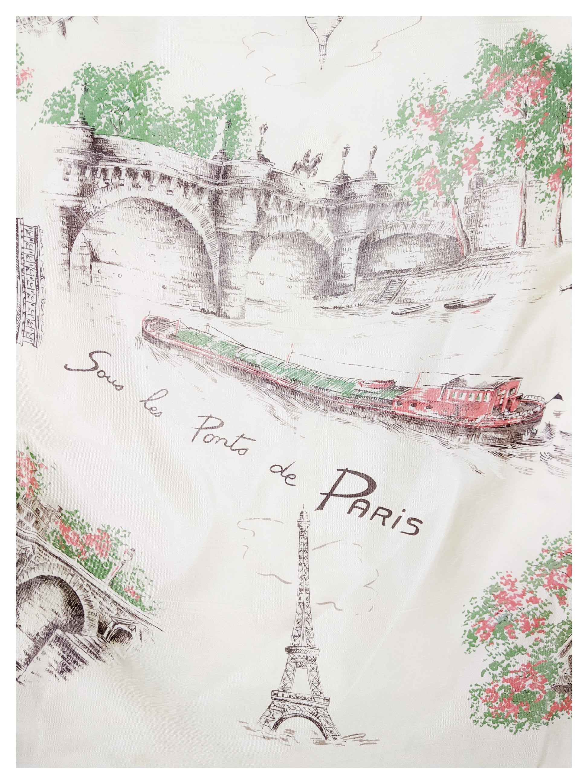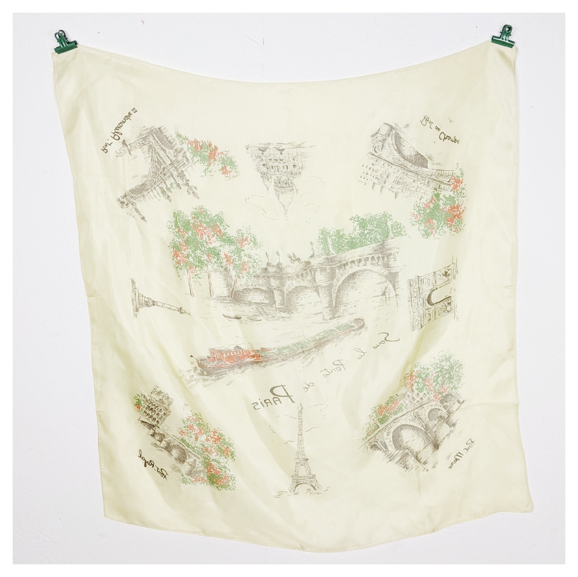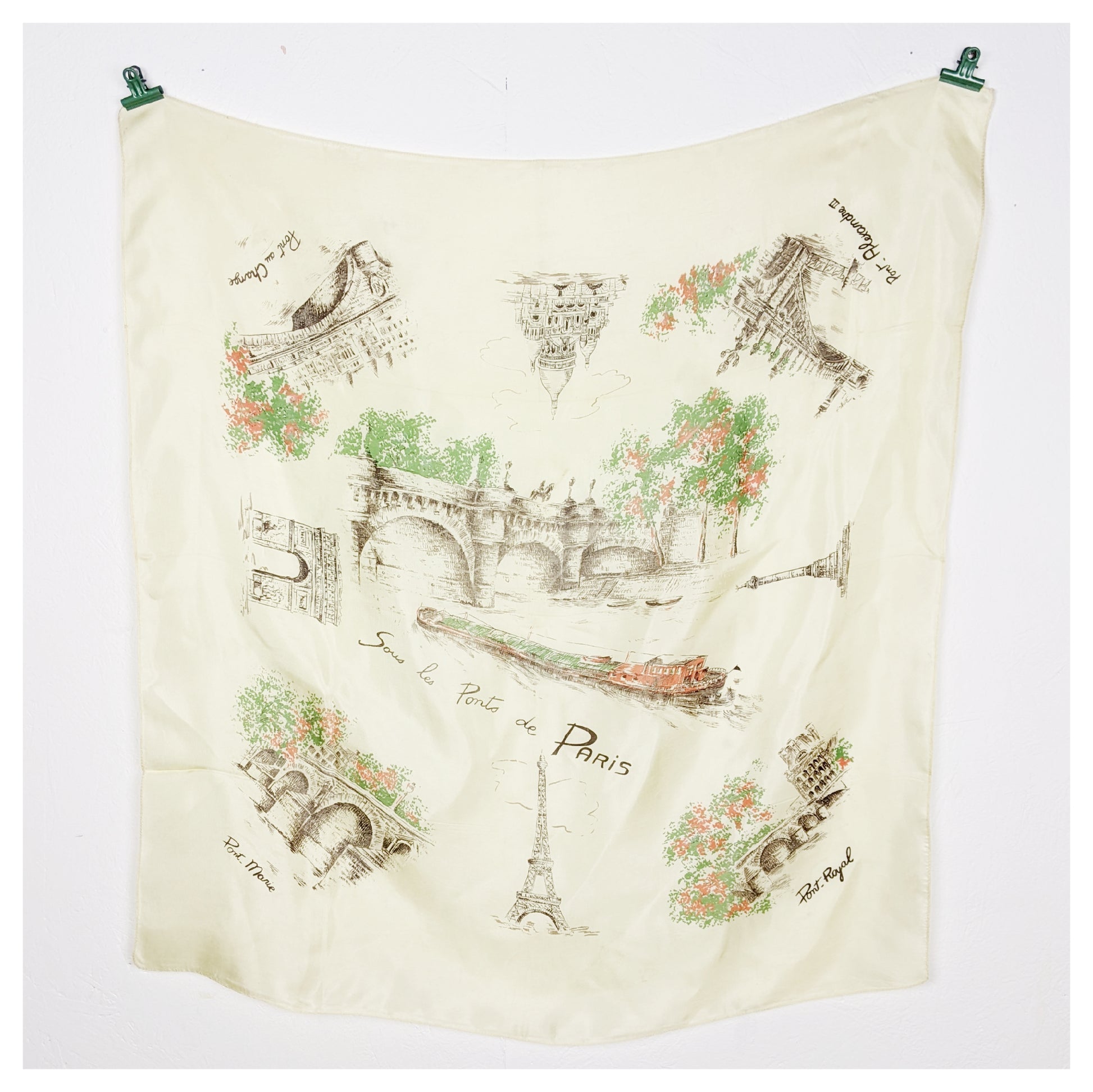 Foulard carré à l'effigie des monuments "Sous les ponts de Paris". Dans les tons jaune poussin, orange, vert et marron. Très romantique. Quelques petits signes d'usure vu son âge.