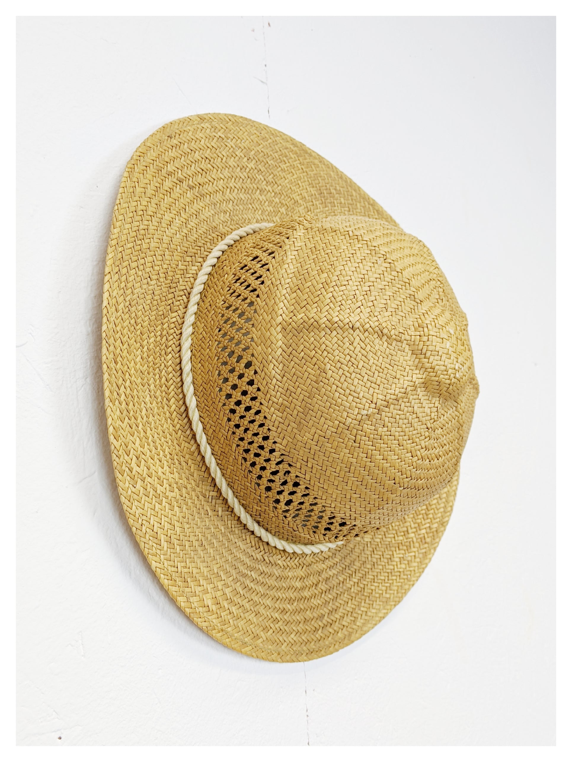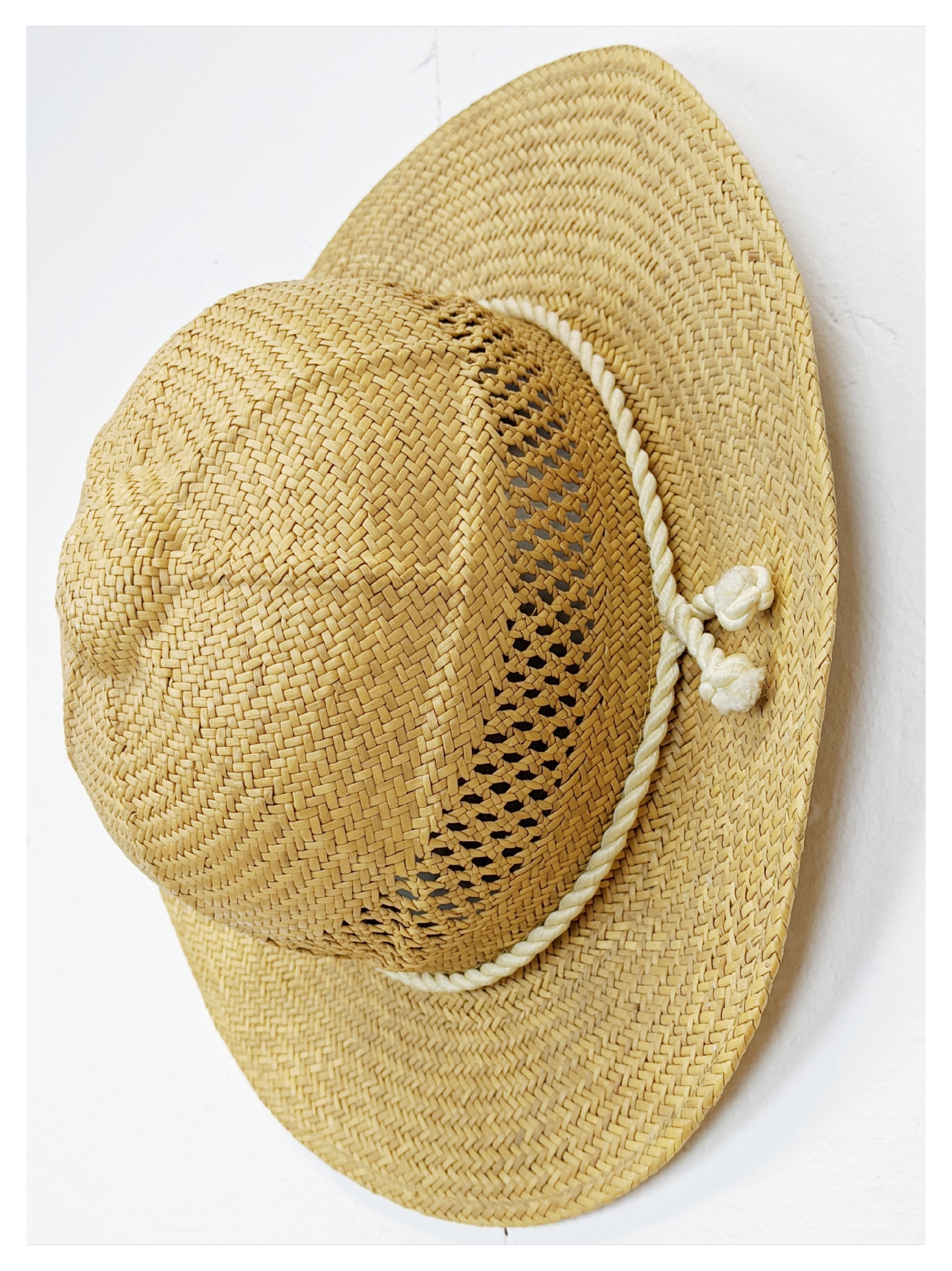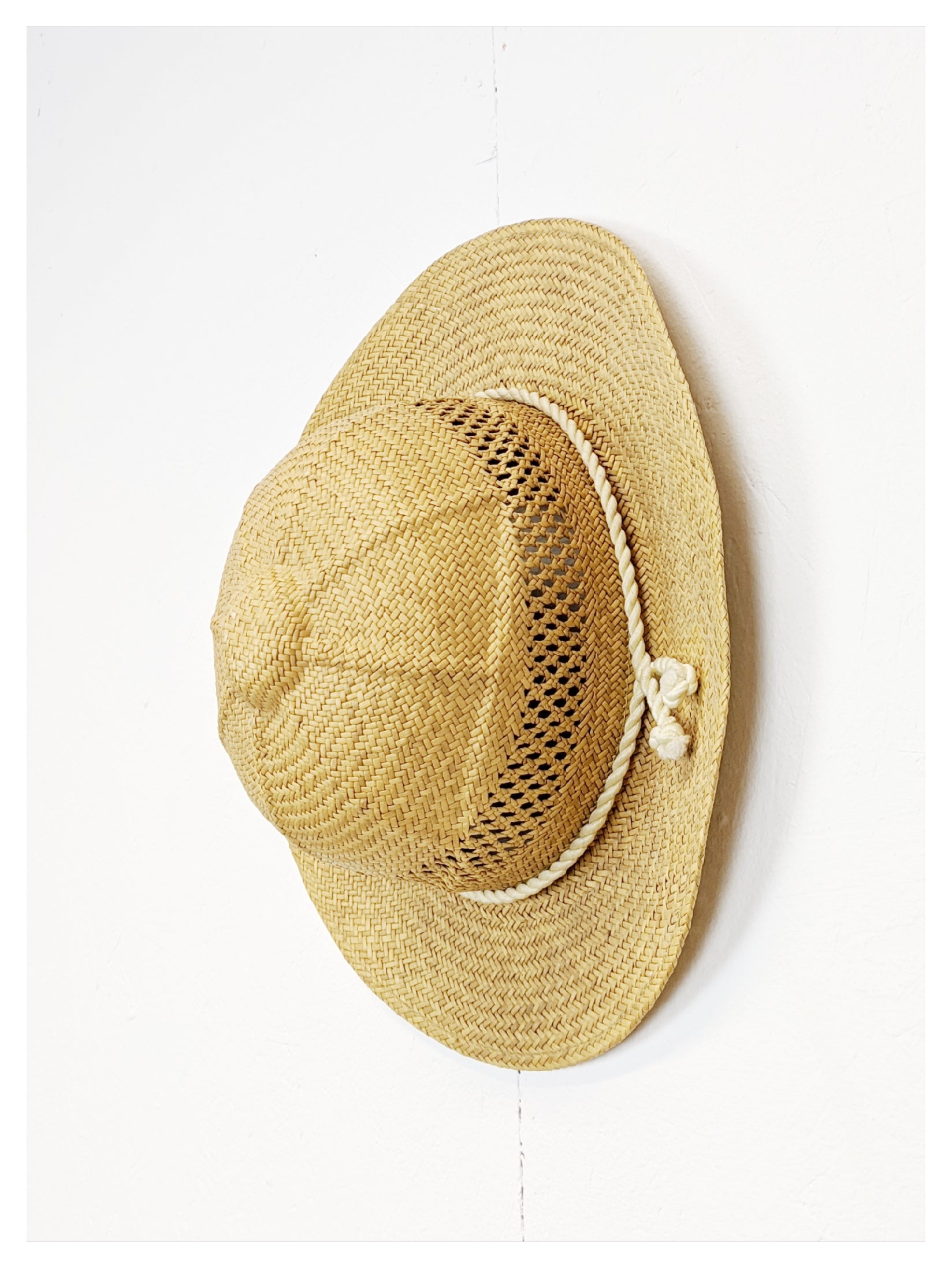 Chapeau rond et bombé, original, en osier tressée. Avec cordon torsadé et motifs embossés. Jamais porté.