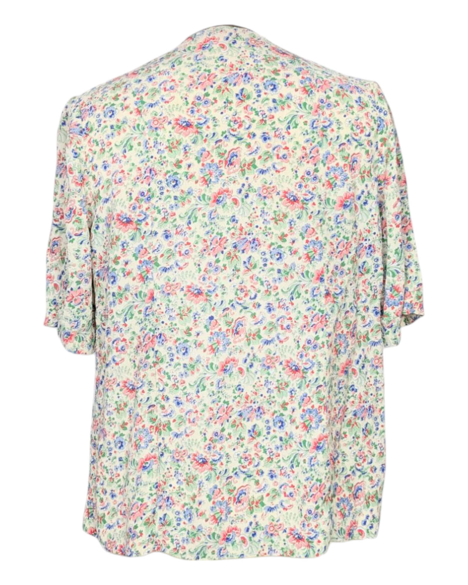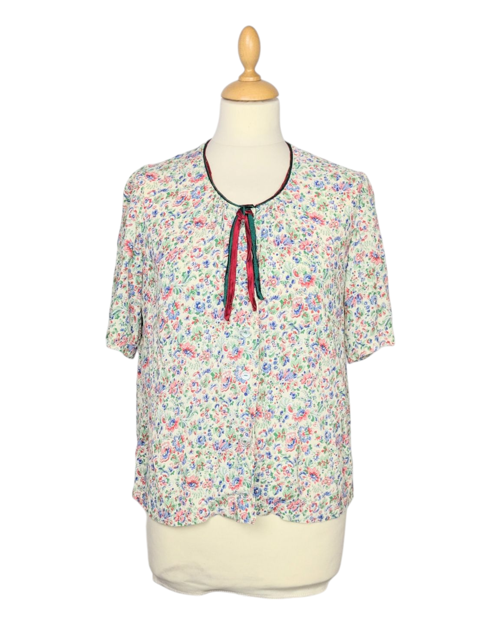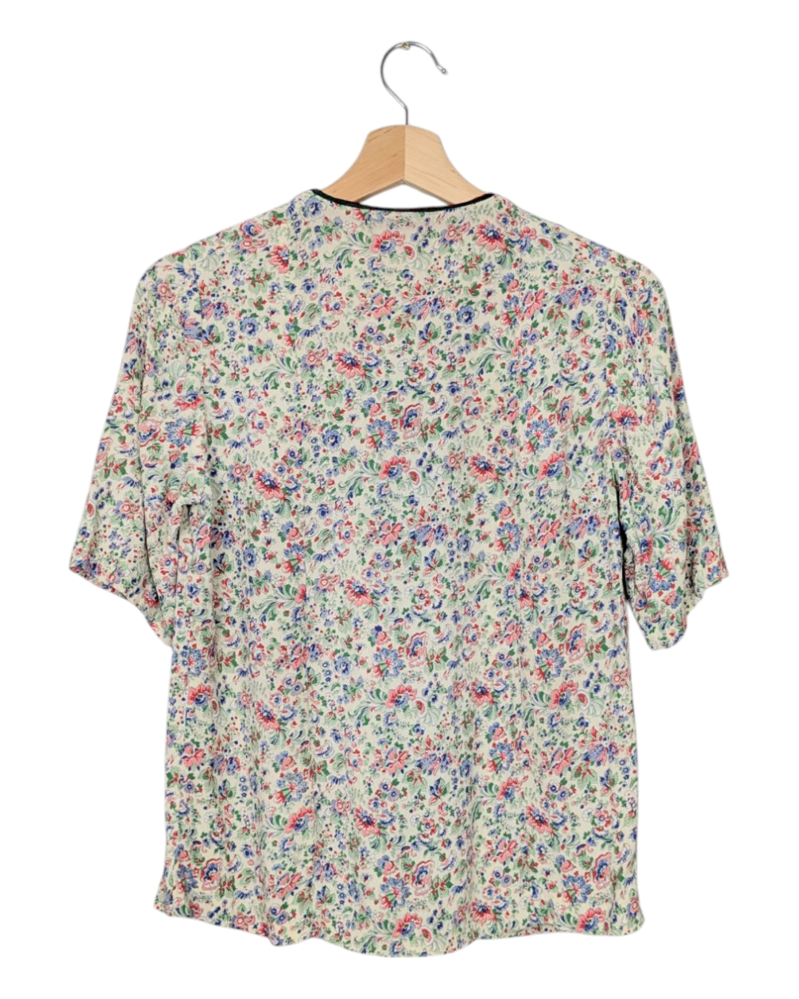 Très beau chemisier à manches courtes en crêpe légèrement élastique. Motifs de fleurs avec joli détail au col. Très beaux boutons. Un coup de coeur.