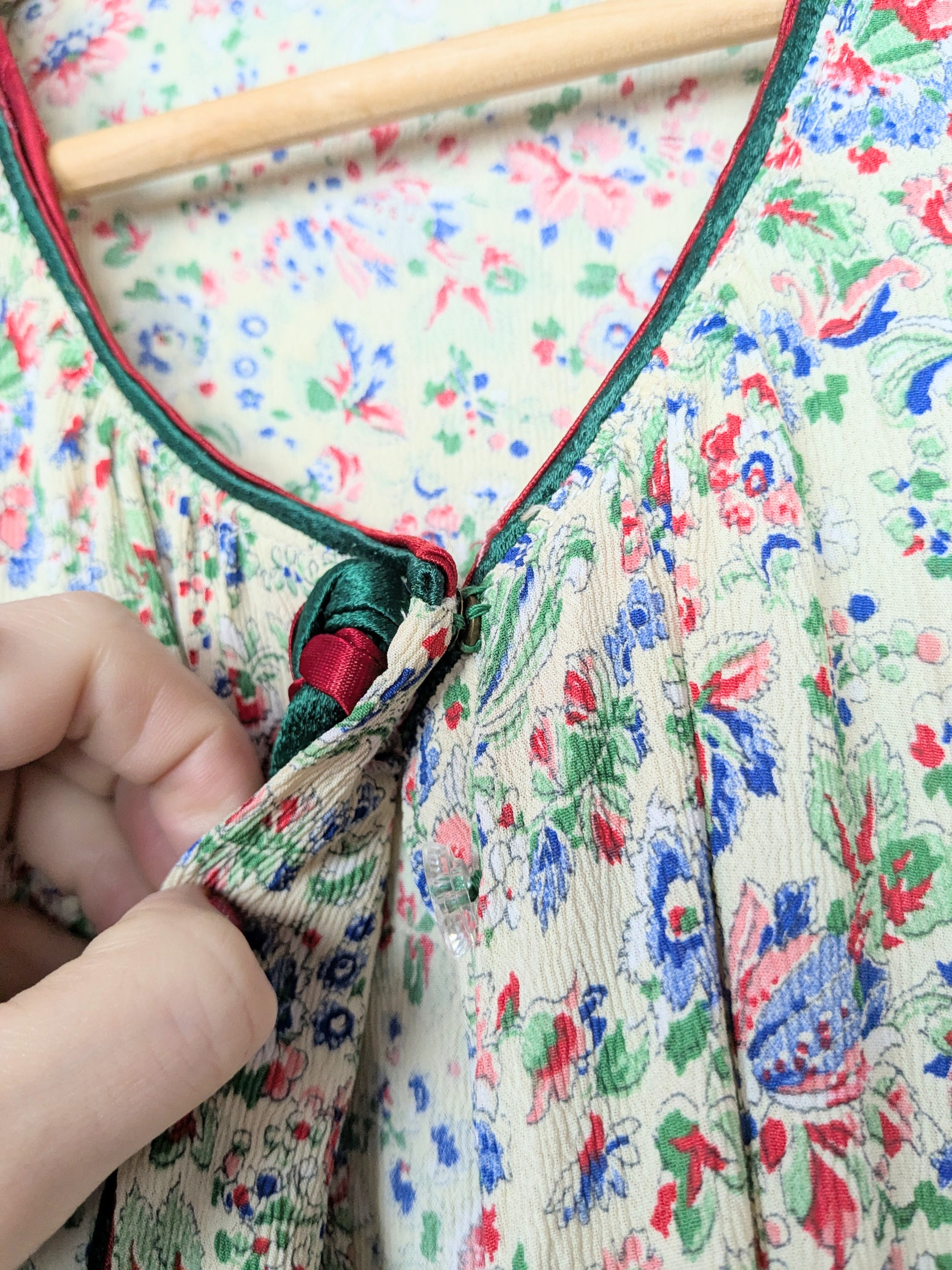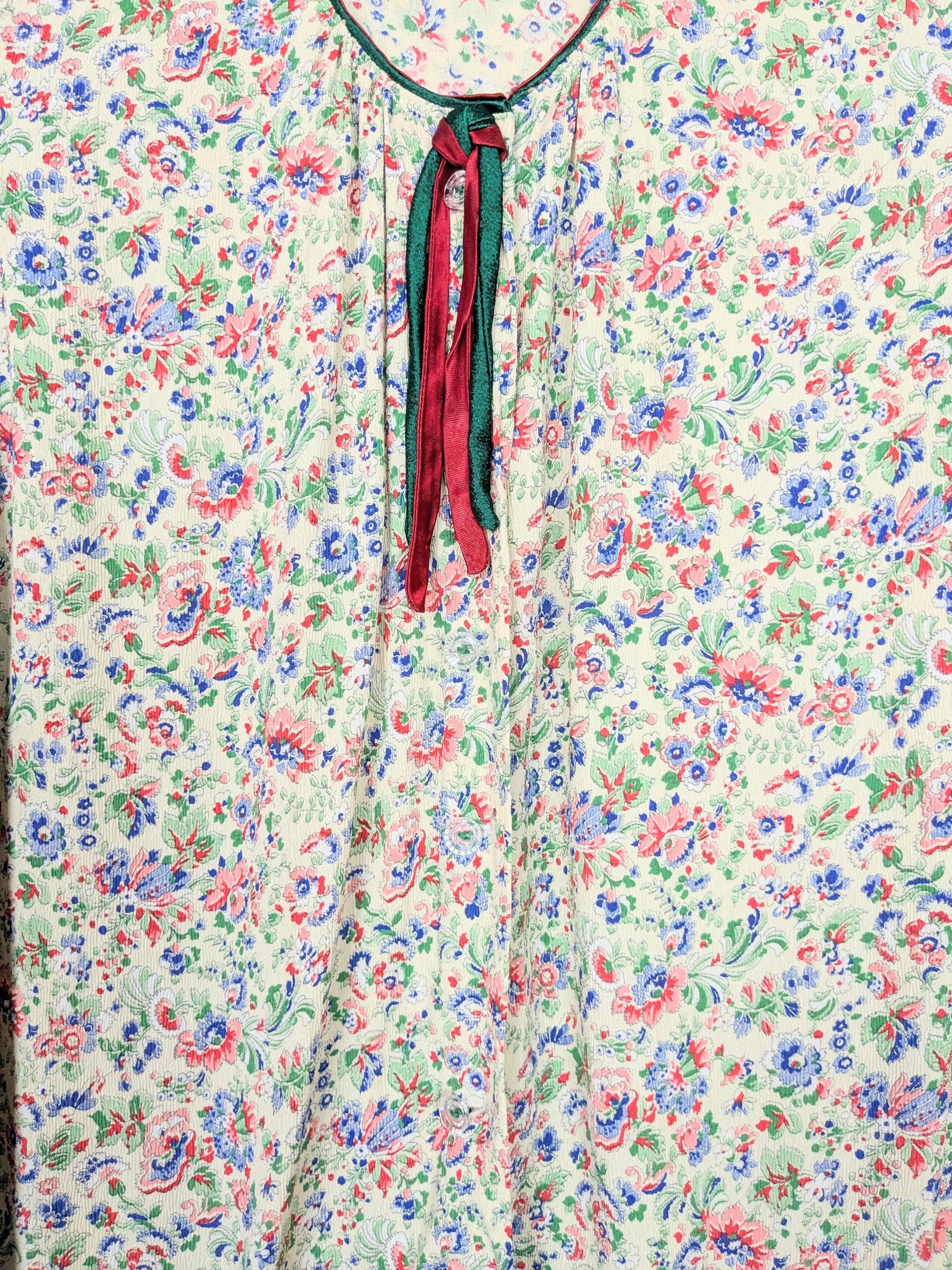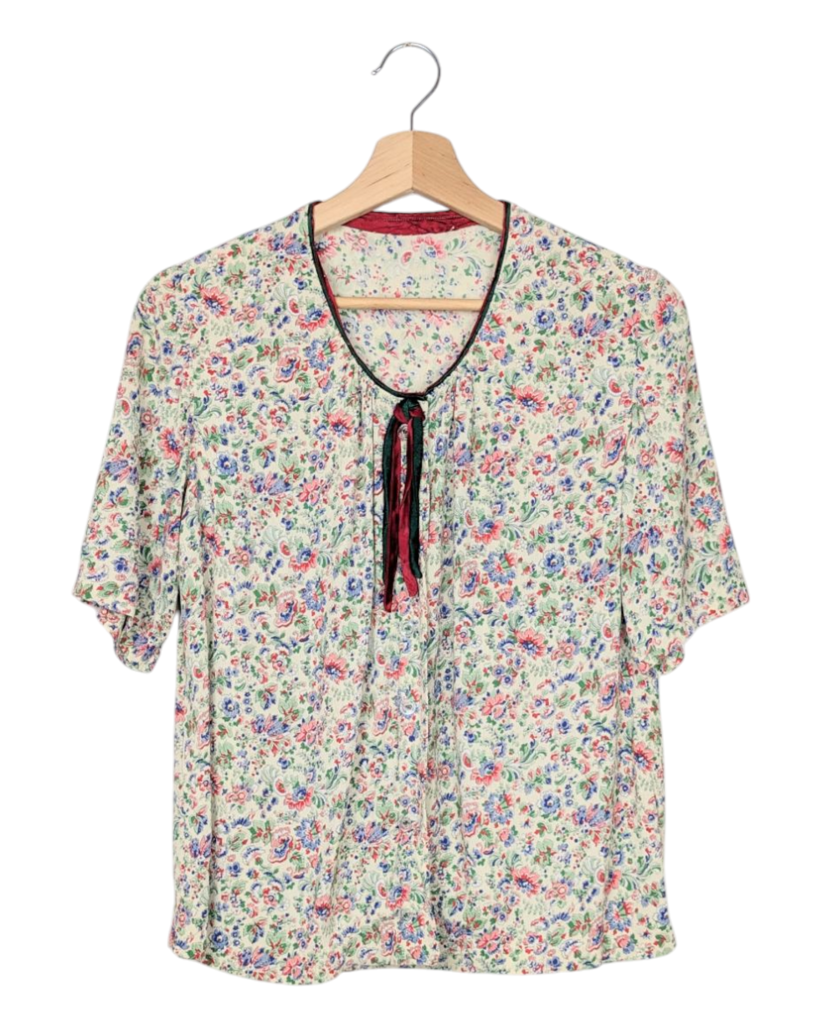 Très beau chemisier à manches courtes en crêpe légèrement élastique. Motifs de fleurs avec joli détail au col. Très beaux boutons. Un coup de coeur.