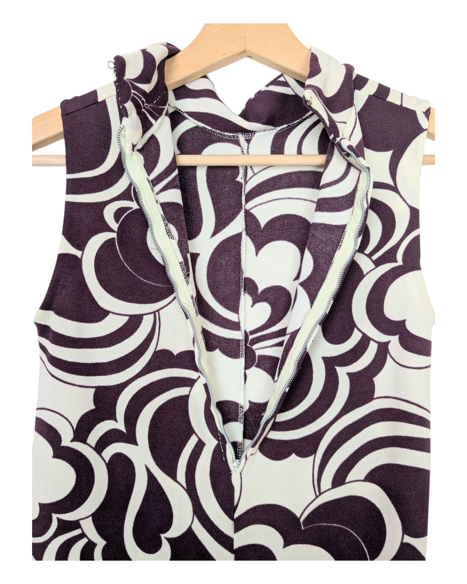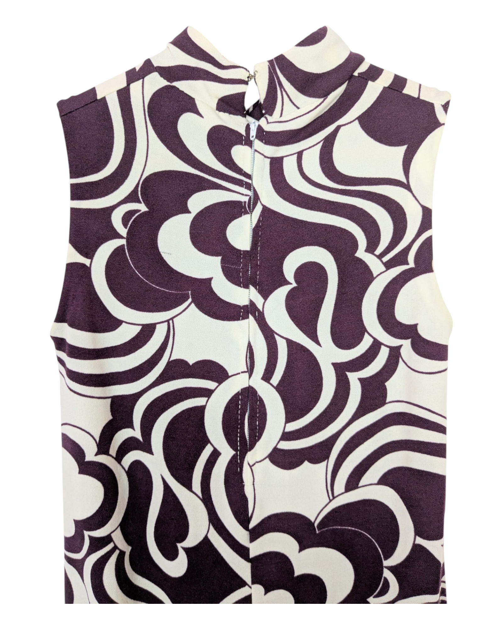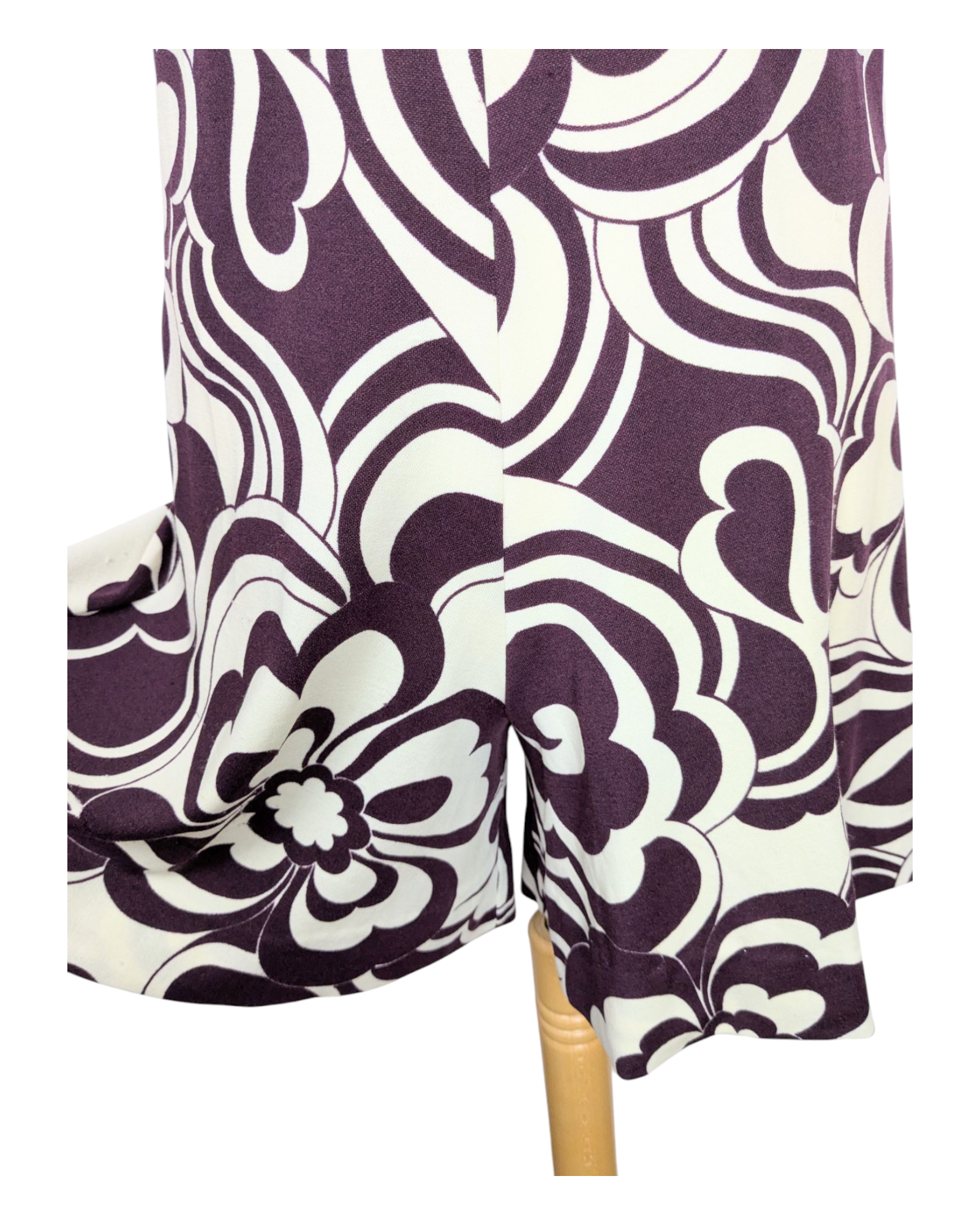 Une superbe pépite rare. Une combinaison short très élégante avec col montant. Tissu ajustable avec imprimé arabesque pourpre. MAGNIFIQUE et tellement moderne. Psychédélique à souhait.