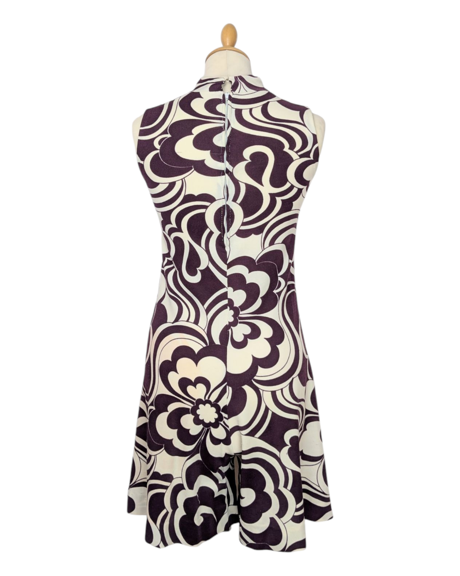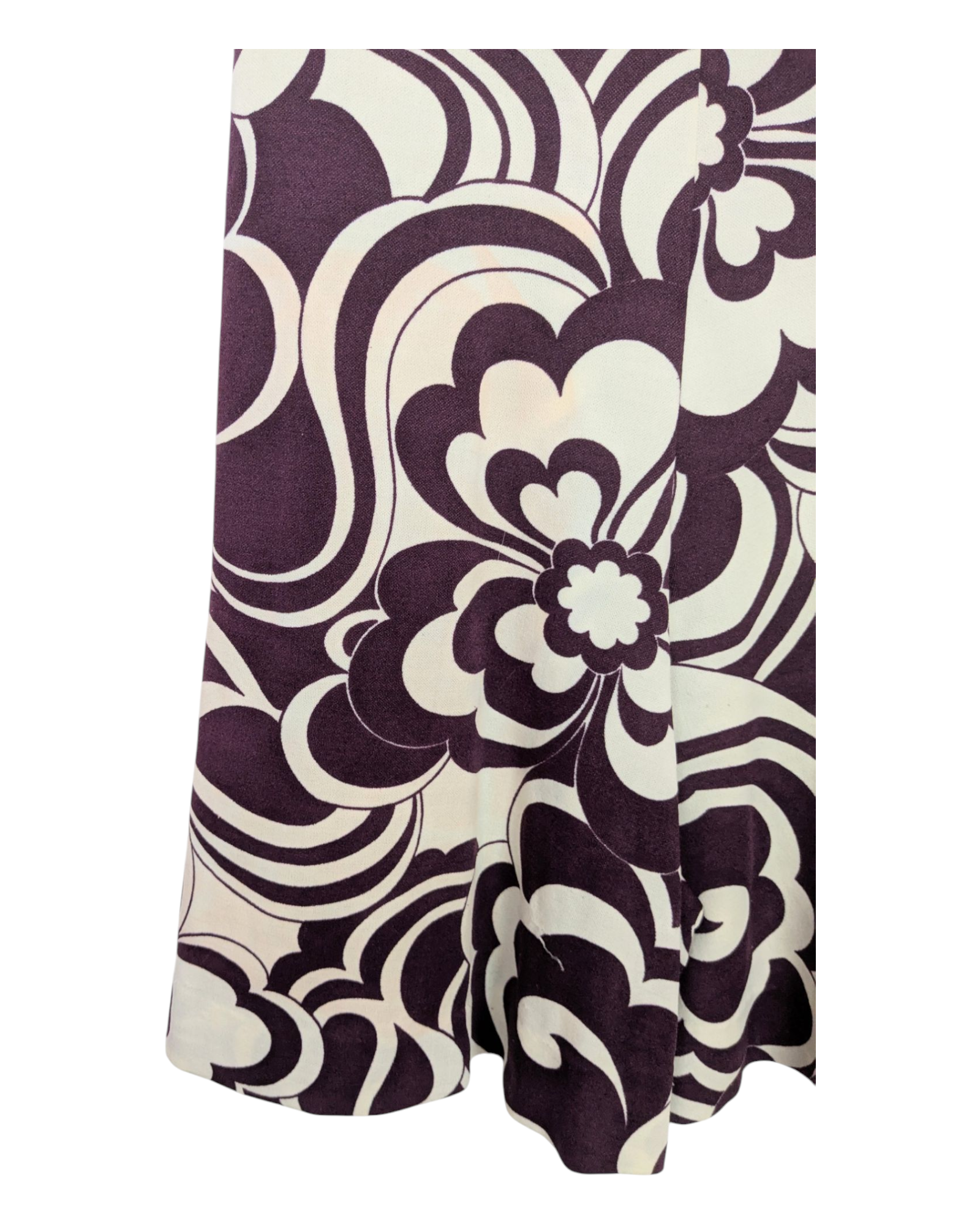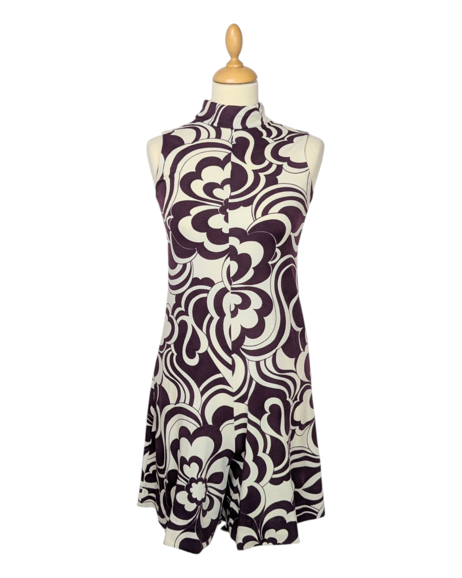 Une superbe pépite rare. Une combinaison short très élégante avec col montant. Tissu ajustable avec imprimé arabesque pourpre. MAGNIFIQUE et tellement moderne. Psychédélique à souhait.
