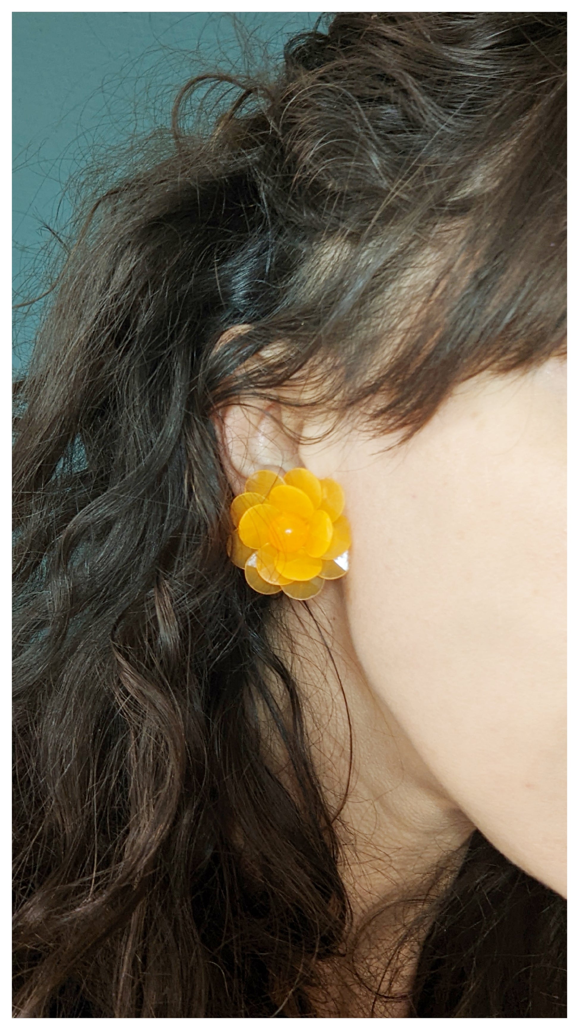 Boucles d'oreilles clips, ronde, fleurs à gros sequins oranges. En plastique.