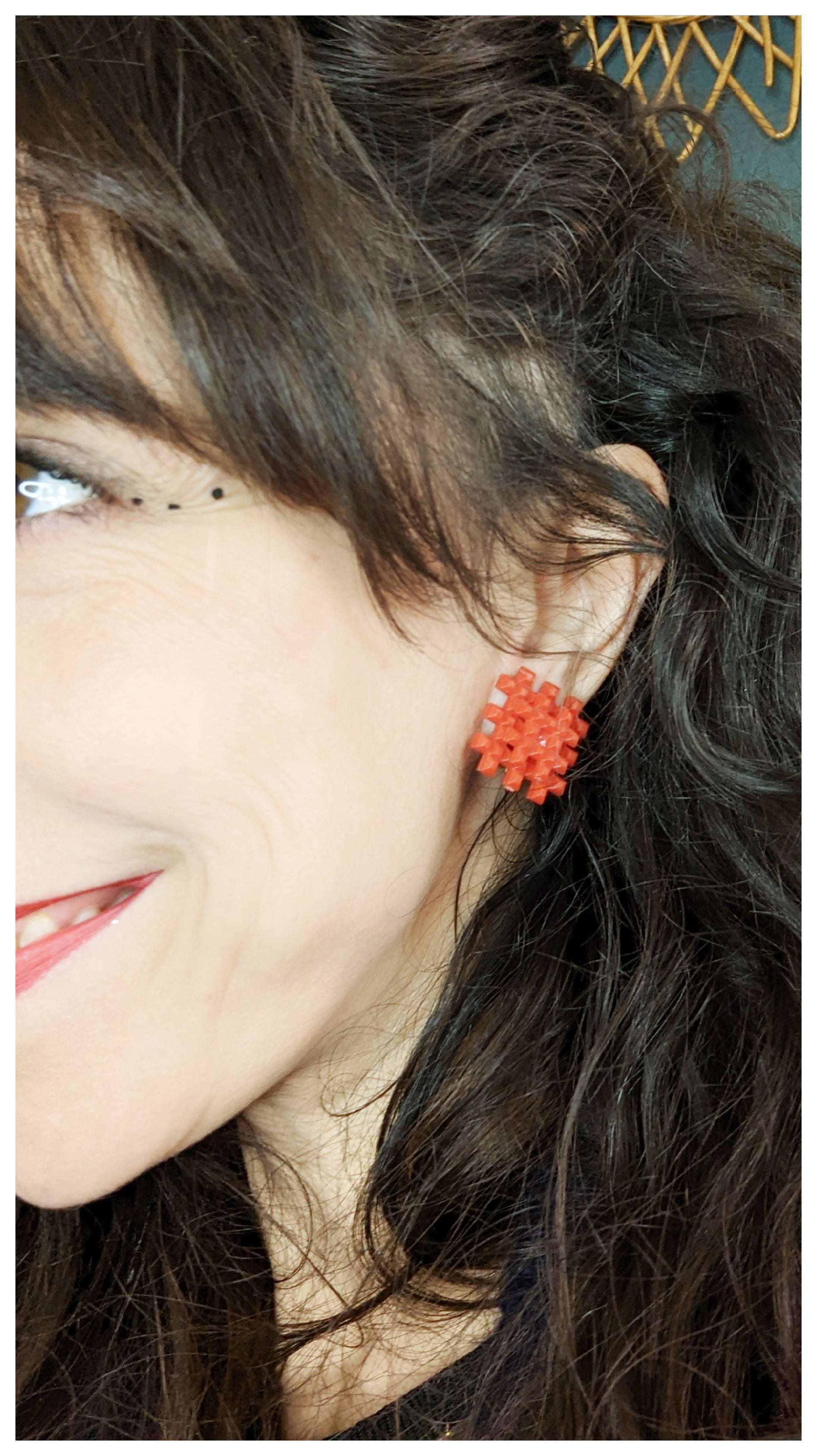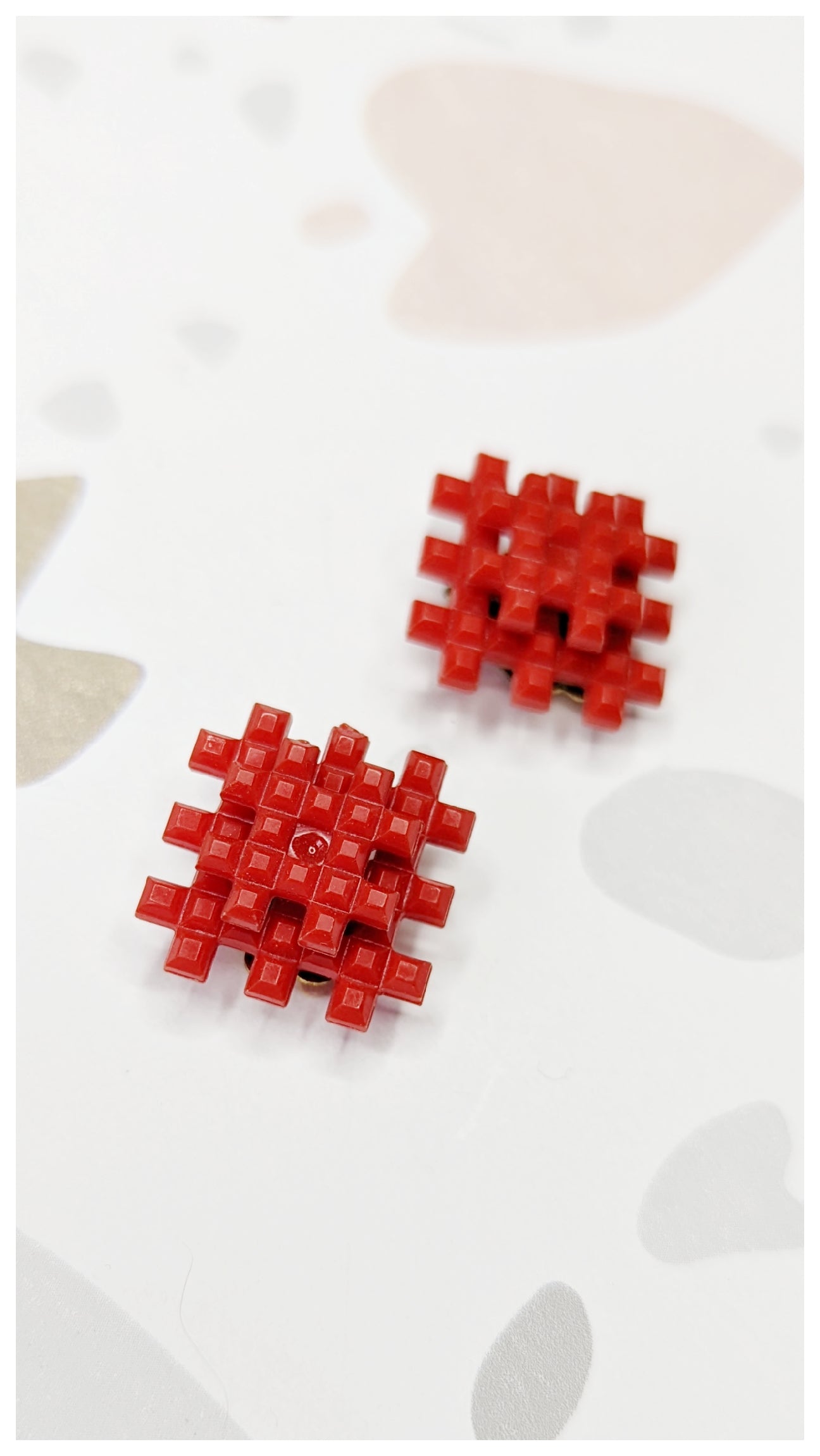 Boucles d'oreilles clips, carré "tétris" rouge en relief, plastique. Mes chouchoutes !