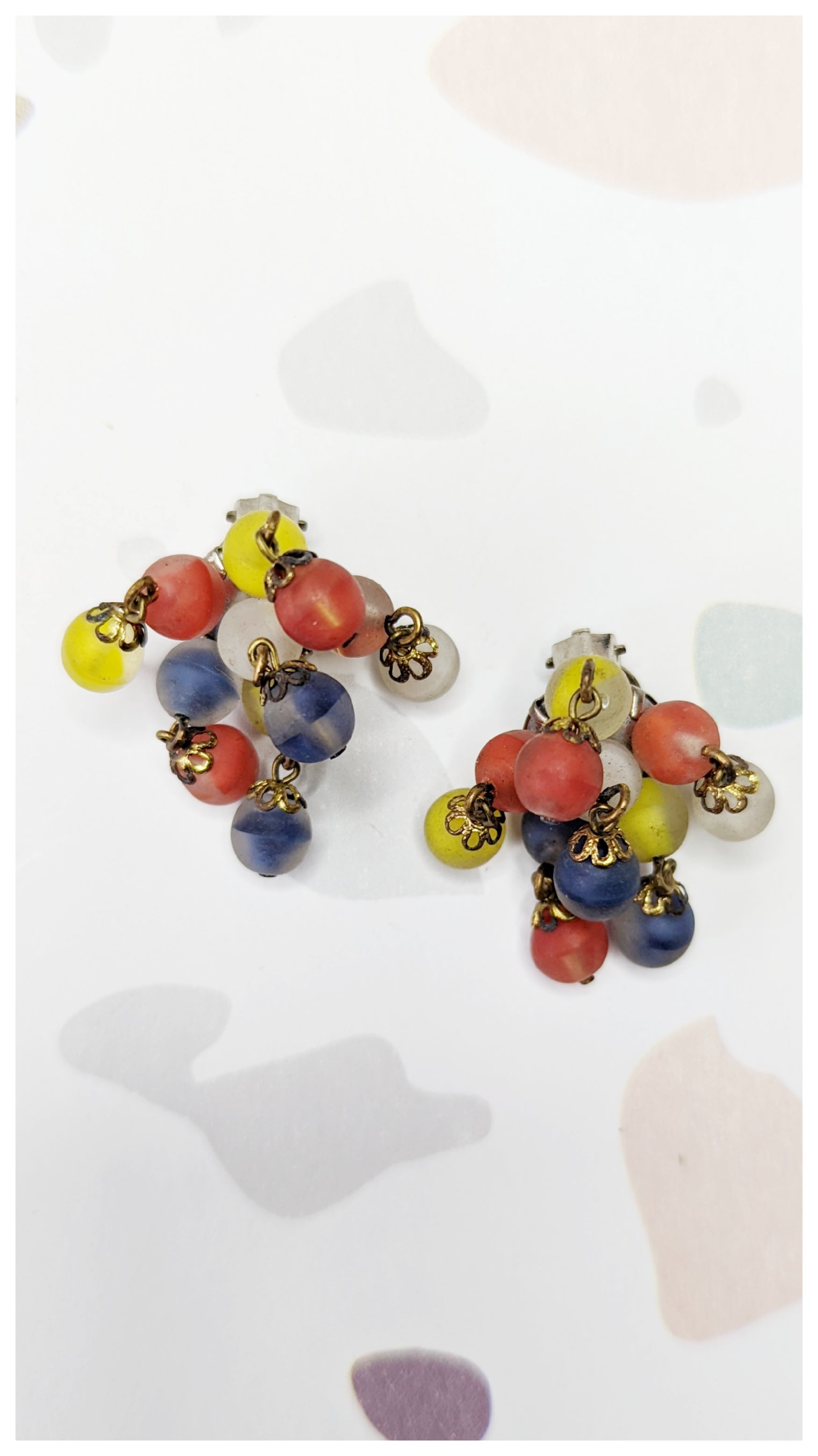 Boucles d'oreilles multicolore bleu jaune blanc rouge à perles en grappe, clips. En verre, un peu lourde mais tiennent bien à l'oreille.
