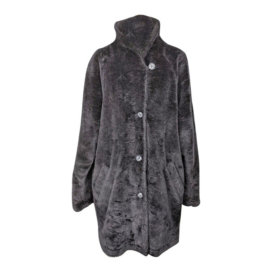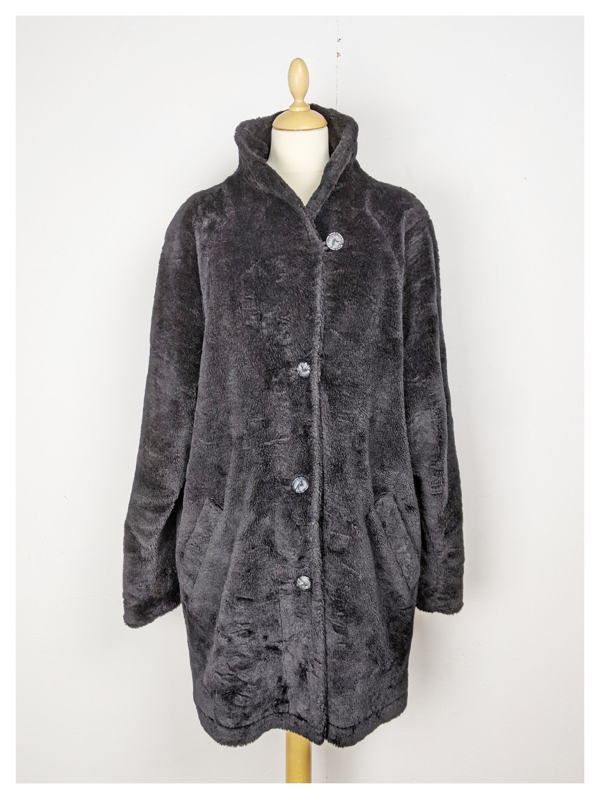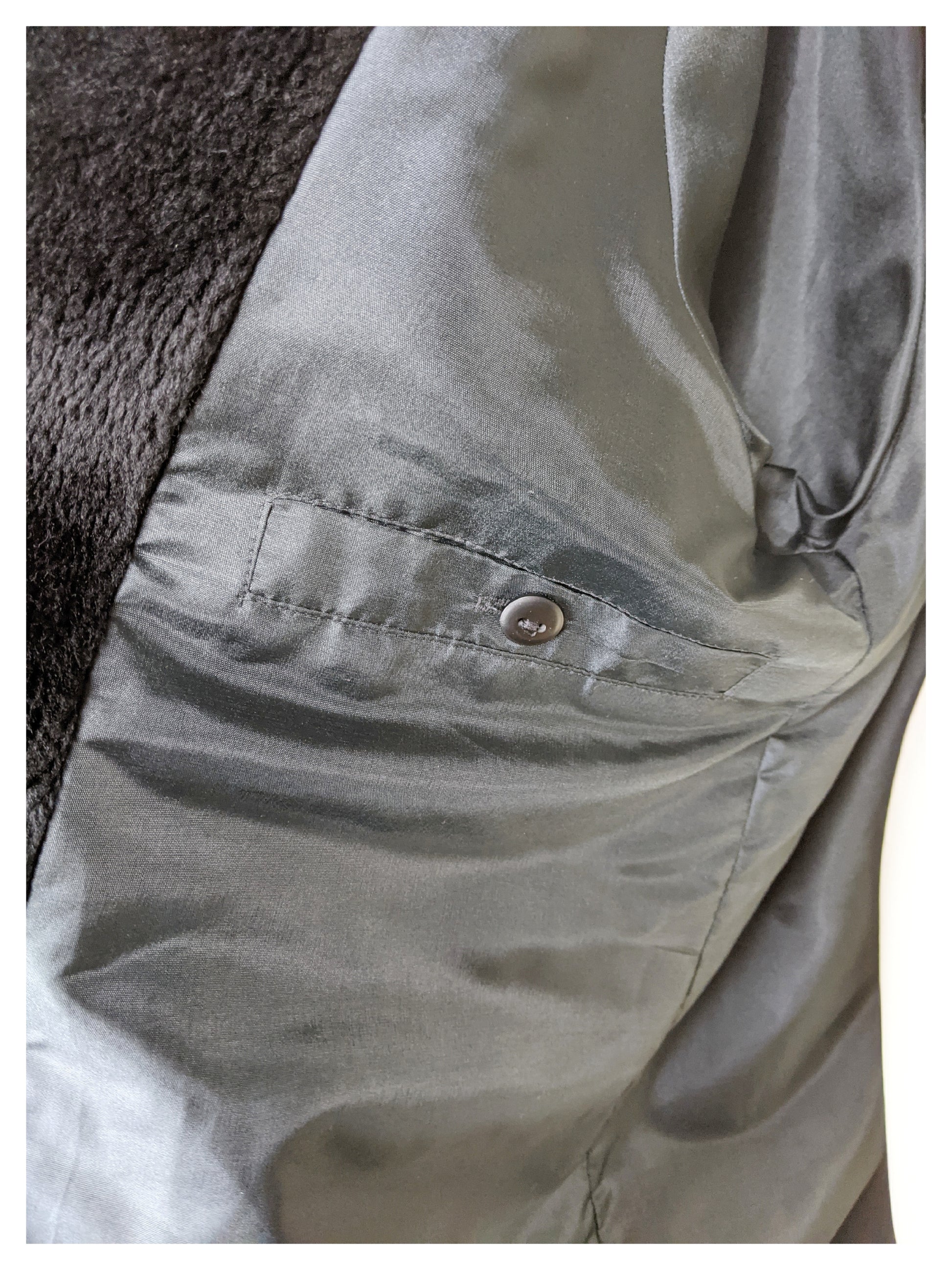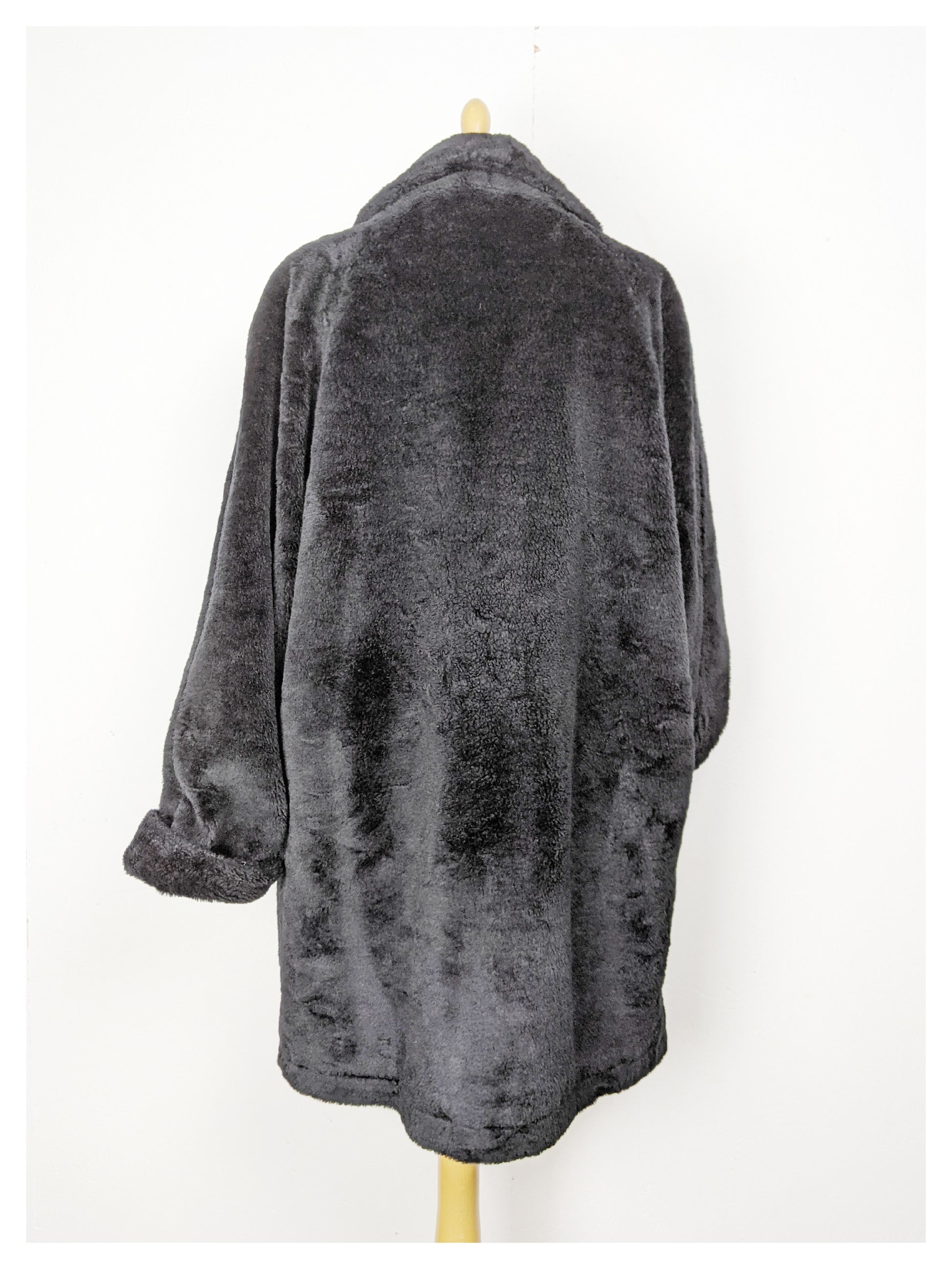 Très joli manteau en fourrure noire synthétique. Coupe droite, col châle avec une lichette au col et un bouton en dessous pour le boutonner. Boutonnage sur le devant grâce à 3 gros jolis boutons noirs. Manches raglan, légèrement chauffe-souris. Deux petites épaulettes (dans la doublure). Une poche portefeuille à l'intérieur. Entièrement doublé.