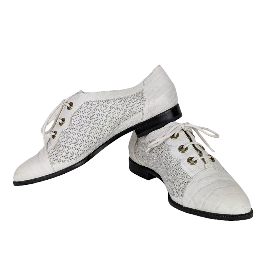 Jolies et élégantes derbies en cuir blanc. Plusieurs textures différentes, jolie dentelle de cuir sur les côtés. État impeccable, on dirait qu'elles n'ont jamais été portées !
