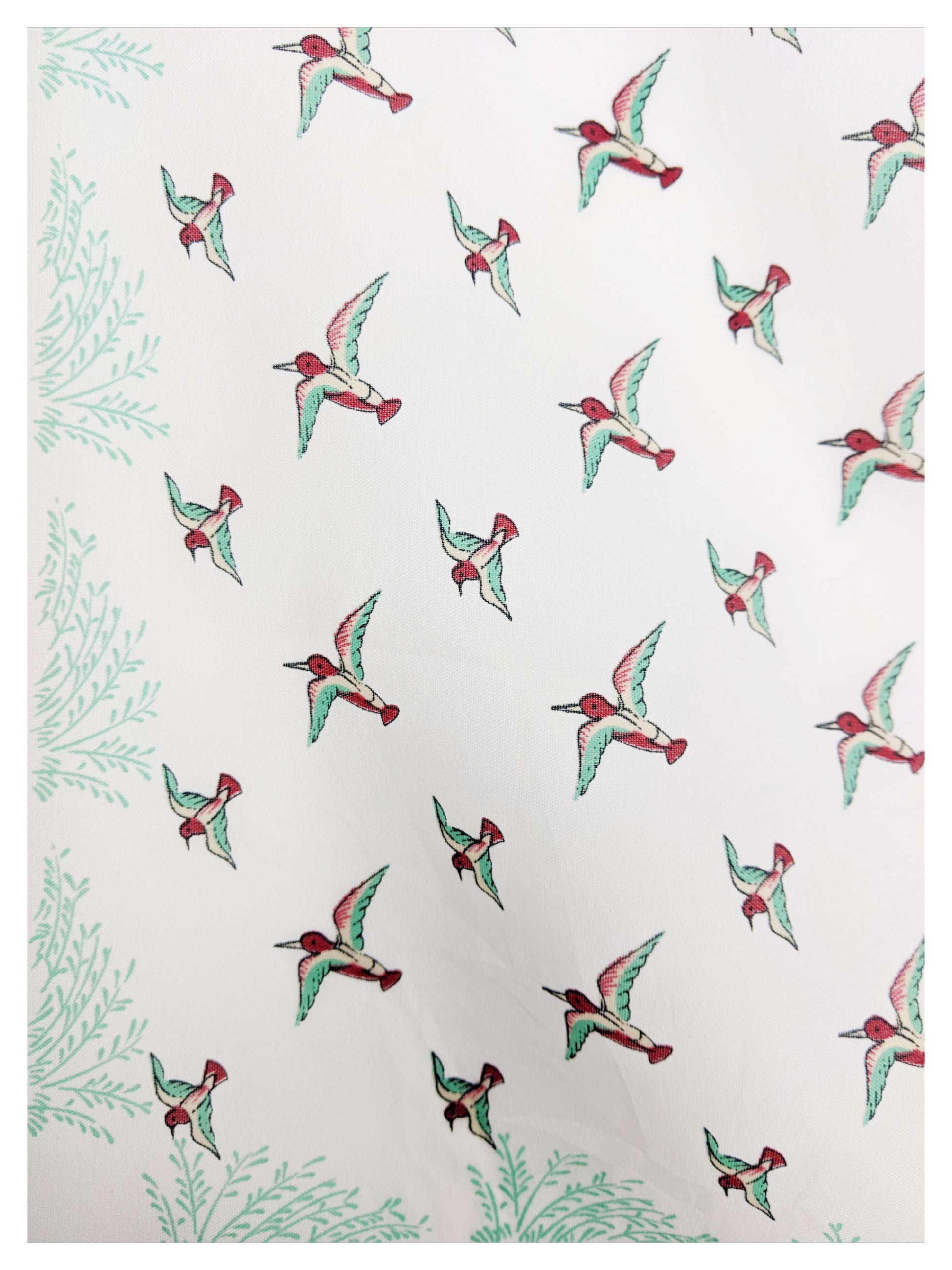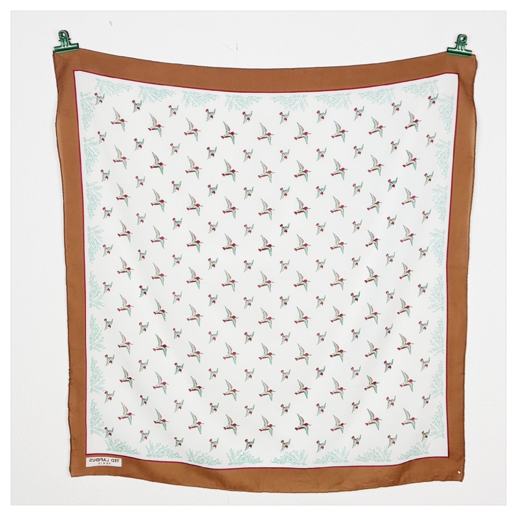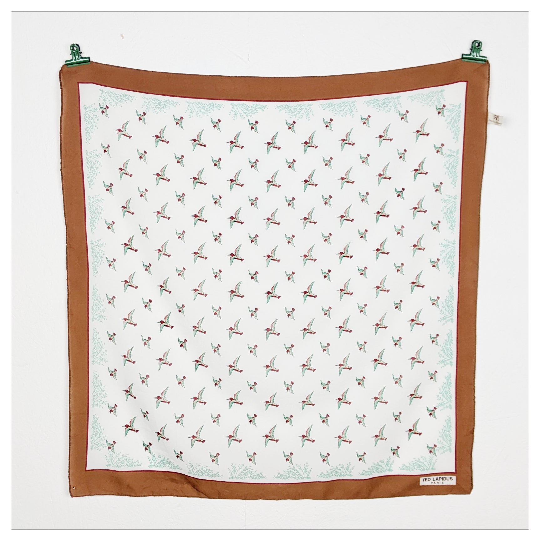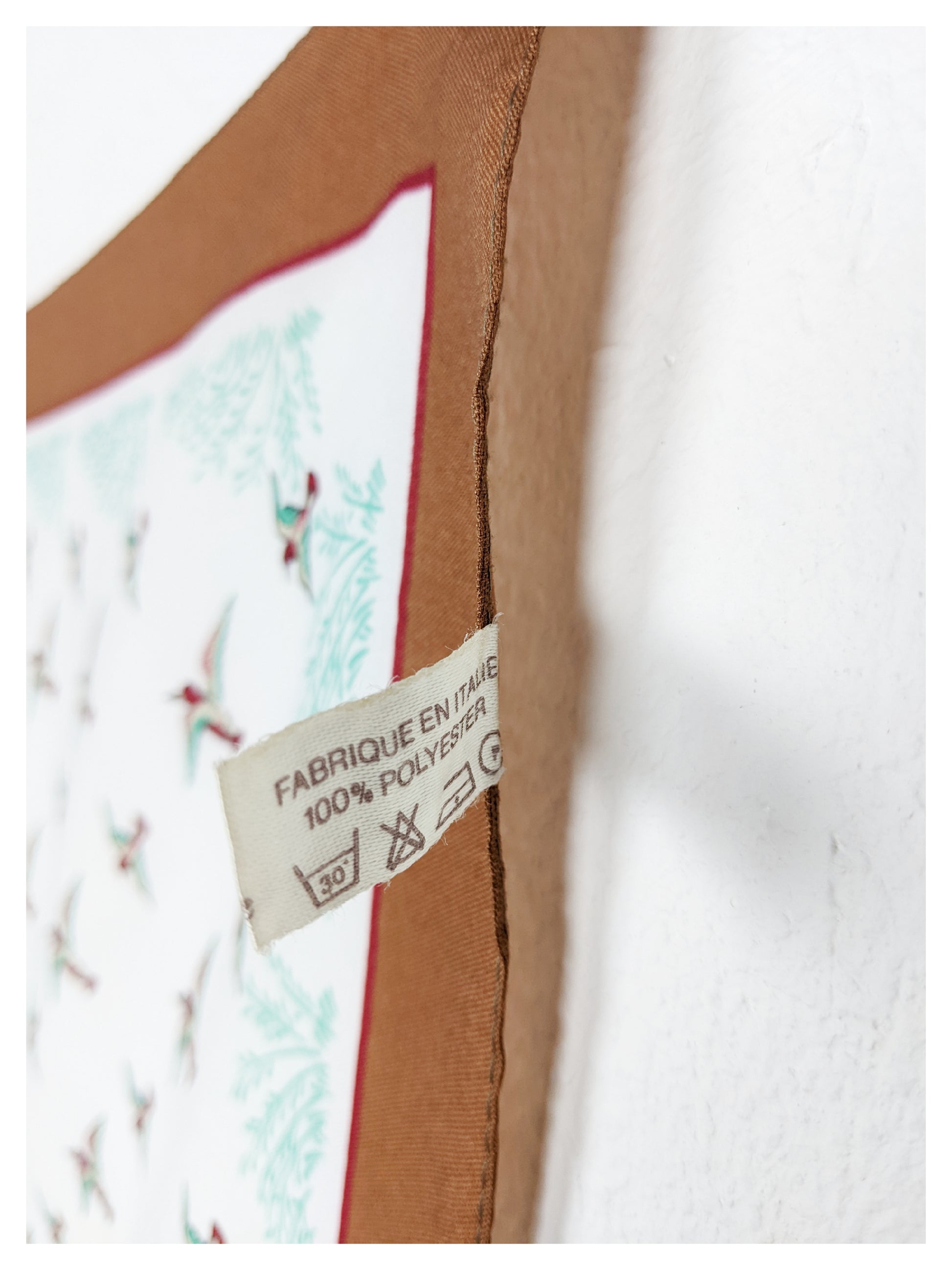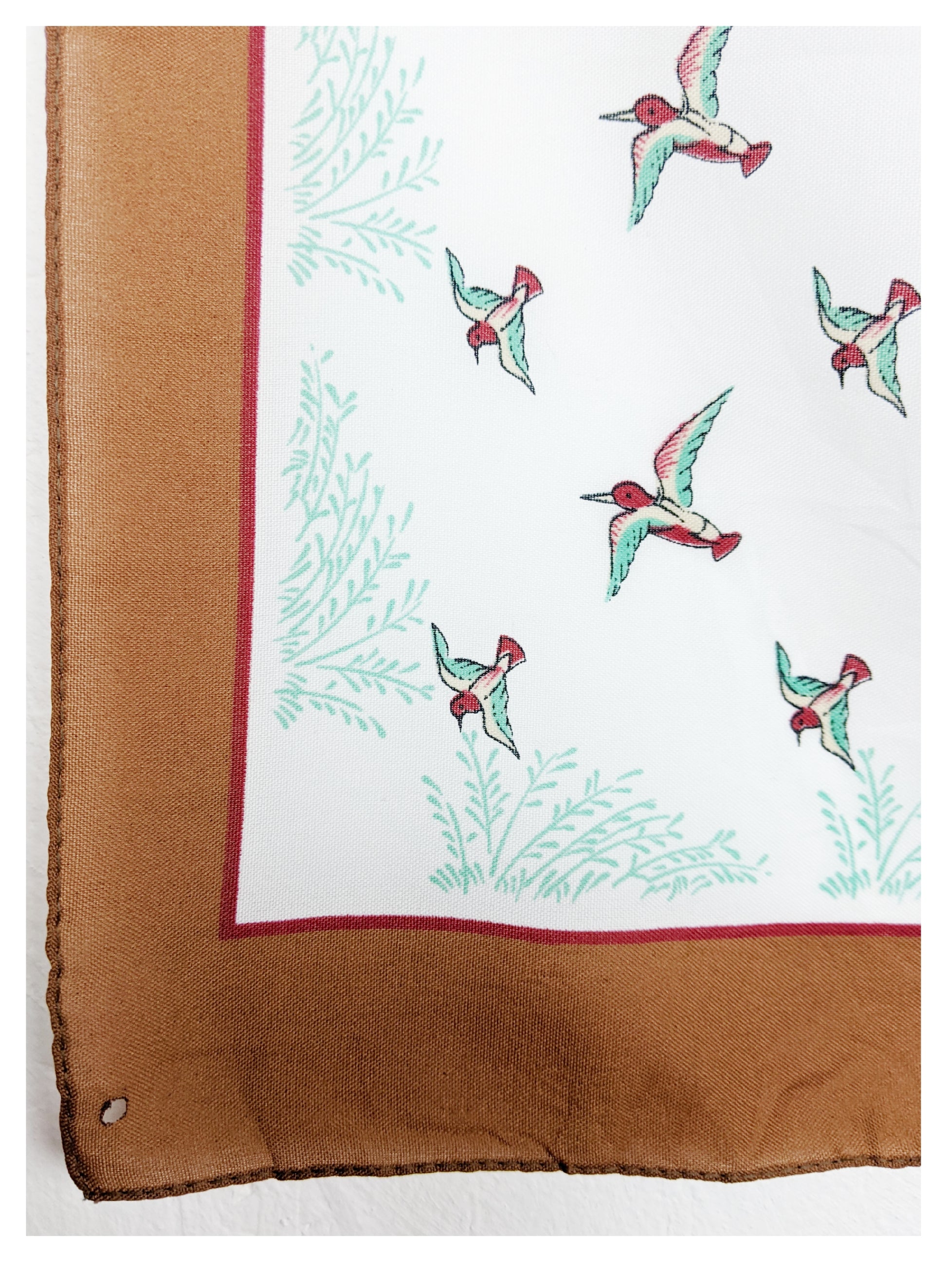Foulard carré à motifs "oiseaux" dans les tons blanc, marron, vert eau, rouge.