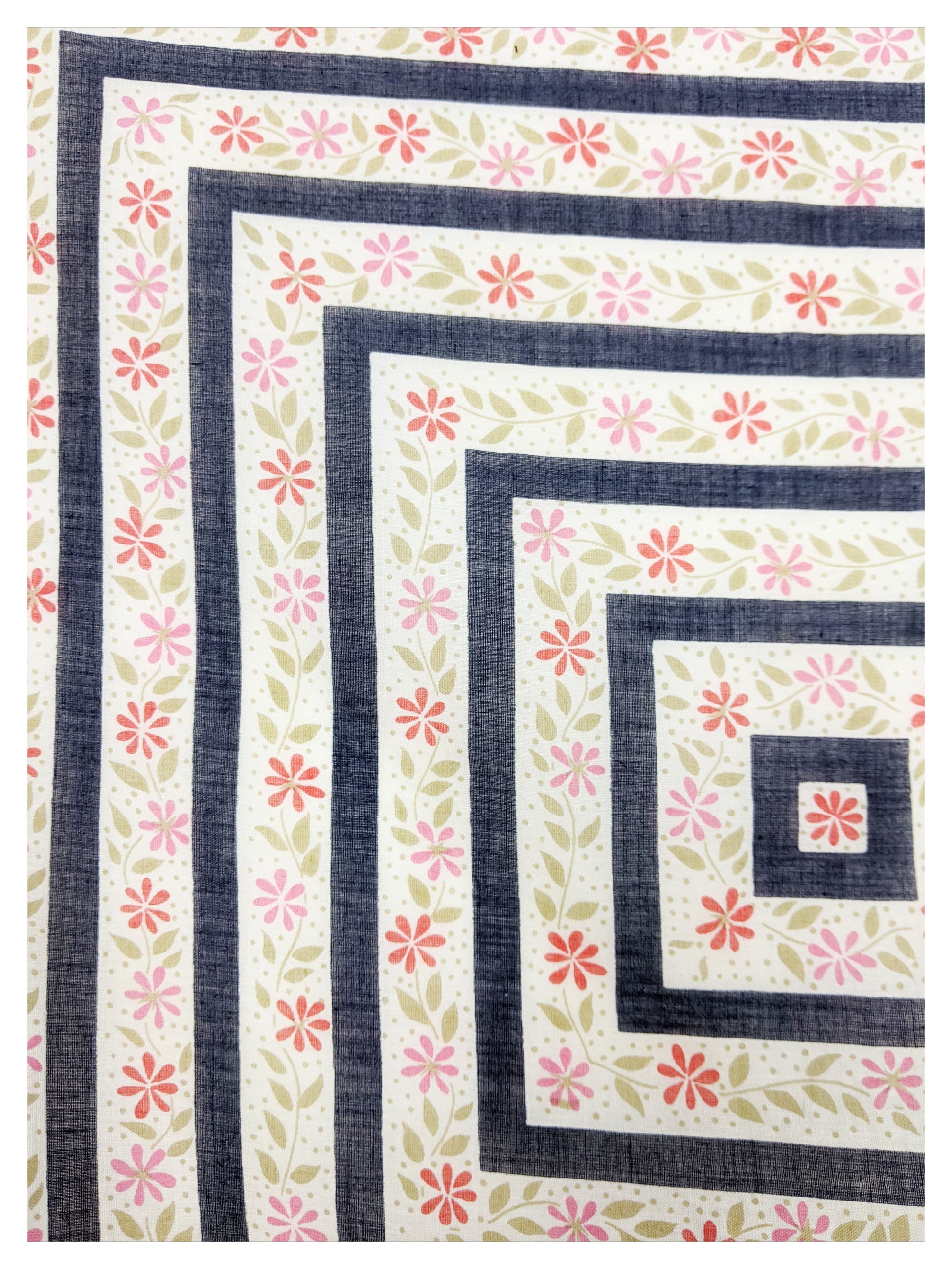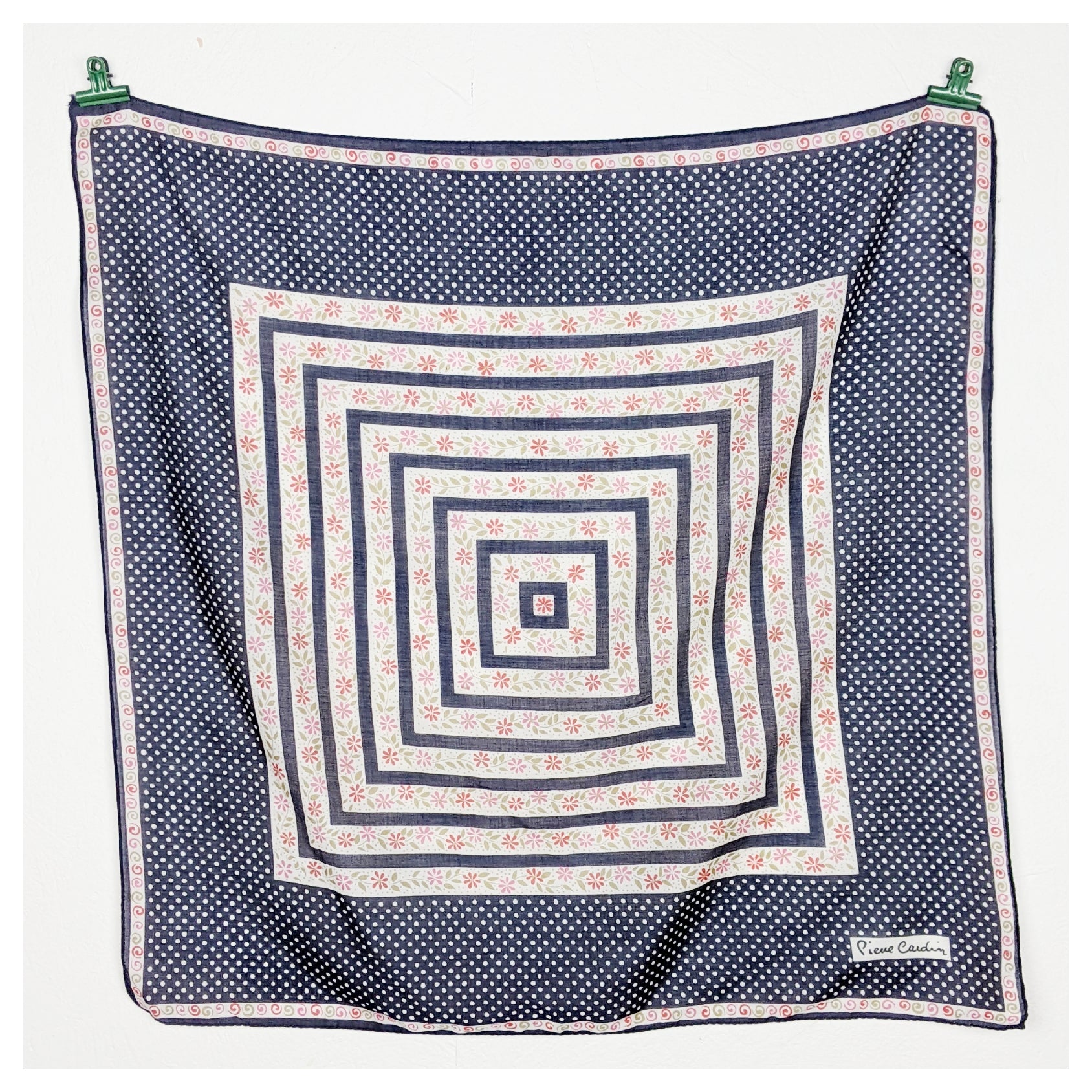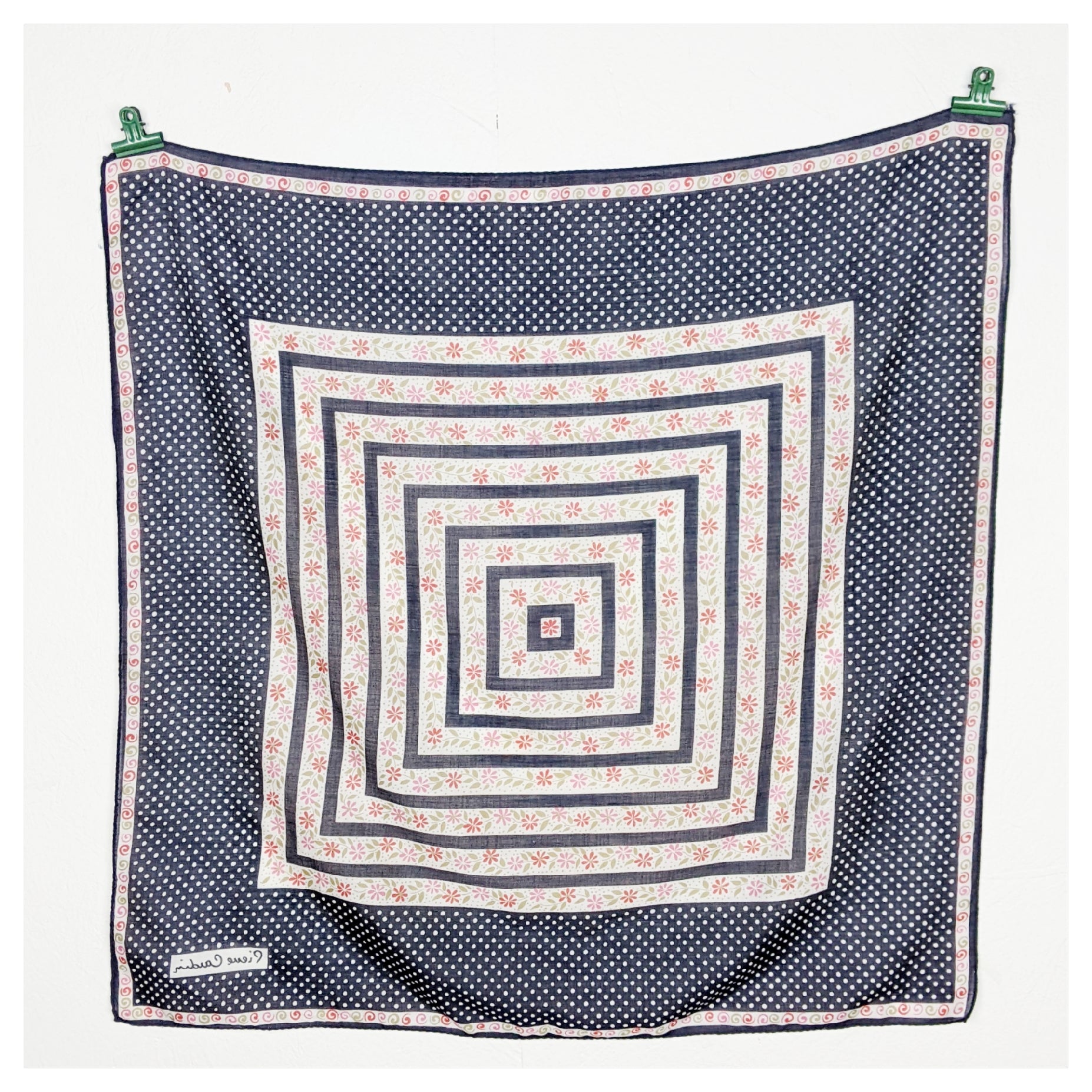 Joli foulard carré dans les tons bleu marine, blanc, kaki et rouge. Motifs pois et fleurs, et carré.