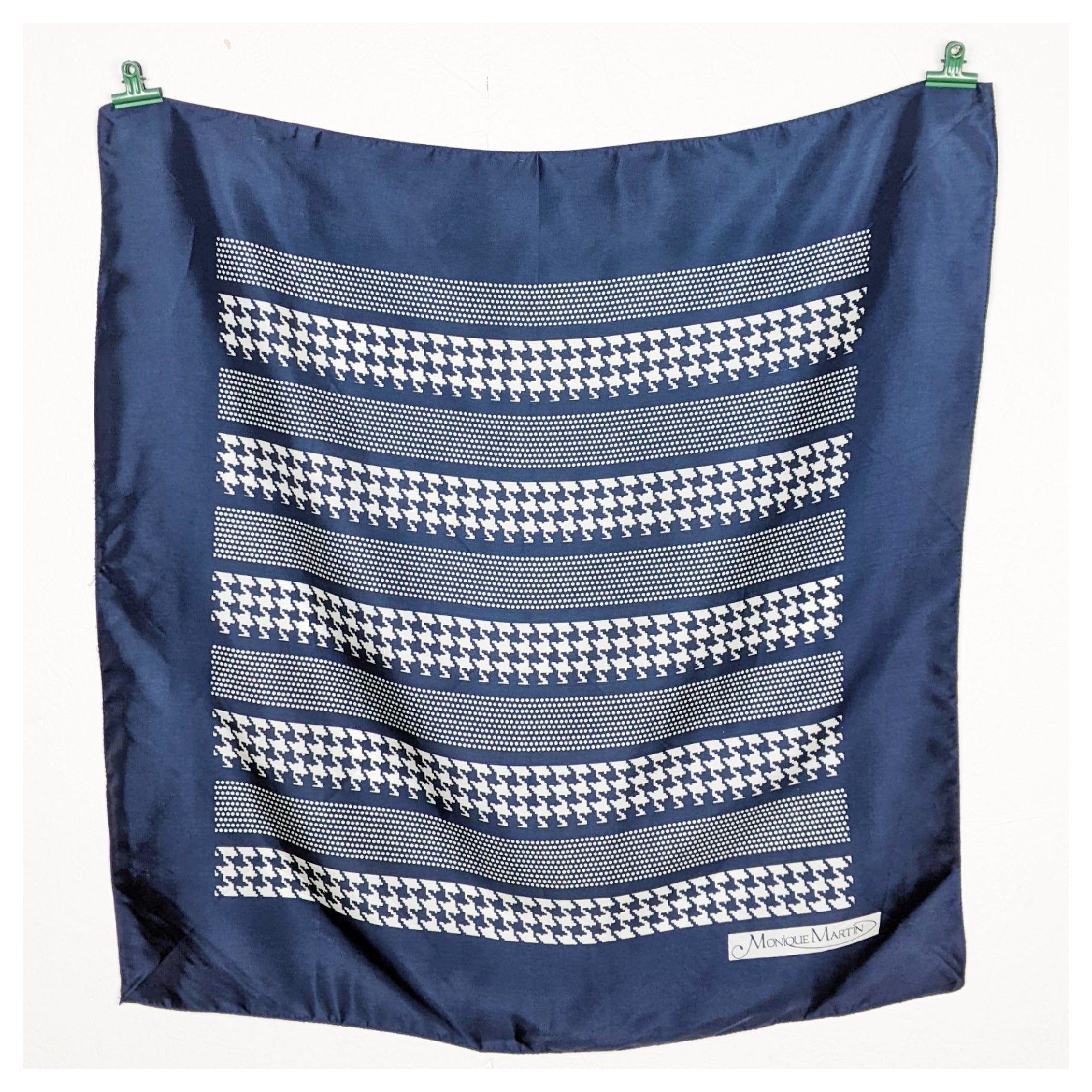 Foulard carré bleu marine à motifs pied de poule et pois.