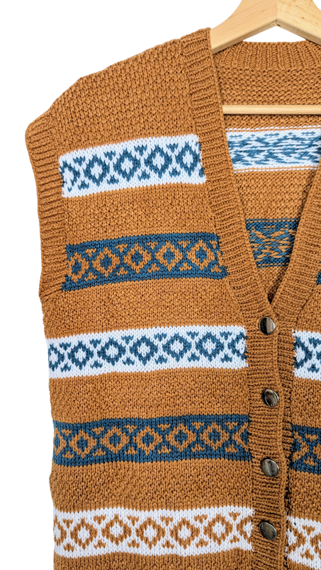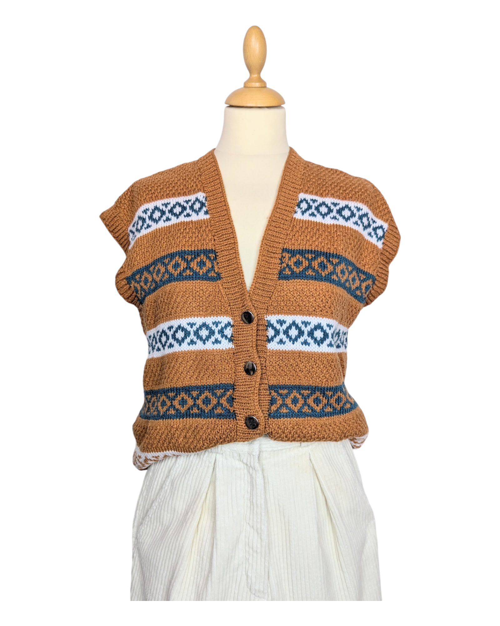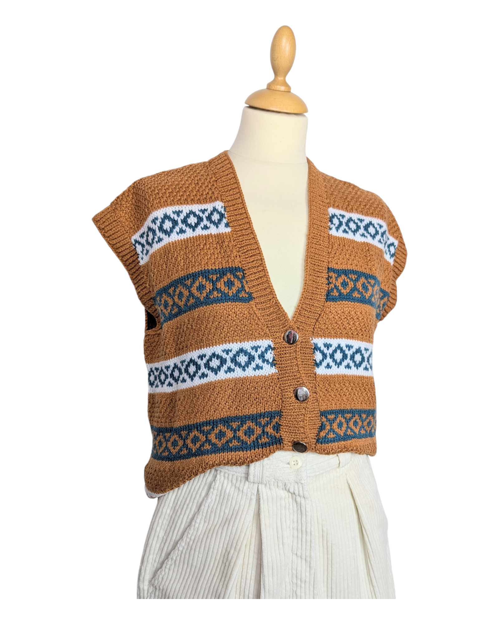 Gilet sans manche, tricoté main. Coloris ocre, bleu pétrole et blanc. Col en V, boutonné sur le devant avec sept boutons dorés. Coupe droite, légèrement resserré dans le fond. Superbe travaille de tricot, fait à la main, une jolie pièce unique.