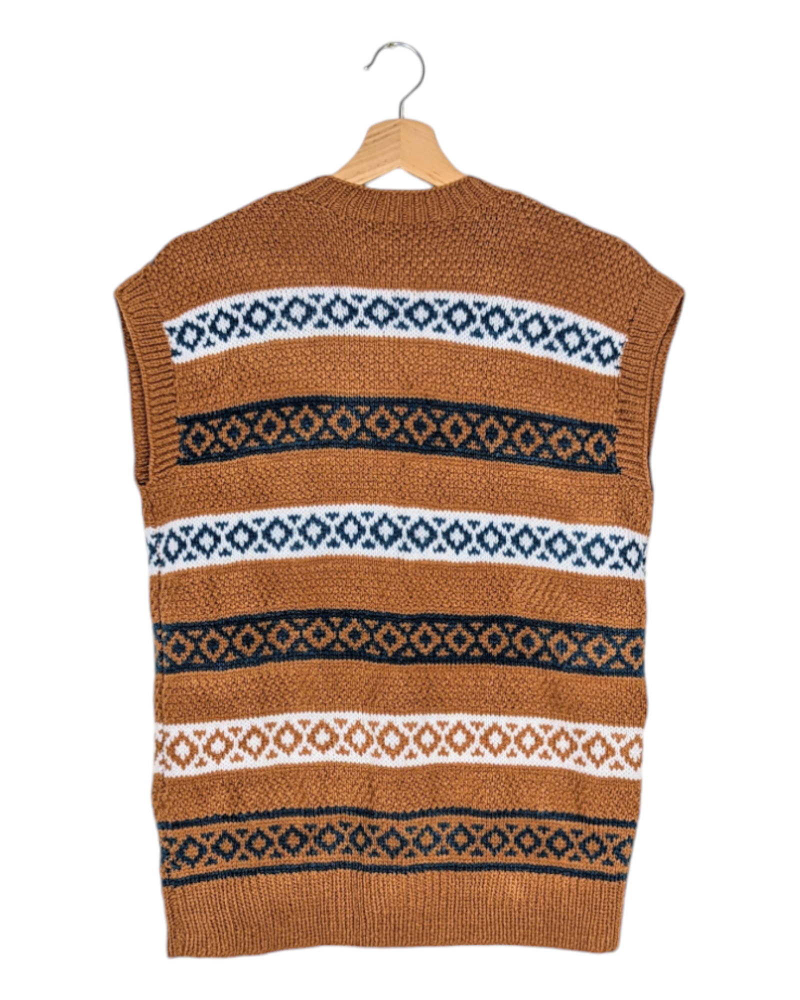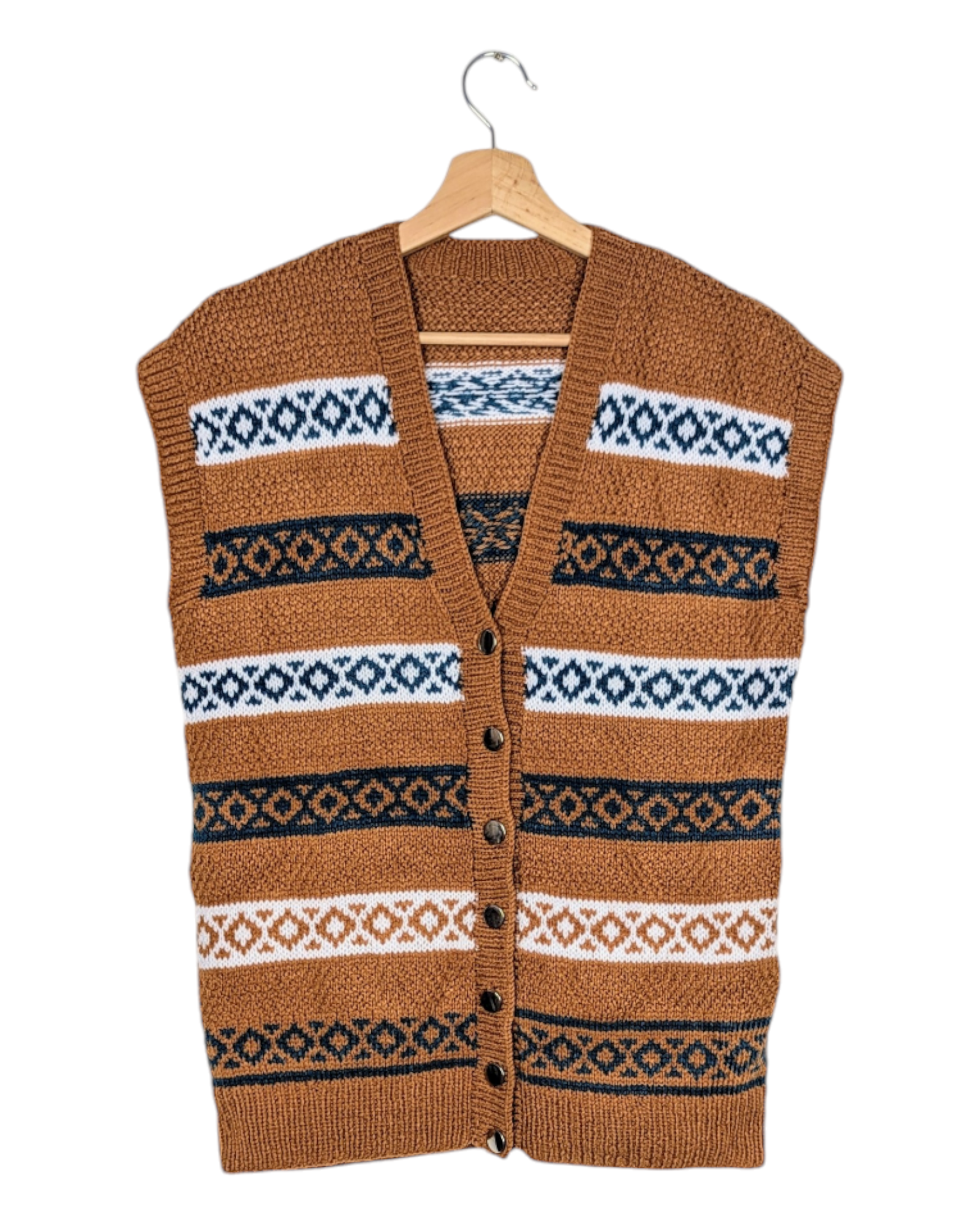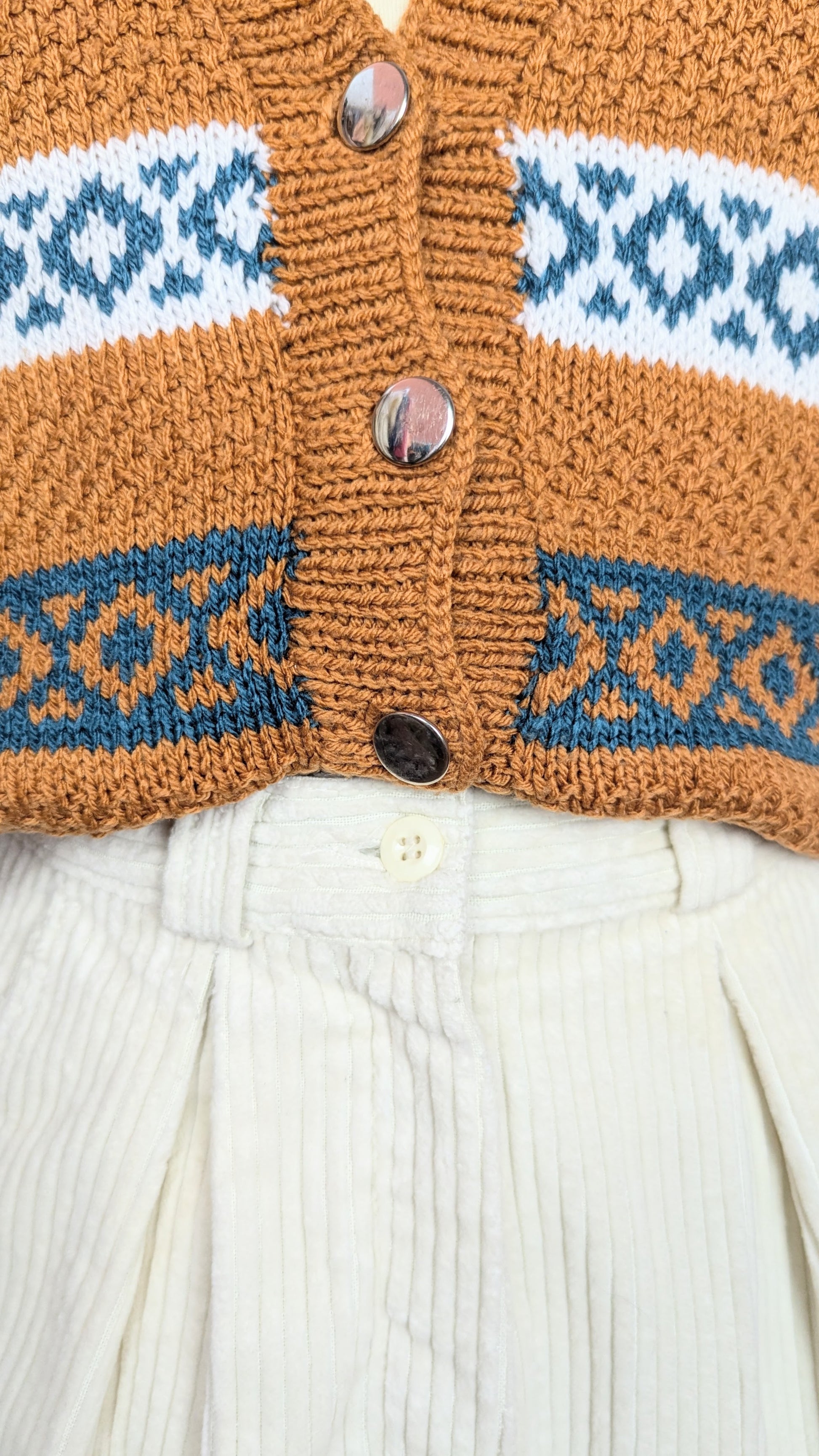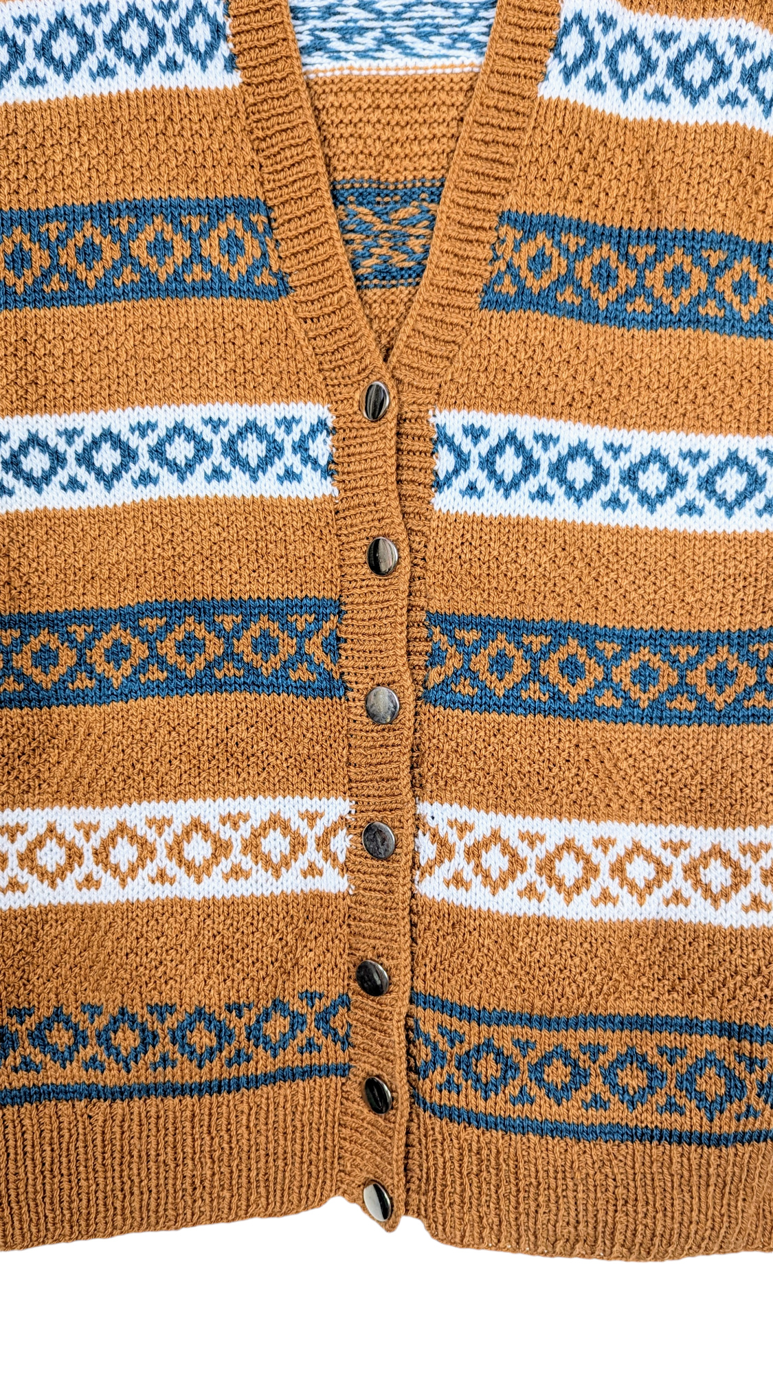 Gilet sans manche, tricoté main. Coloris ocre, bleu pétrole et blanc. Col en V, boutonné sur le devant avec sept boutons dorés. Coupe droite, légèrement resserré dans le fond. Superbe travaille de tricot, fait à la main, une jolie pièce unique.