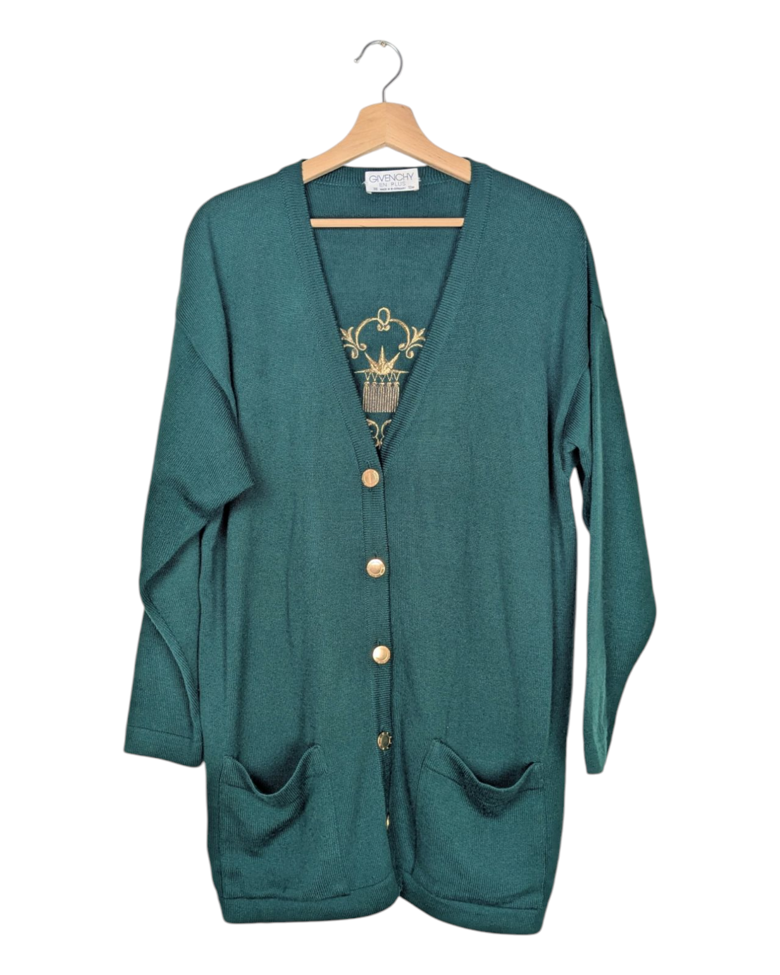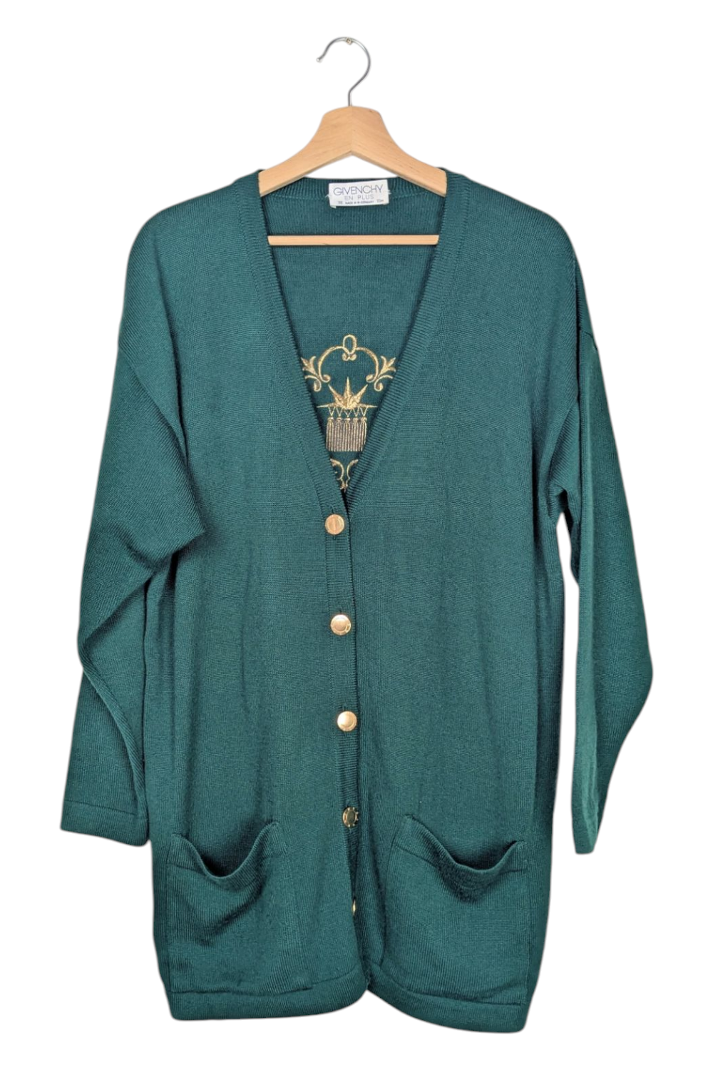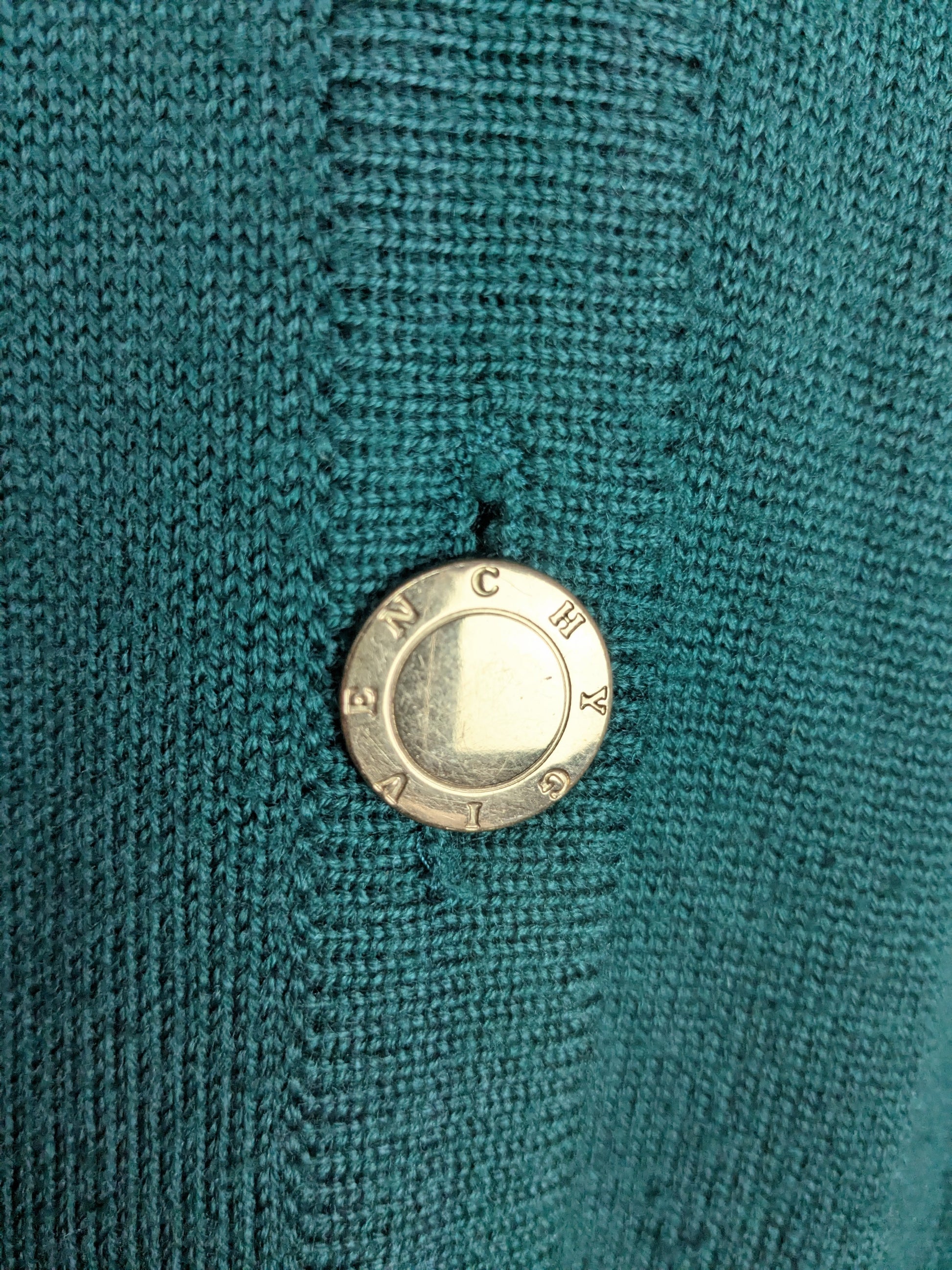 Très joli gilet long cardigan vert émeraude. Assez long, encolure en V. Cigle GIvenchy en doré dans le dos. Un intemporel.