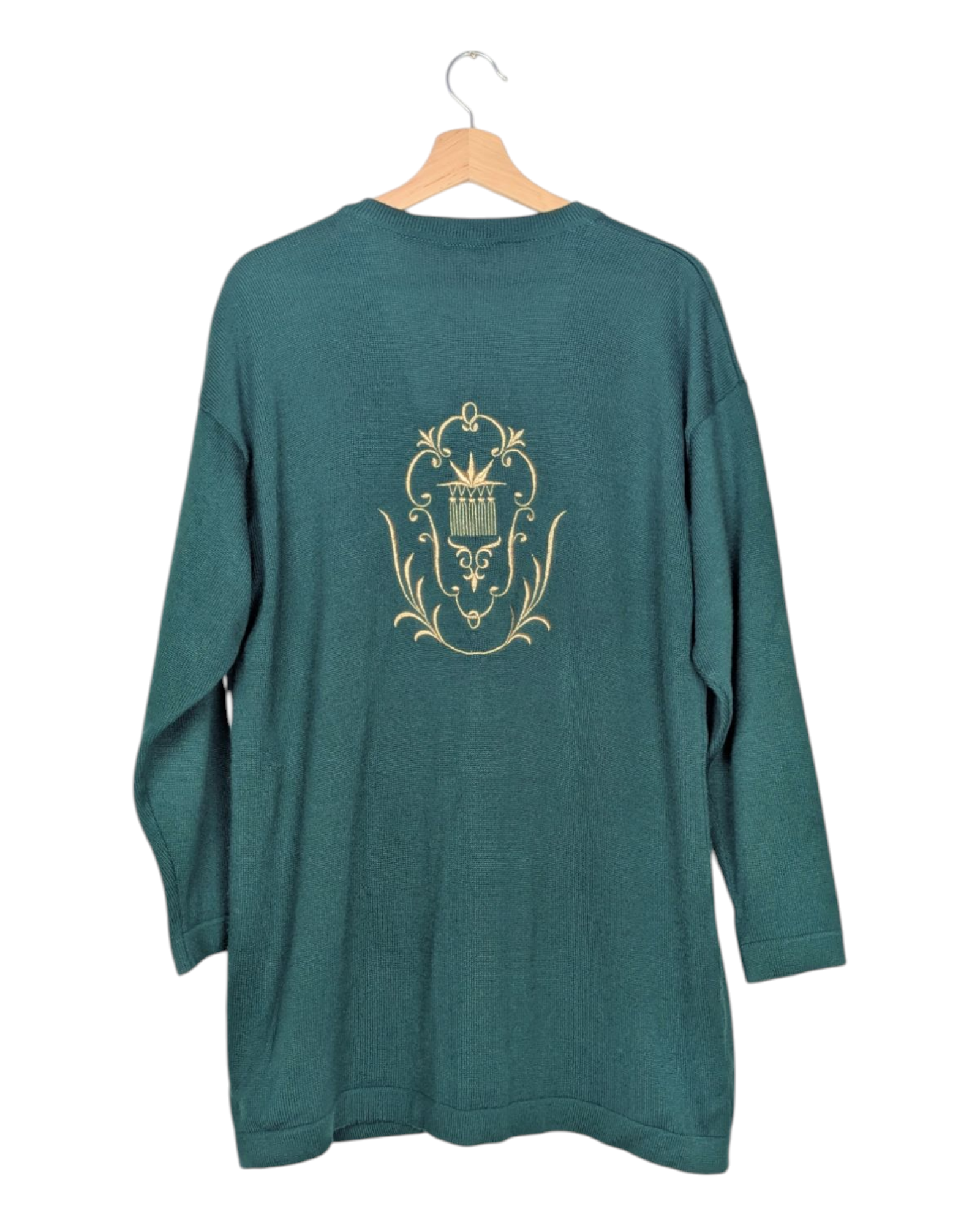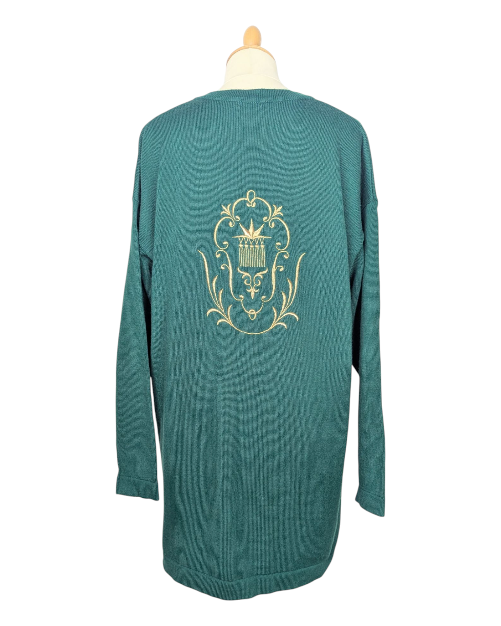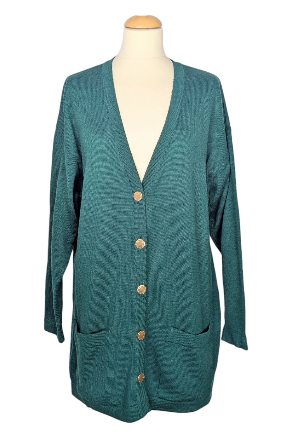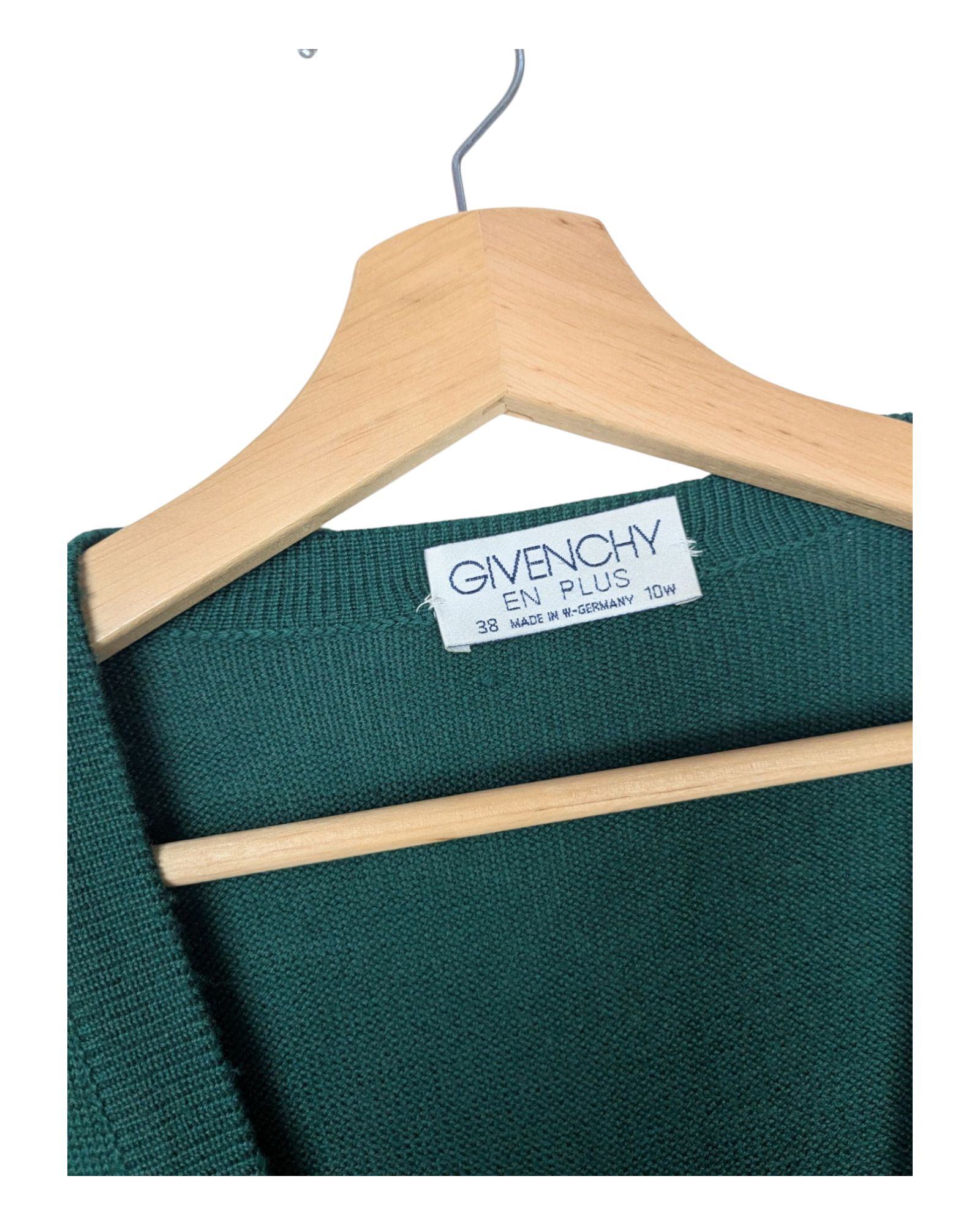 Très joli gilet long cardigan vert émeraude. Assez long, encolure en V. Cigle GIvenchy en doré dans le dos. Un intemporel.
