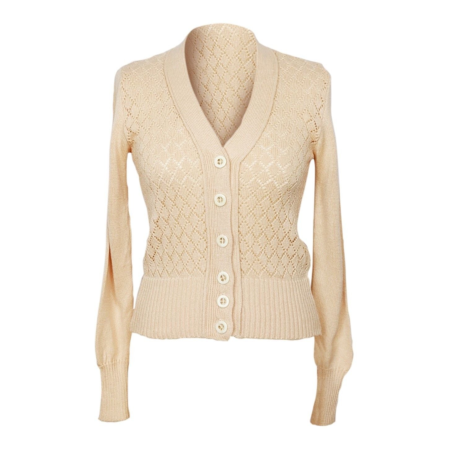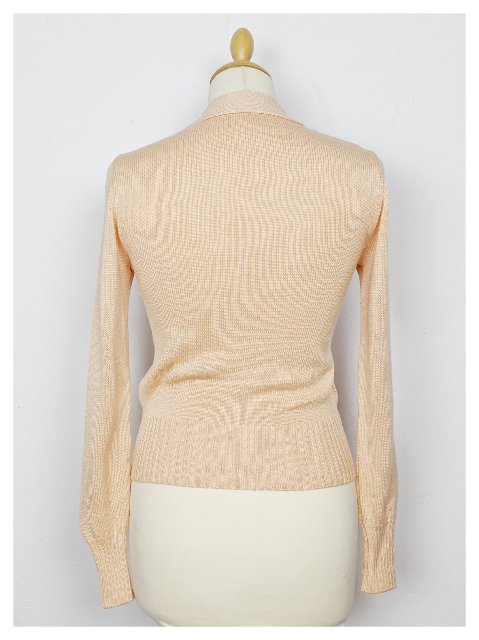 Superbe gilet de couleur saumon clair. Tricot ajouré sur le devant avec motifs en forme de losange. Manches longues resserrées aux poignets. Resserré également à la taille. Col en V, boutonné sur le devant avec 6 jolis boutons. Ne gratte pas, et très fluide bien que chaud. Une magnifique pièce coup de coeur.