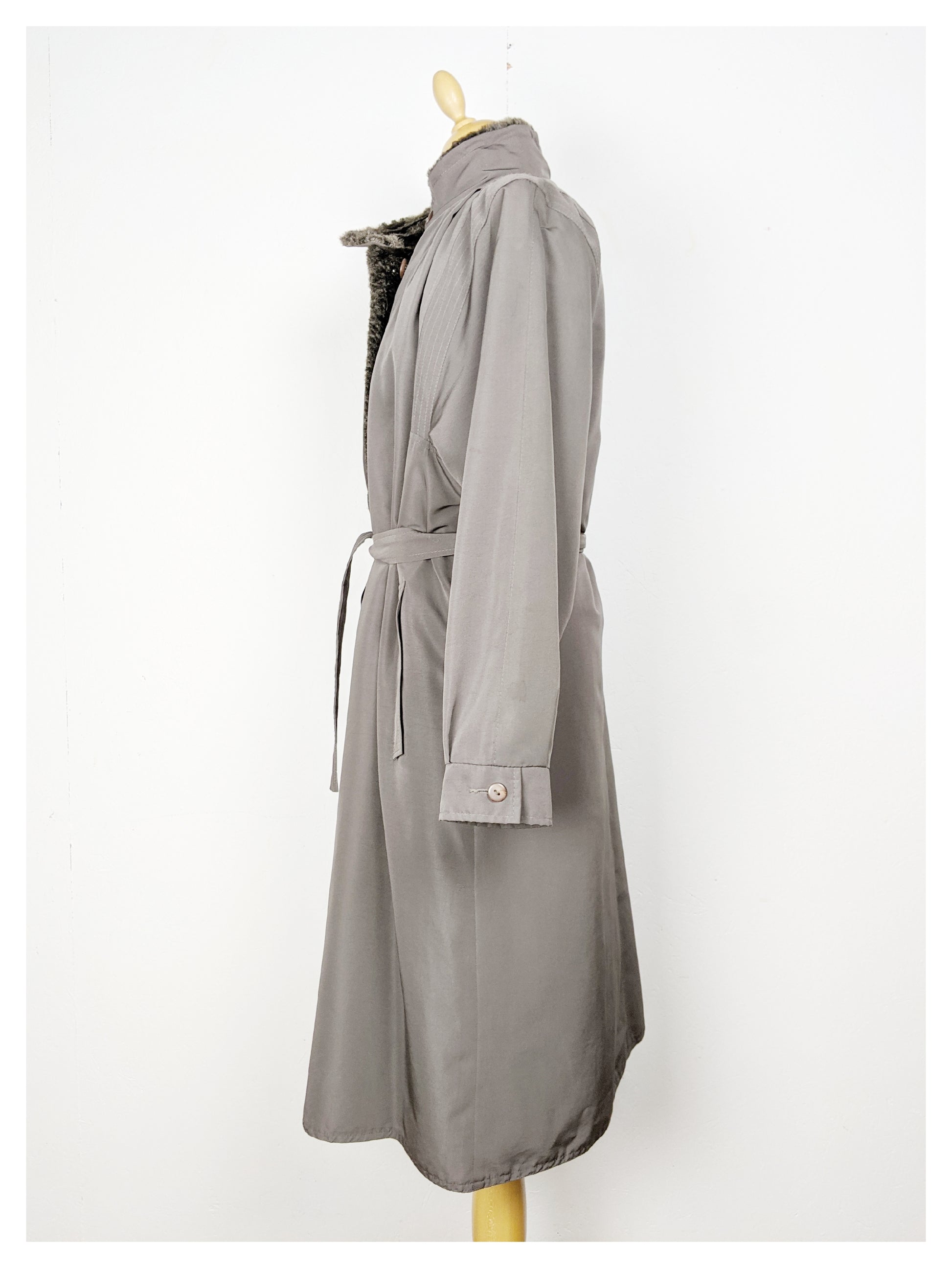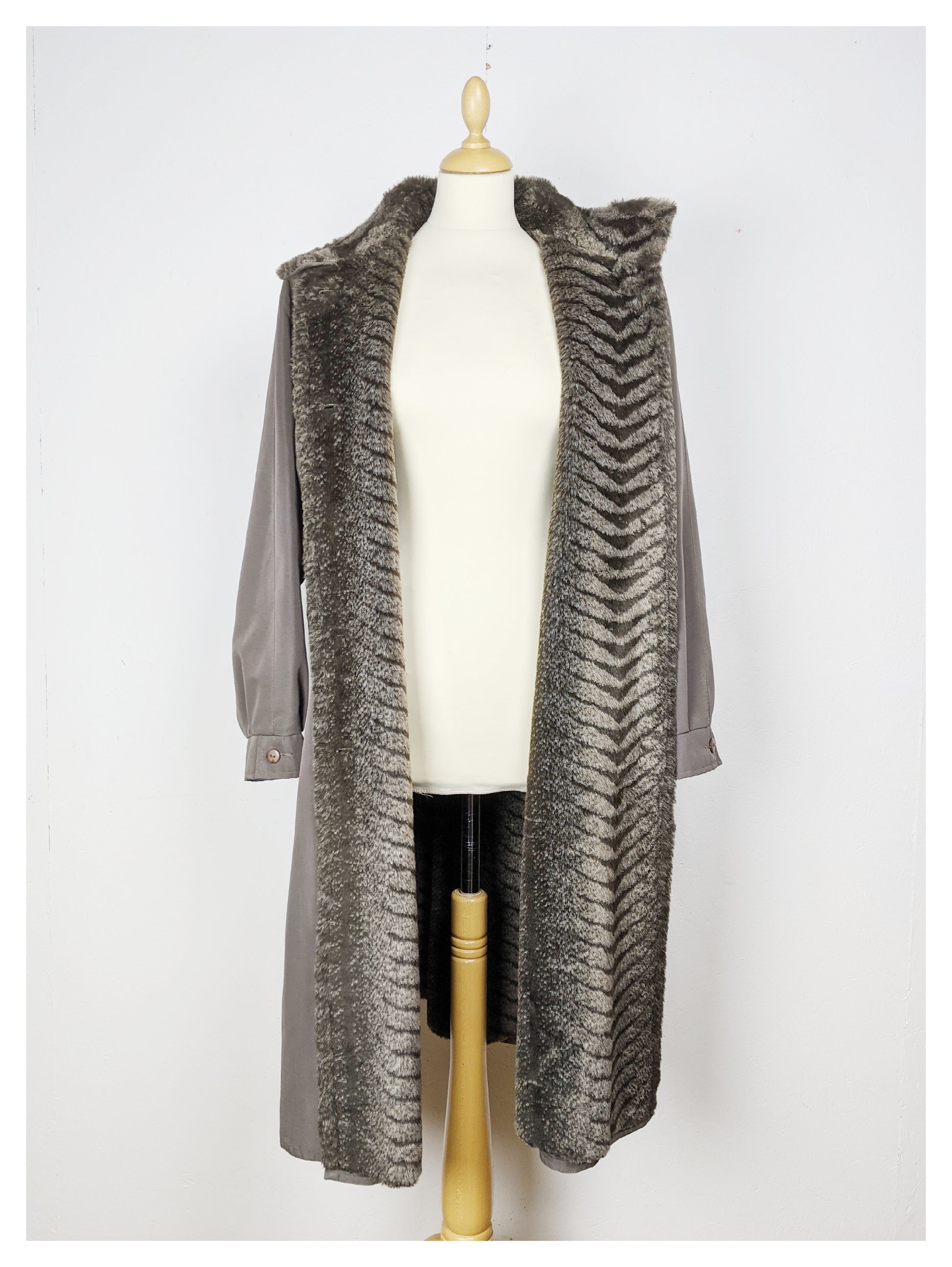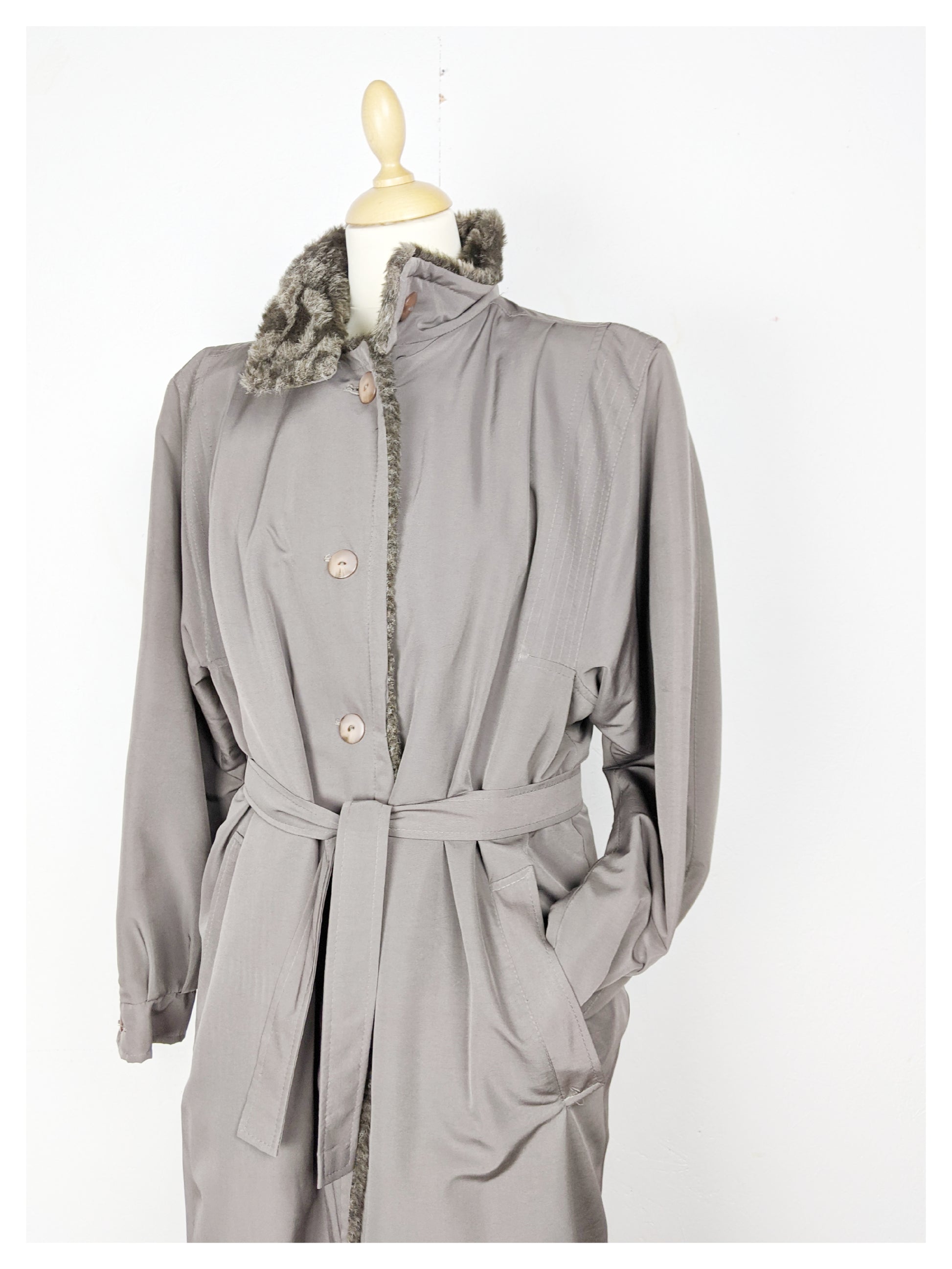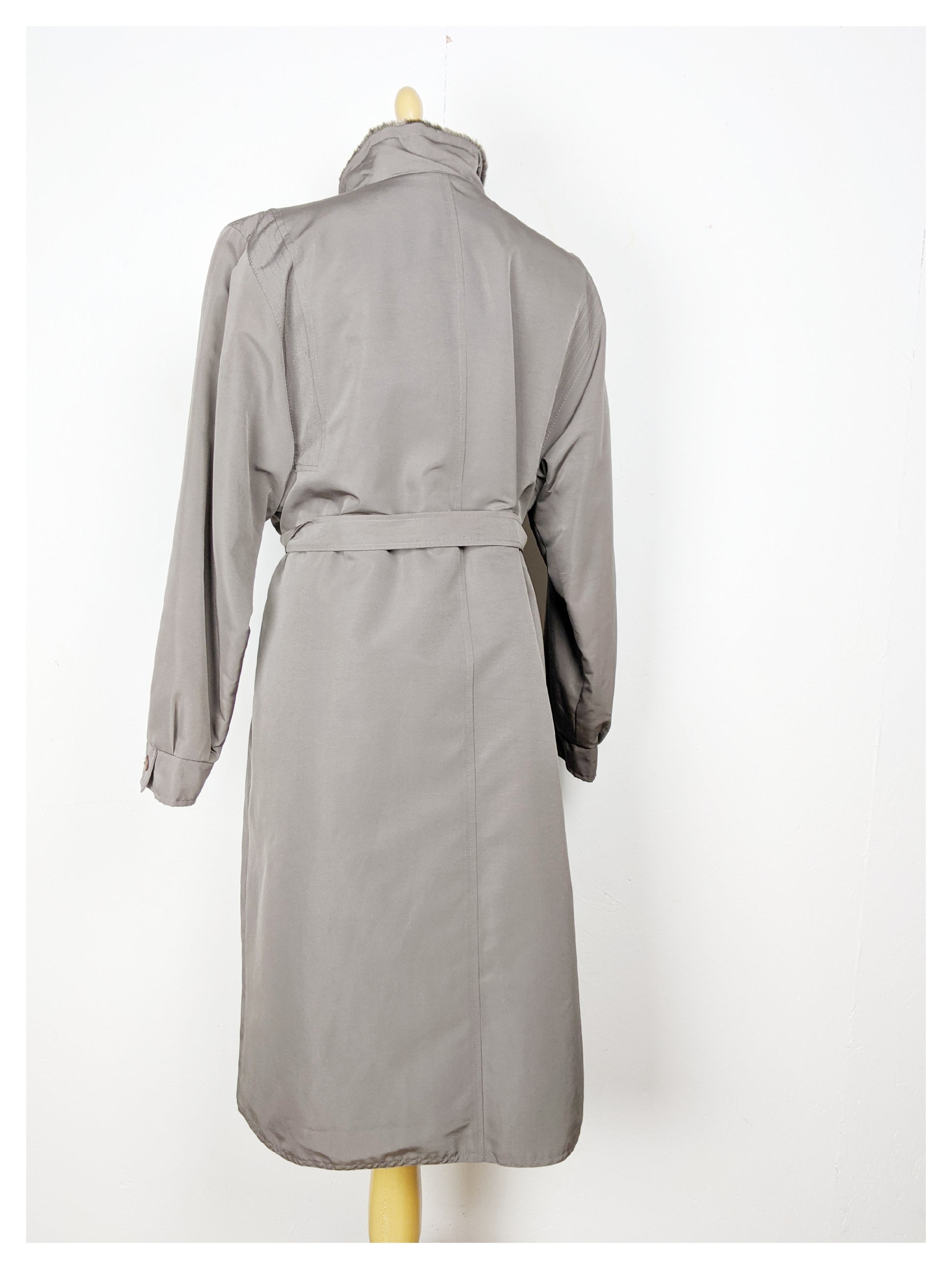 Très joli imperméable de couleur taupe, avec une doublure fourré de dingue ! Un imprimé dans les tons gris, taupe et brun. Coupe droite. Col type officier, qui peut être ouvert type claudine avec la même fausse fourrure qu'à l'intérieur. Fermeture sur le devant avec 6 boutons. Un pli sur chaque épaule avec empiècement qui donne de la structure aux épaules. Poignets resserrés avec un bouton en garniture. Deux poches passepoilées à rabat de chaque côté. Ceinture pour resserrer à la taille. Peut donner une allure très années 50 une fois fermé et cintré avec la ceinture.
