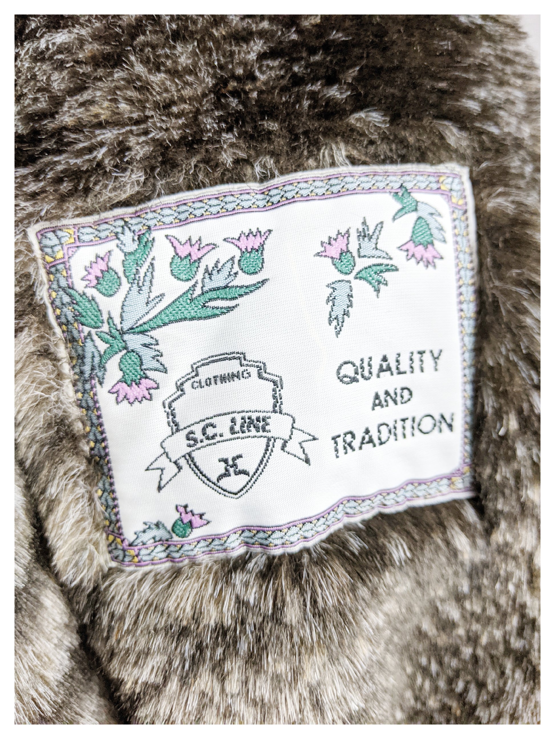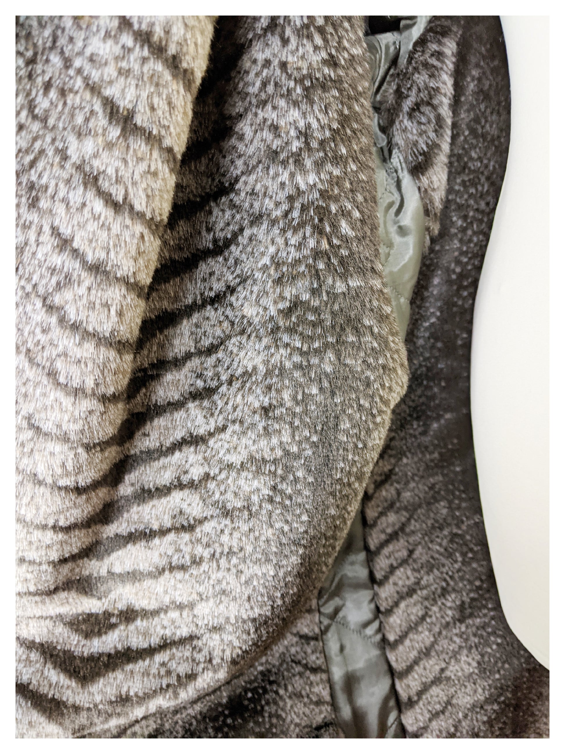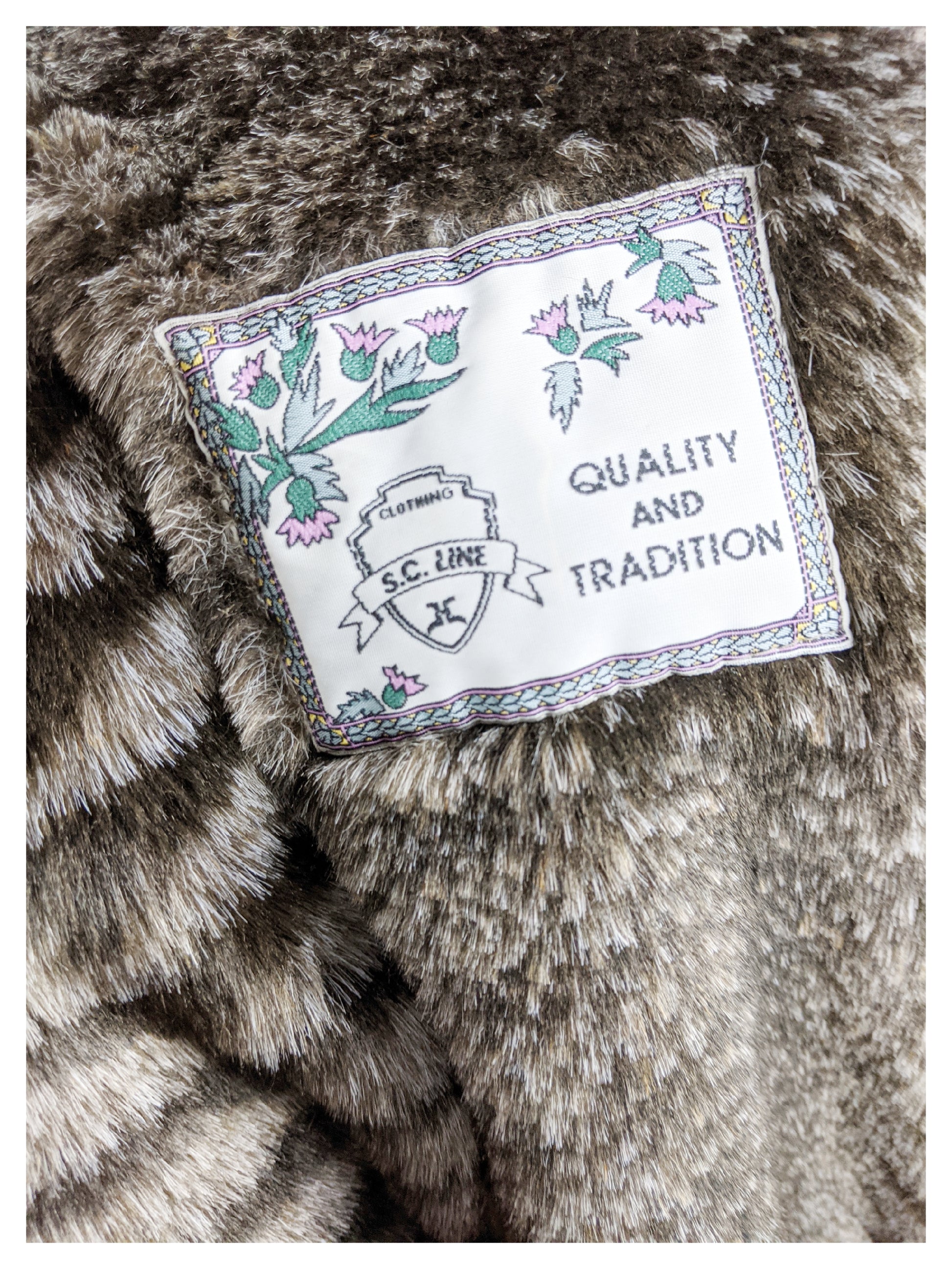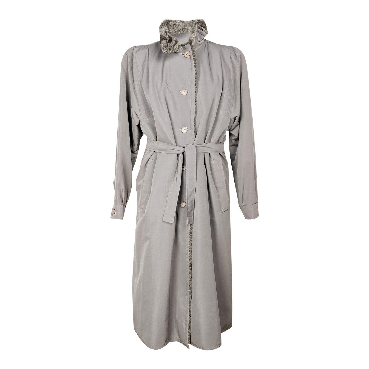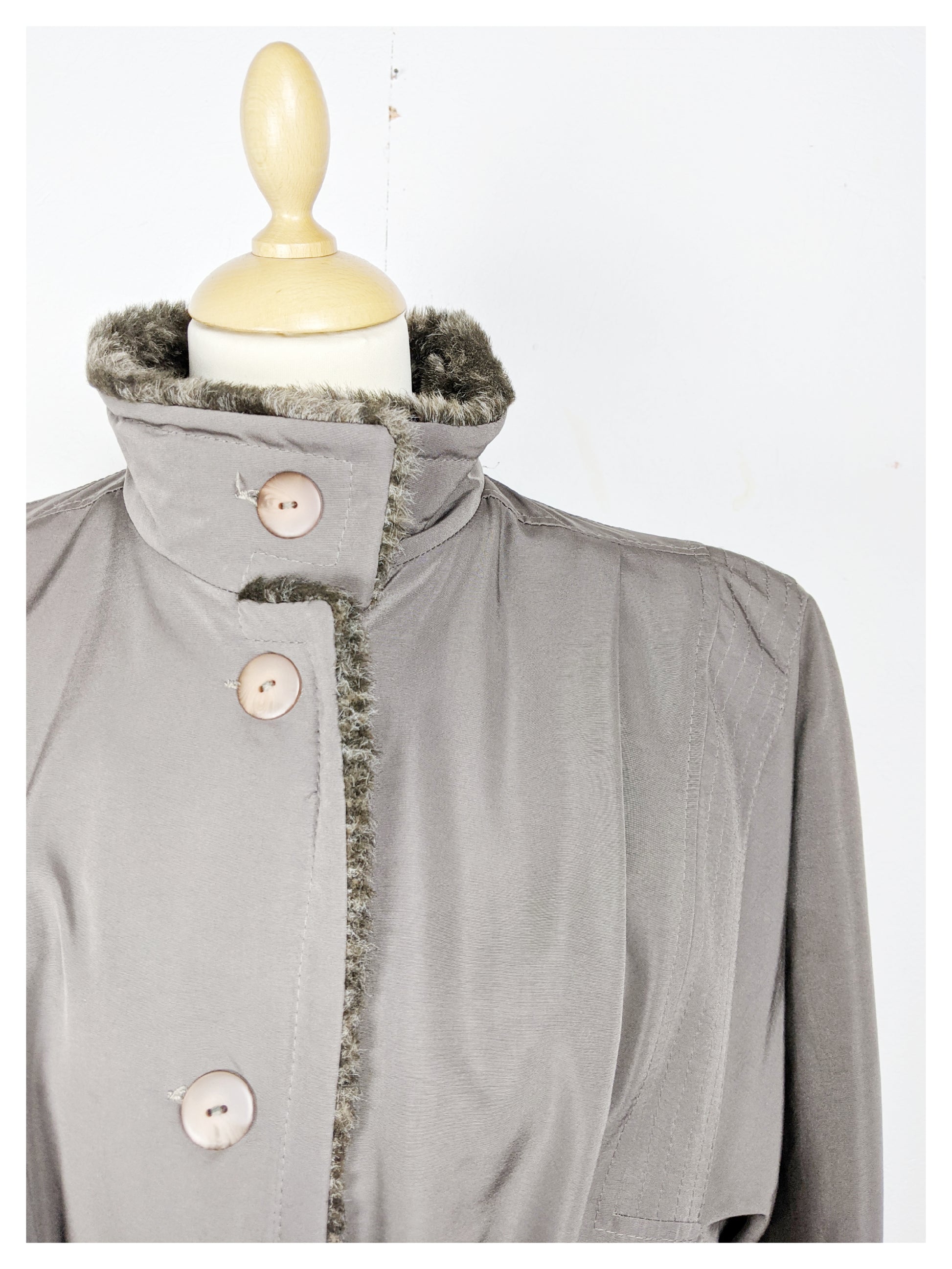 Très joli imperméable de couleur taupe, avec une doublure fourré de dingue ! Un imprimé dans les tons gris, taupe et brun. Coupe droite. Col type officier, qui peut être ouvert type claudine avec la même fausse fourrure qu'à l'intérieur. Fermeture sur le devant avec 6 boutons. Un pli sur chaque épaule avec empiècement qui donne de la structure aux épaules. Poignets resserrés avec un bouton en garniture. Deux poches passepoilées à rabat de chaque côté. Ceinture pour resserrer à la taille. Peut donner une allure très années 50 une fois fermé et cintré avec la ceinture.
