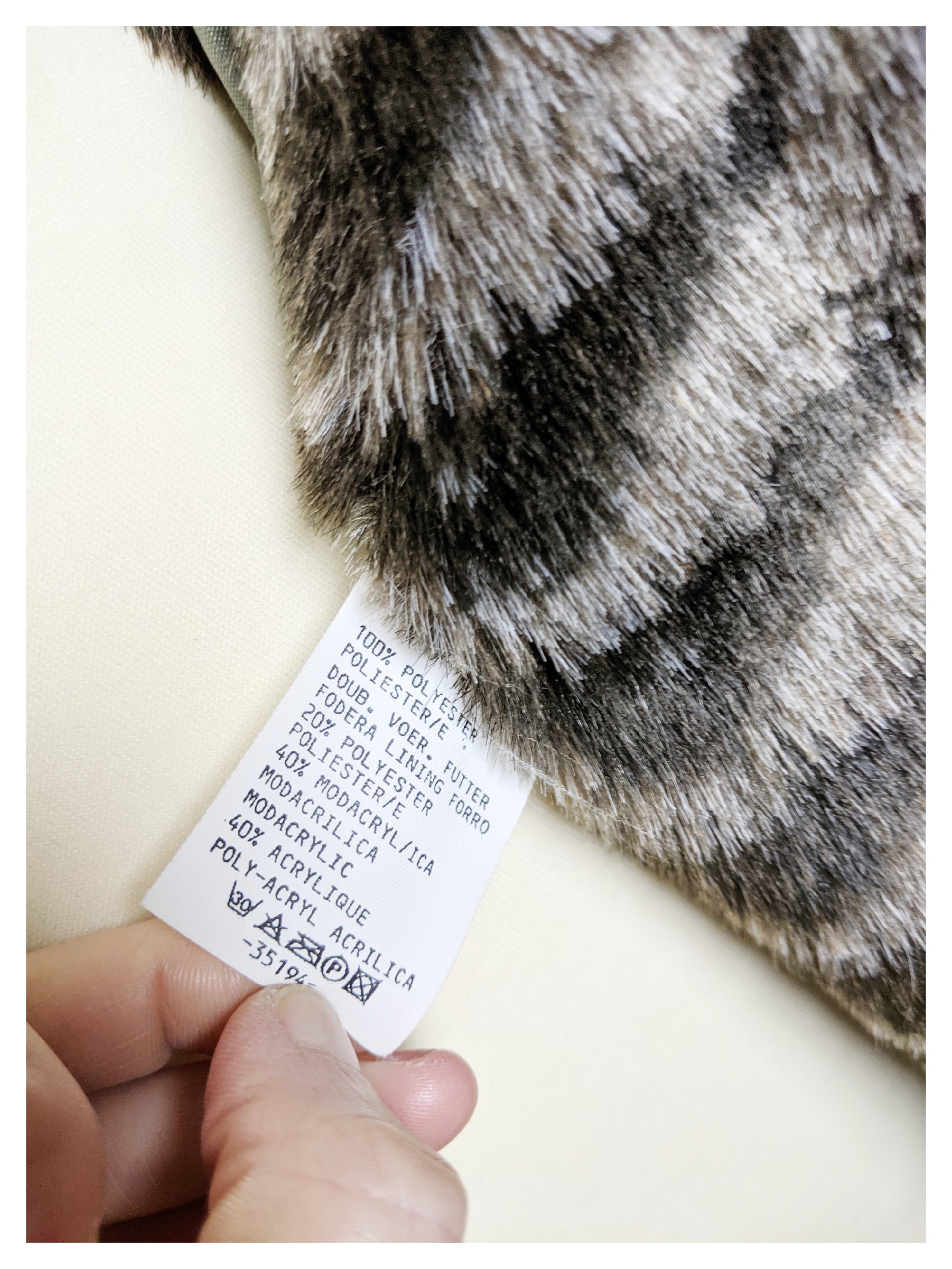 Composition indiquée : 100% polyester / Doublure : 20% polyester, 40% modacryl, 40% acrylique.