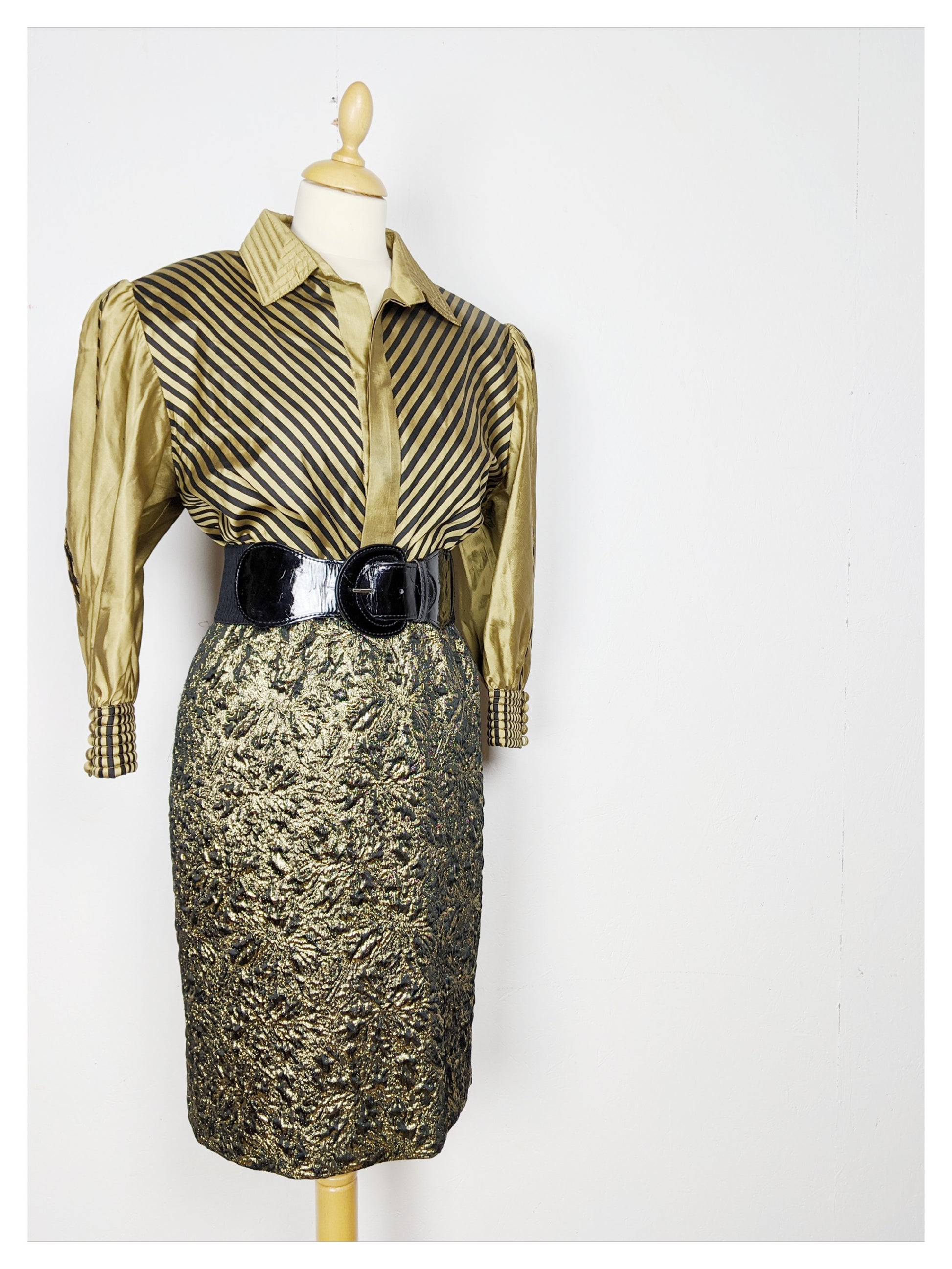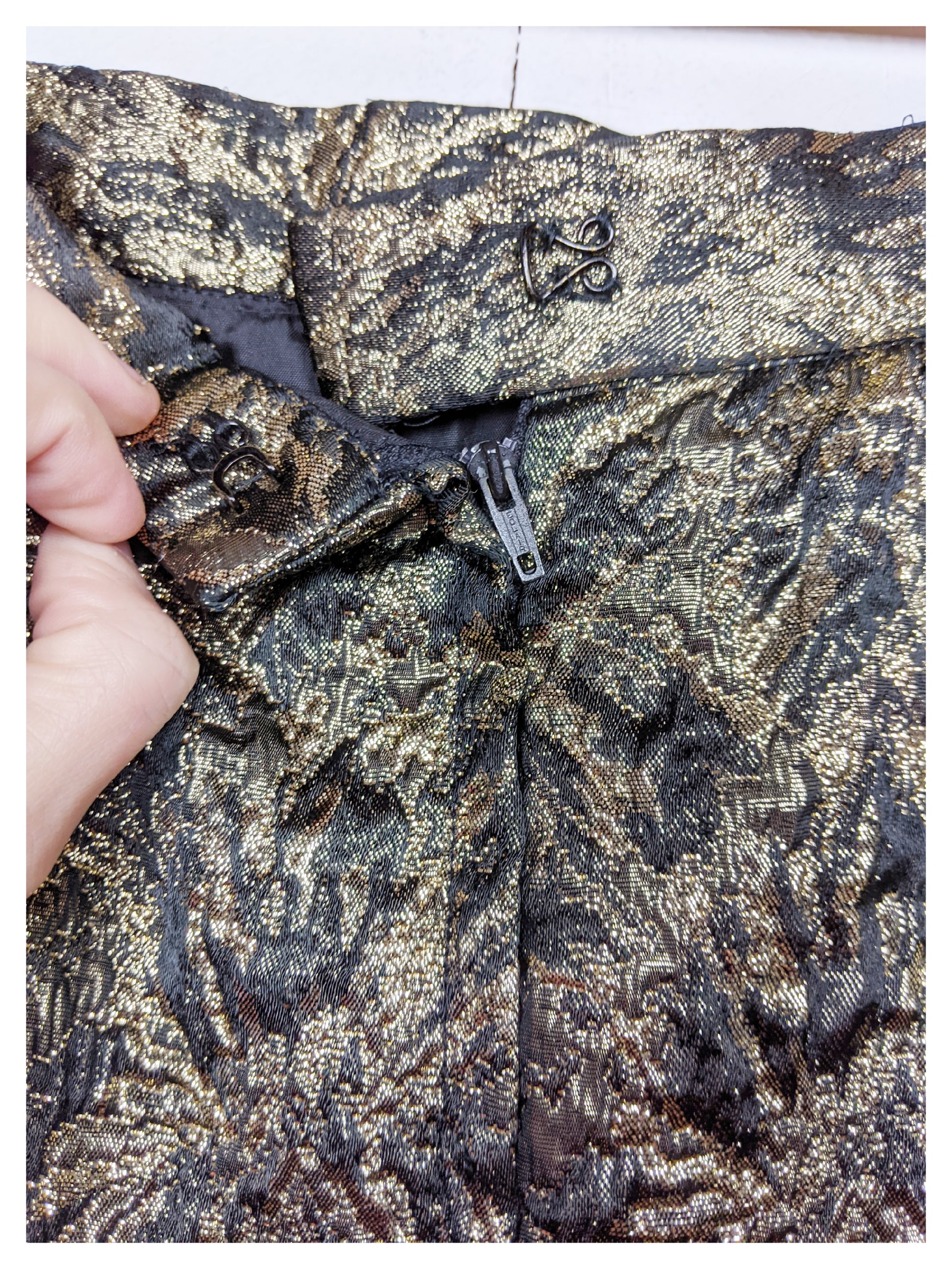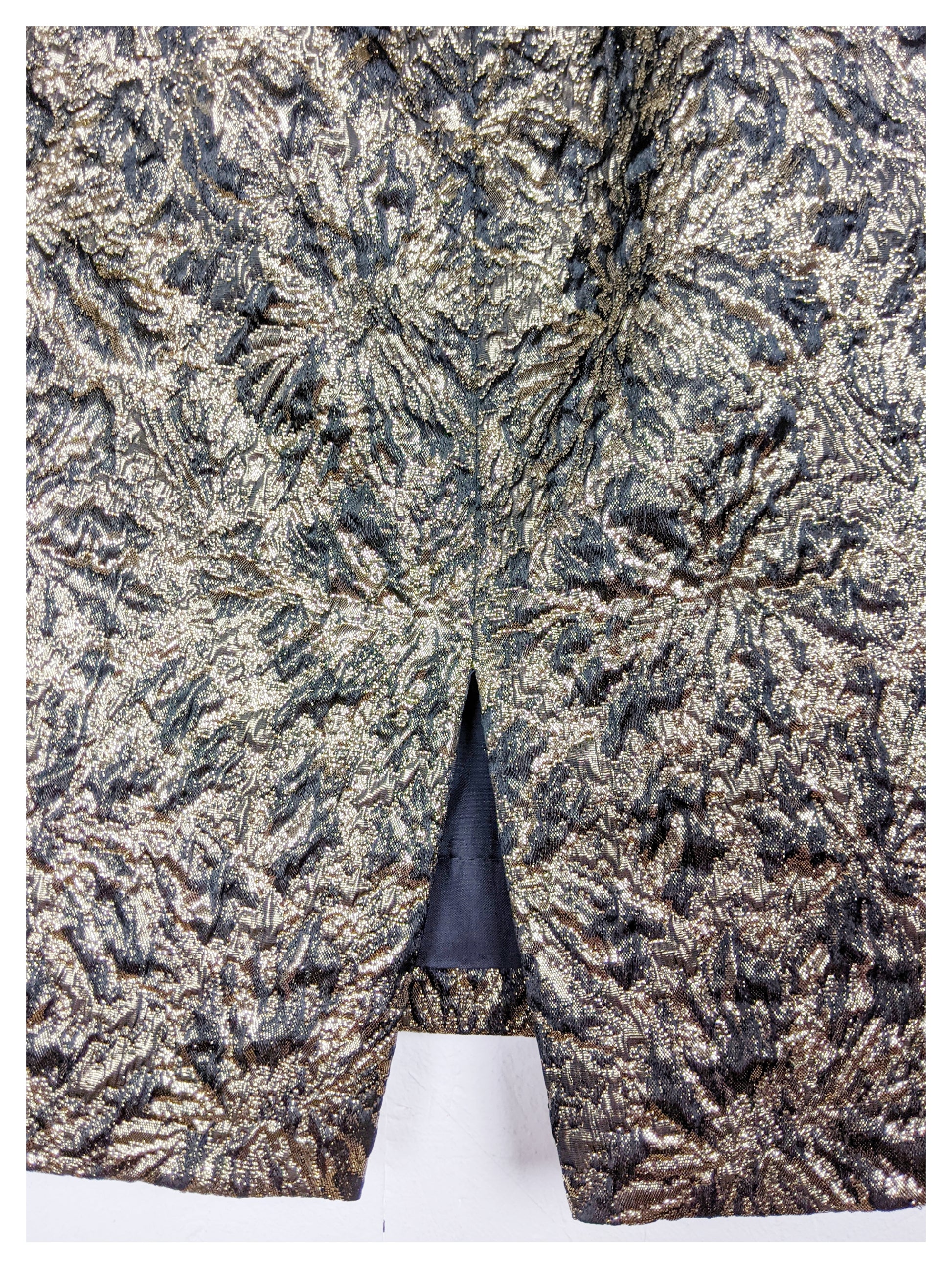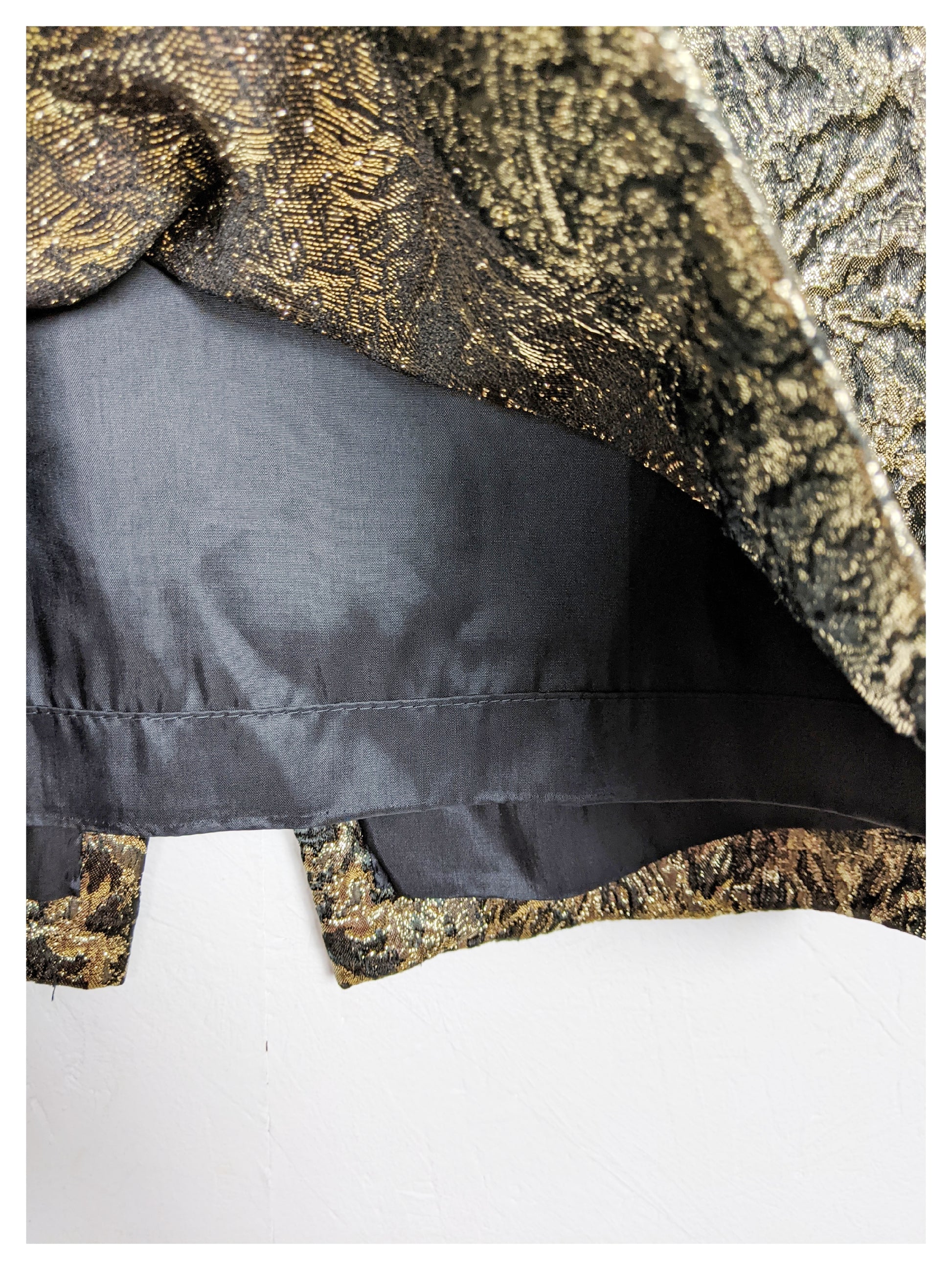 Très belle jupe dans un tissu gauffré, à motifs dans les tons noir et doré. Ceinturée à la taille avec fermeture éclaire dans le dos, terminée par une gros agrafe intérieure. Légèrement froncée en dessous, et bombée au niveau des hanches. Fendu à l'arrière. Entièrement doublée. J'avoue avoir une hésitation pour l'année de confection, mais elle doit datée des années 80, bien que le tissu face très 60's.
