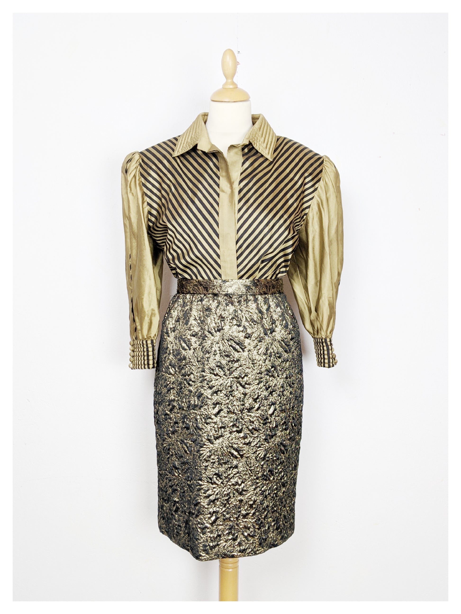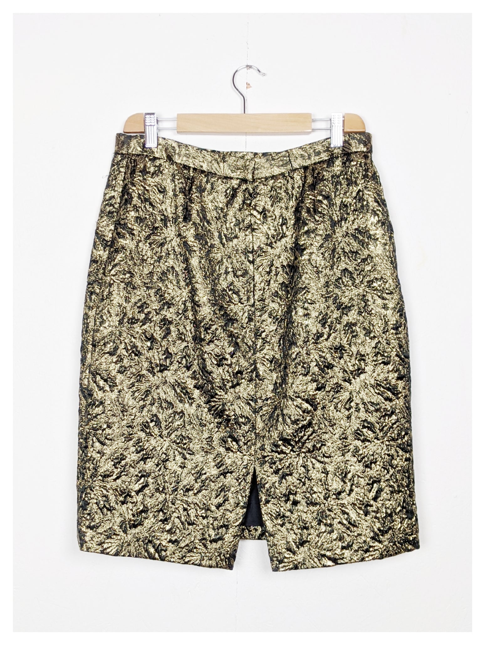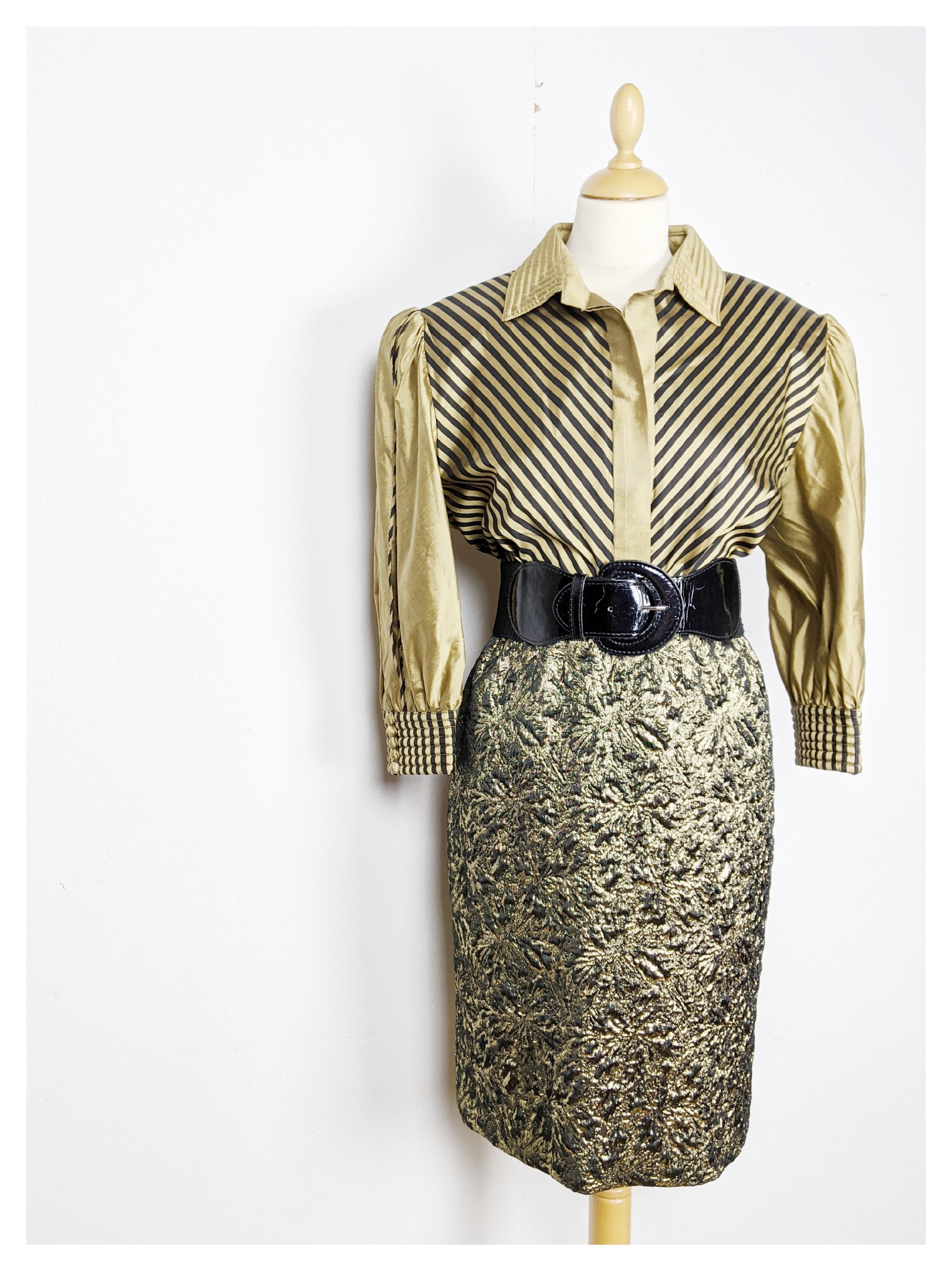 Très belle jupe dans un tissu gauffré, à motifs dans les tons noir et doré. Ceinturée à la taille avec fermeture éclaire dans le dos, terminée par une gros agrafe intérieure. Légèrement froncée en dessous, et bombée au niveau des hanches. Fendu à l'arrière. Entièrement doublée. J'avoue avoir une hésitation pour l'année de confection, mais elle doit datée des années 80, bien que le tissu face très 60's.