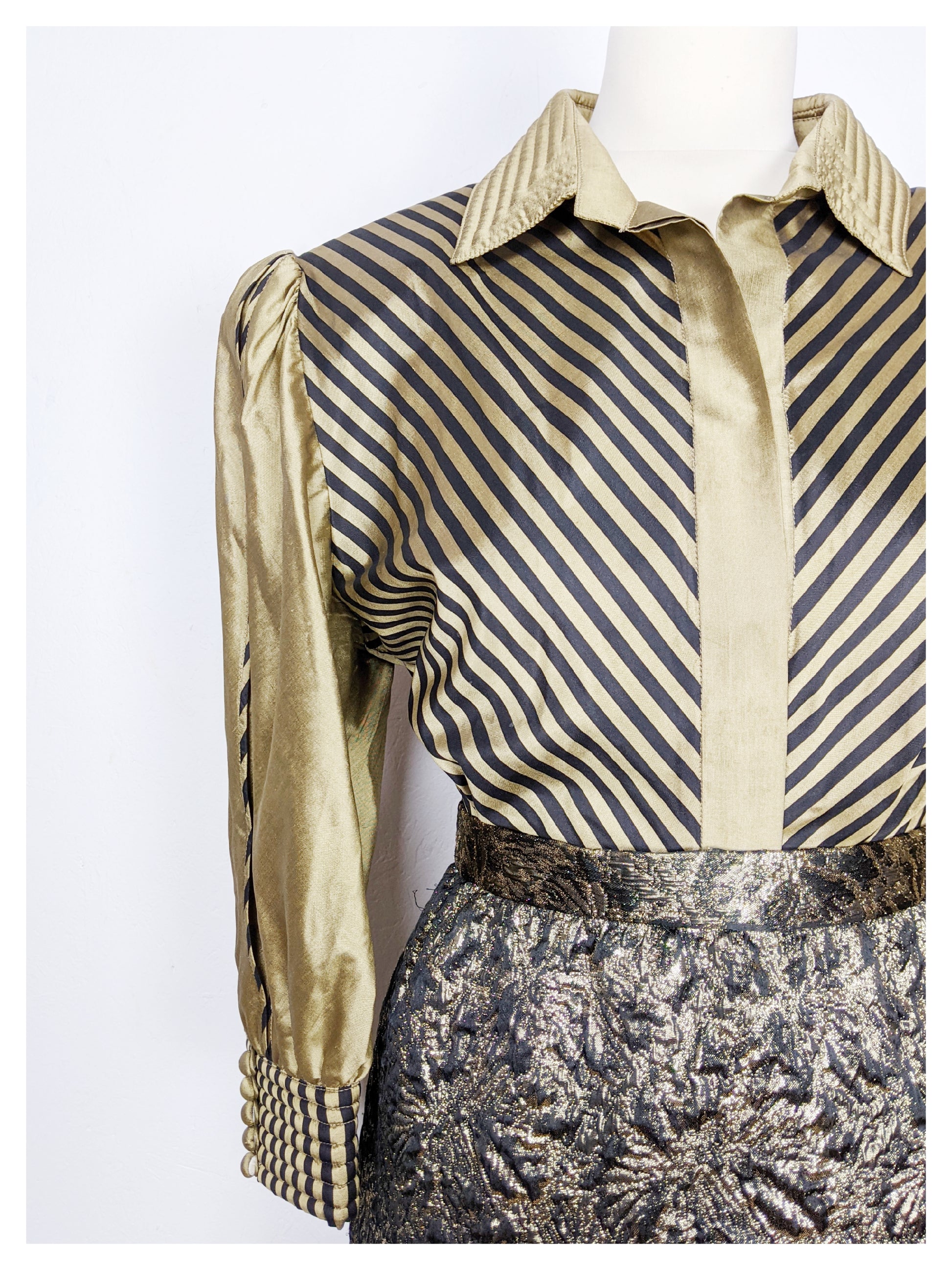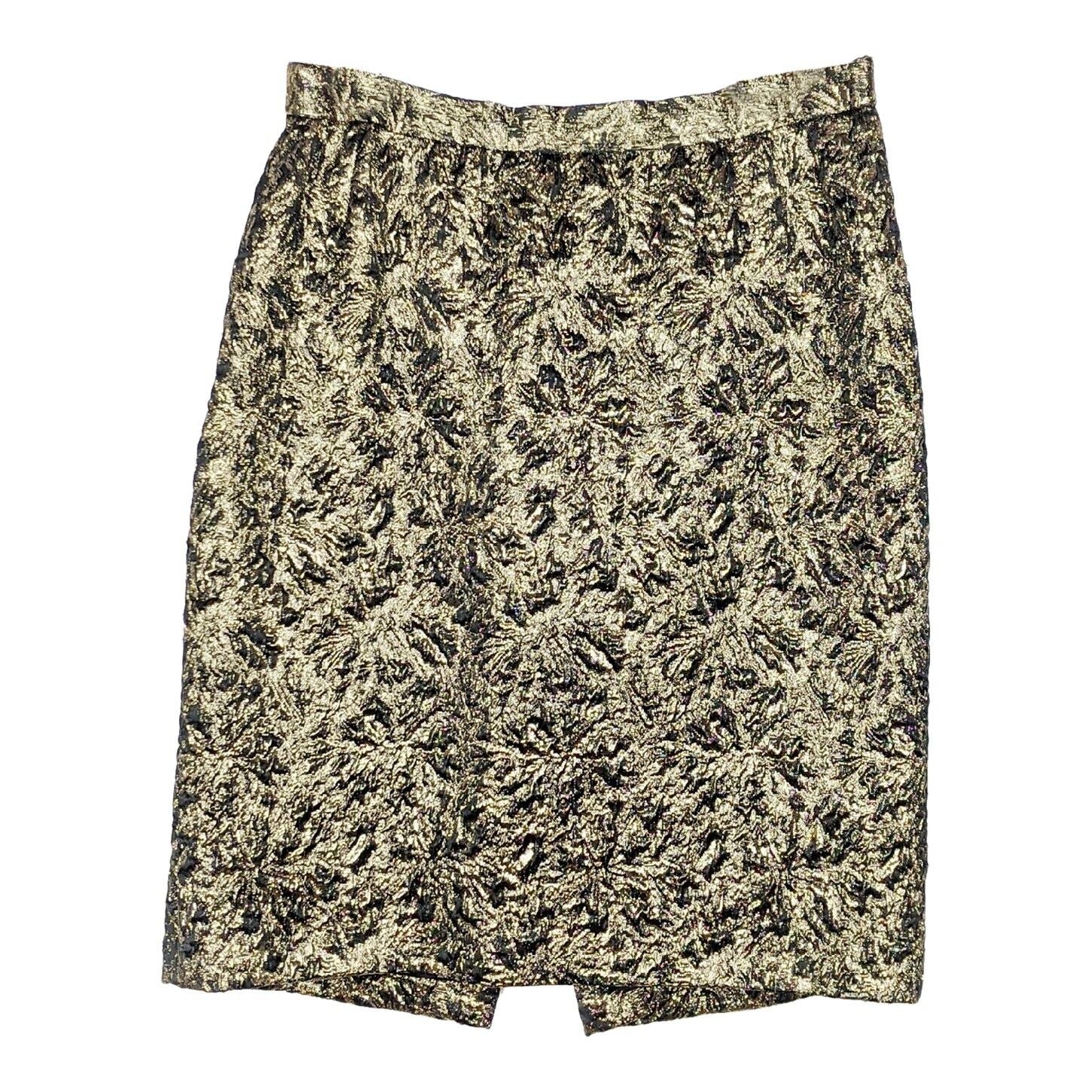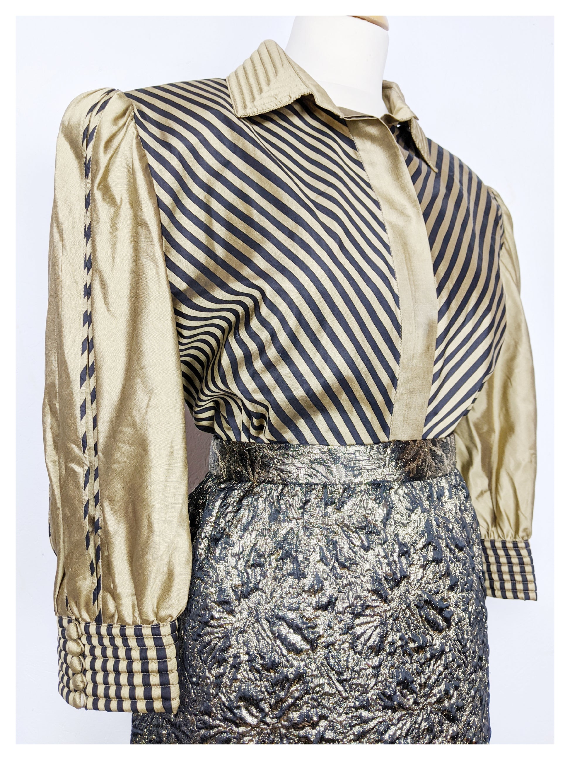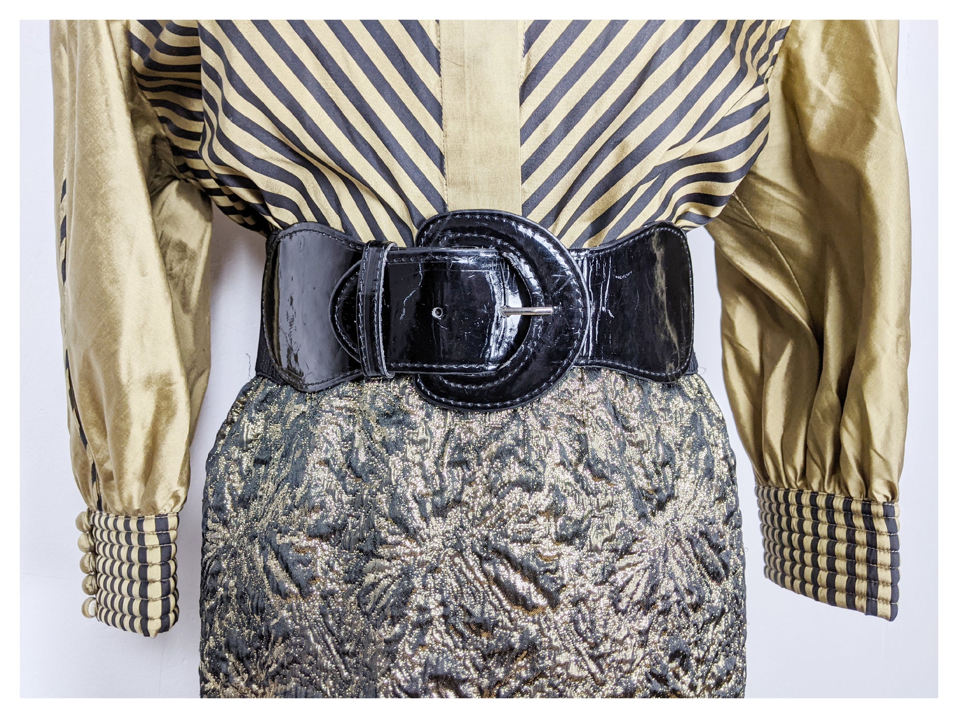 Très belle jupe dans un tissu gauffré, à motifs dans les tons noir et doré. Ceinturée à la taille avec fermeture éclaire dans le dos, terminée par une gros agrafe intérieure. Légèrement froncée en dessous, et bombée au niveau des hanches. Fendu à l'arrière. Entièrement doublée. J'avoue avoir une hésitation pour l'année de confection, mais elle doit datée des années 80, bien que le tissu face très 60's.