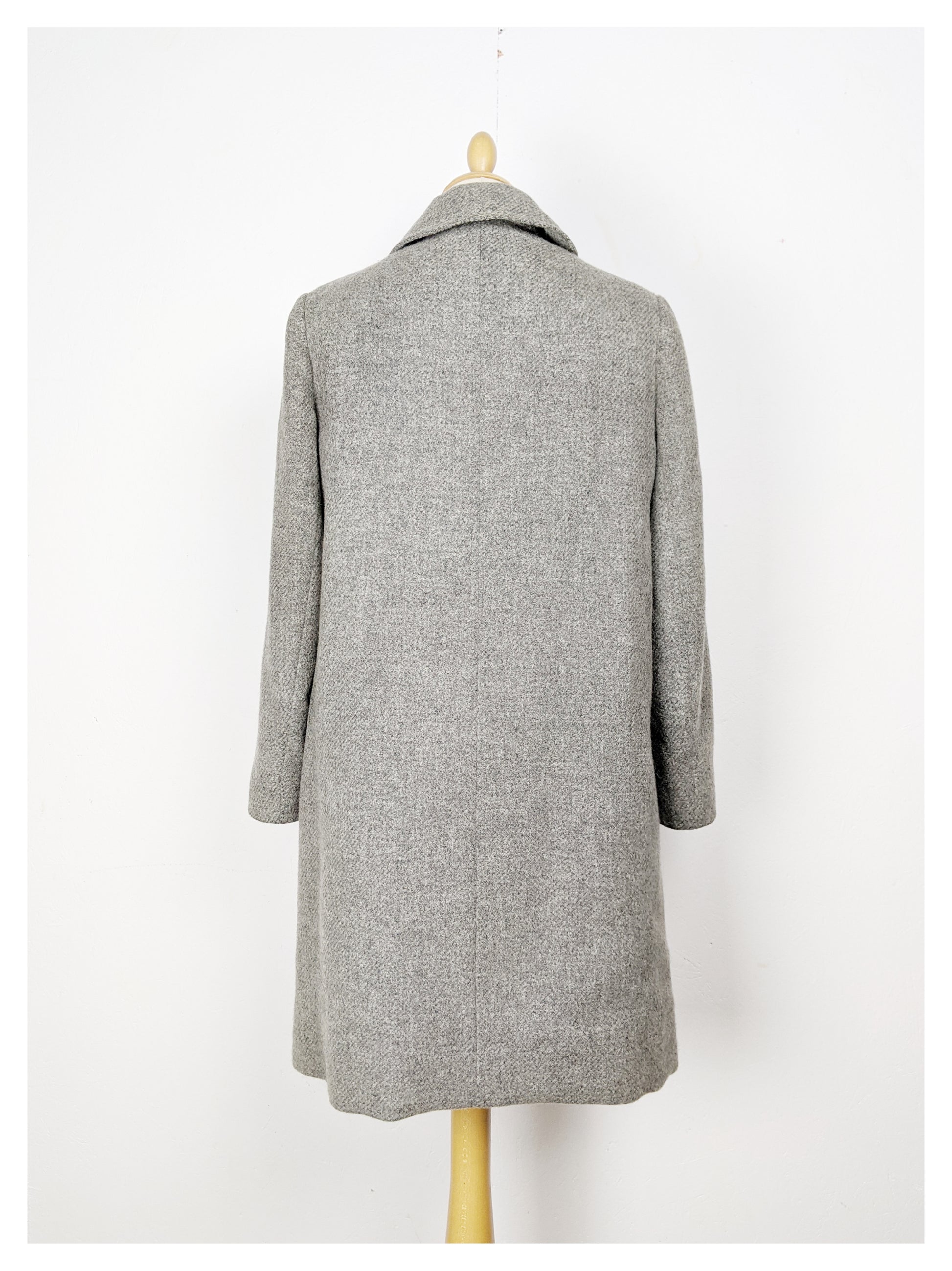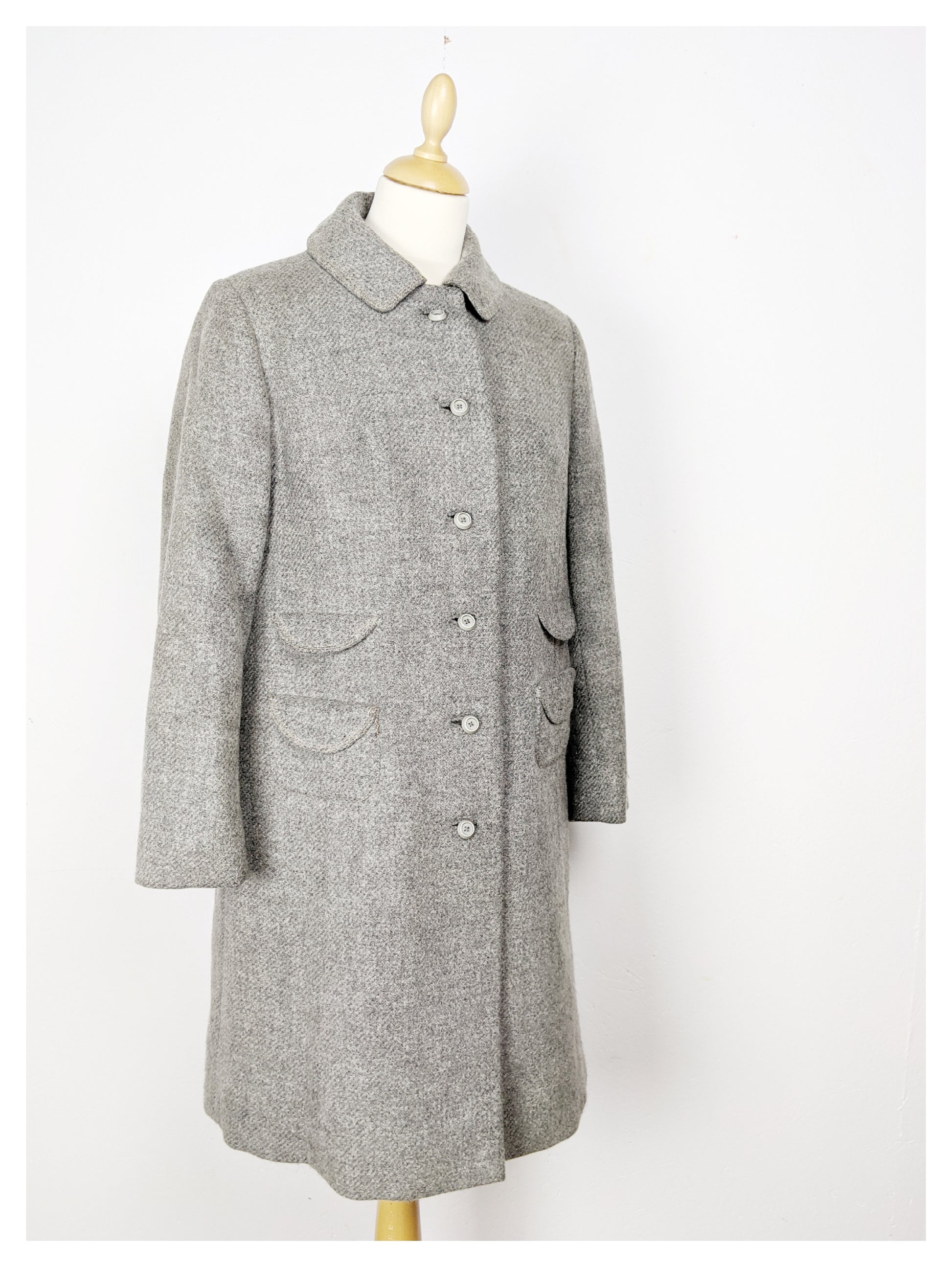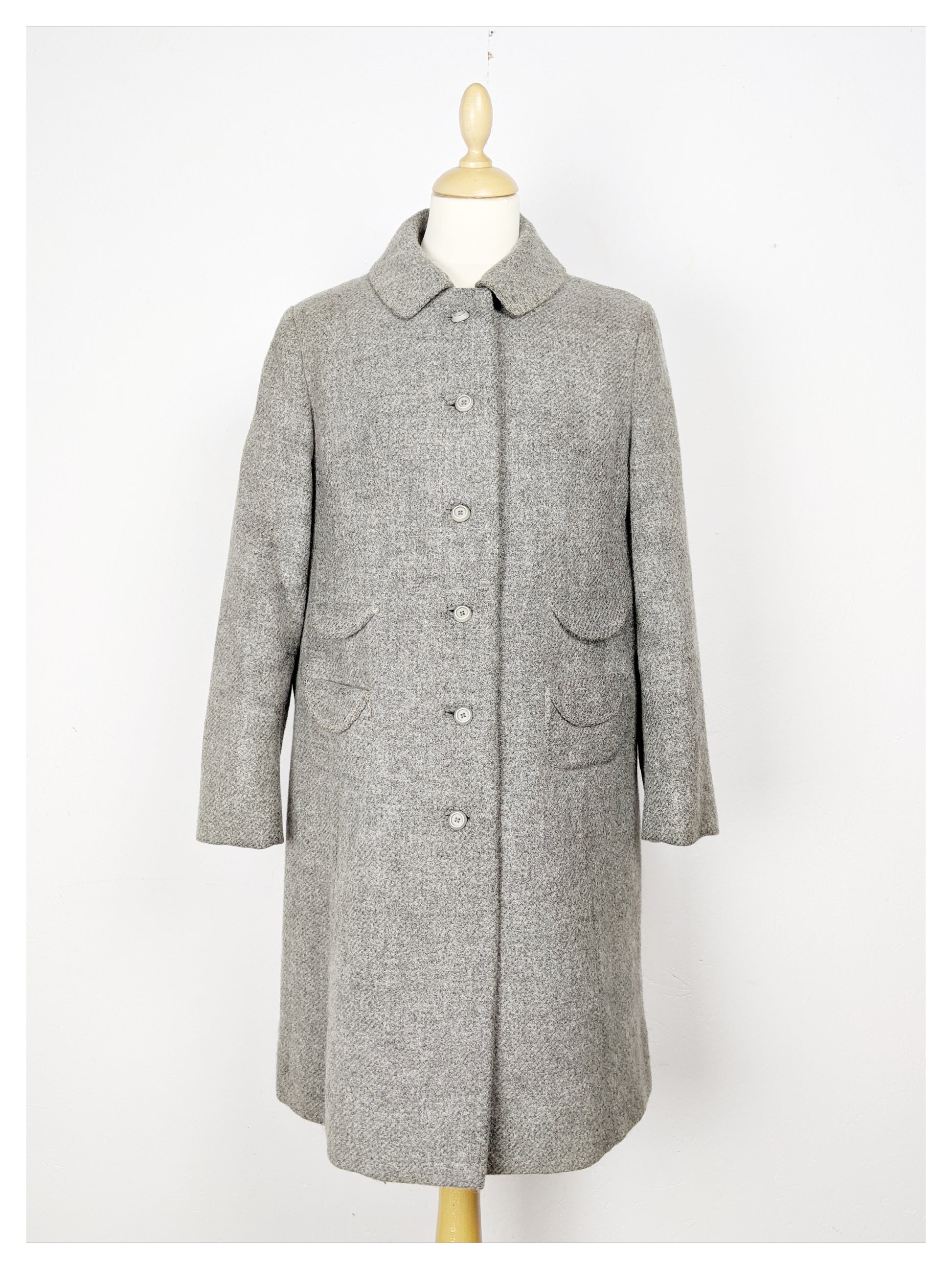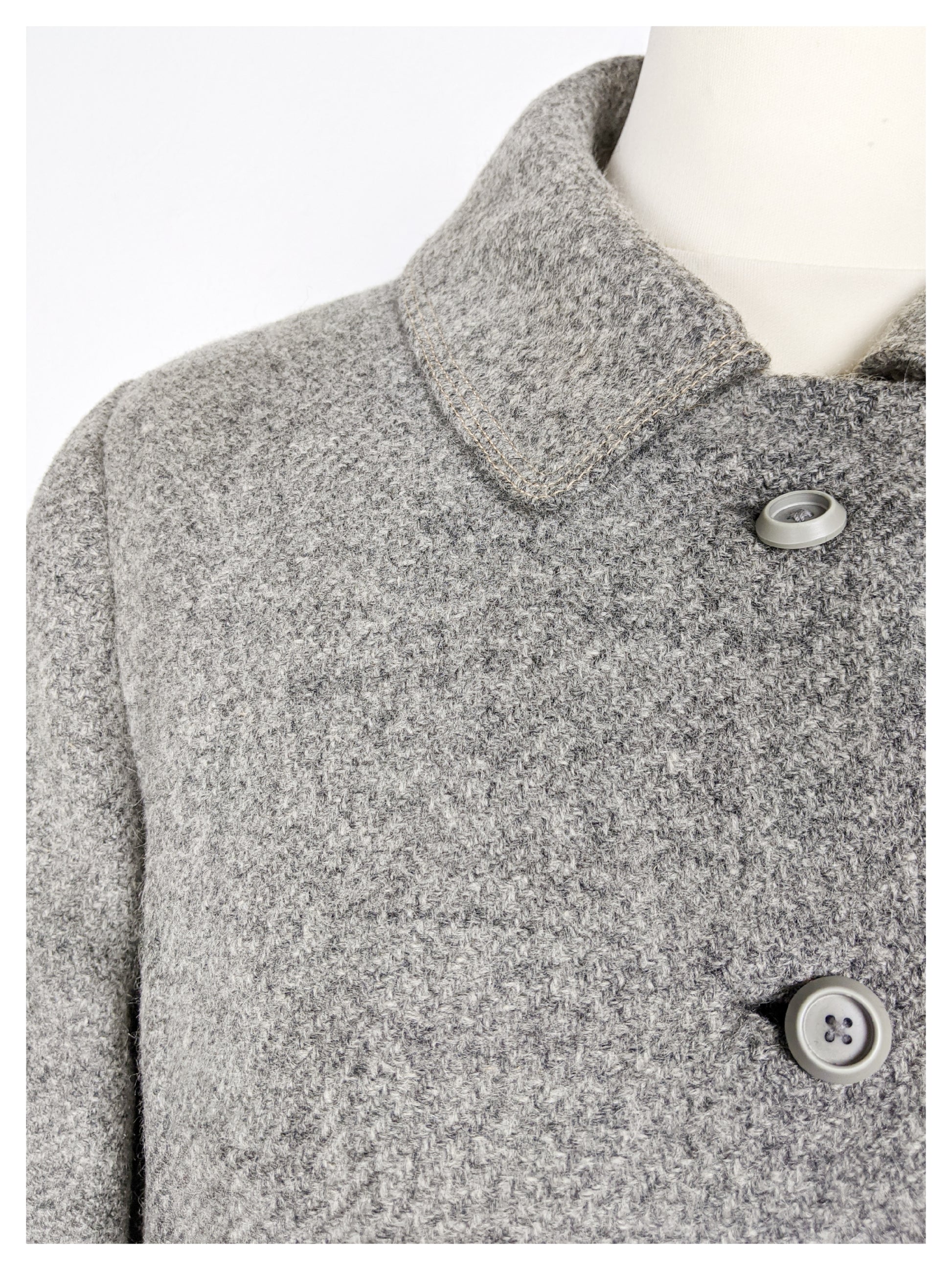Très joli manteau en laine d'un ton gris souris. Coupe droite, voire trapèze mais cintrée. Col chemisier, presque claudine avec petit bouton caché en dessous du col pour maintenir la fermeture. Fausses poches sur le devant, au dessus des poches plaquées avec faux rabats. Fermeture sur le devant avec six boutons gris. Entièrement doublée.