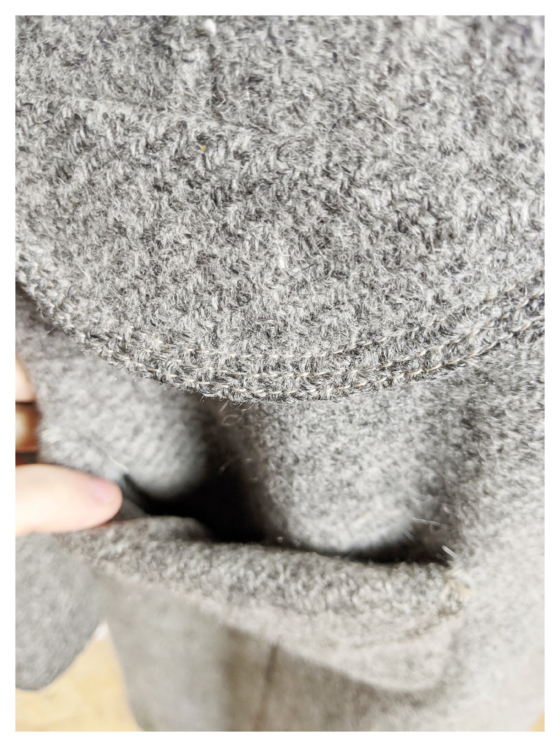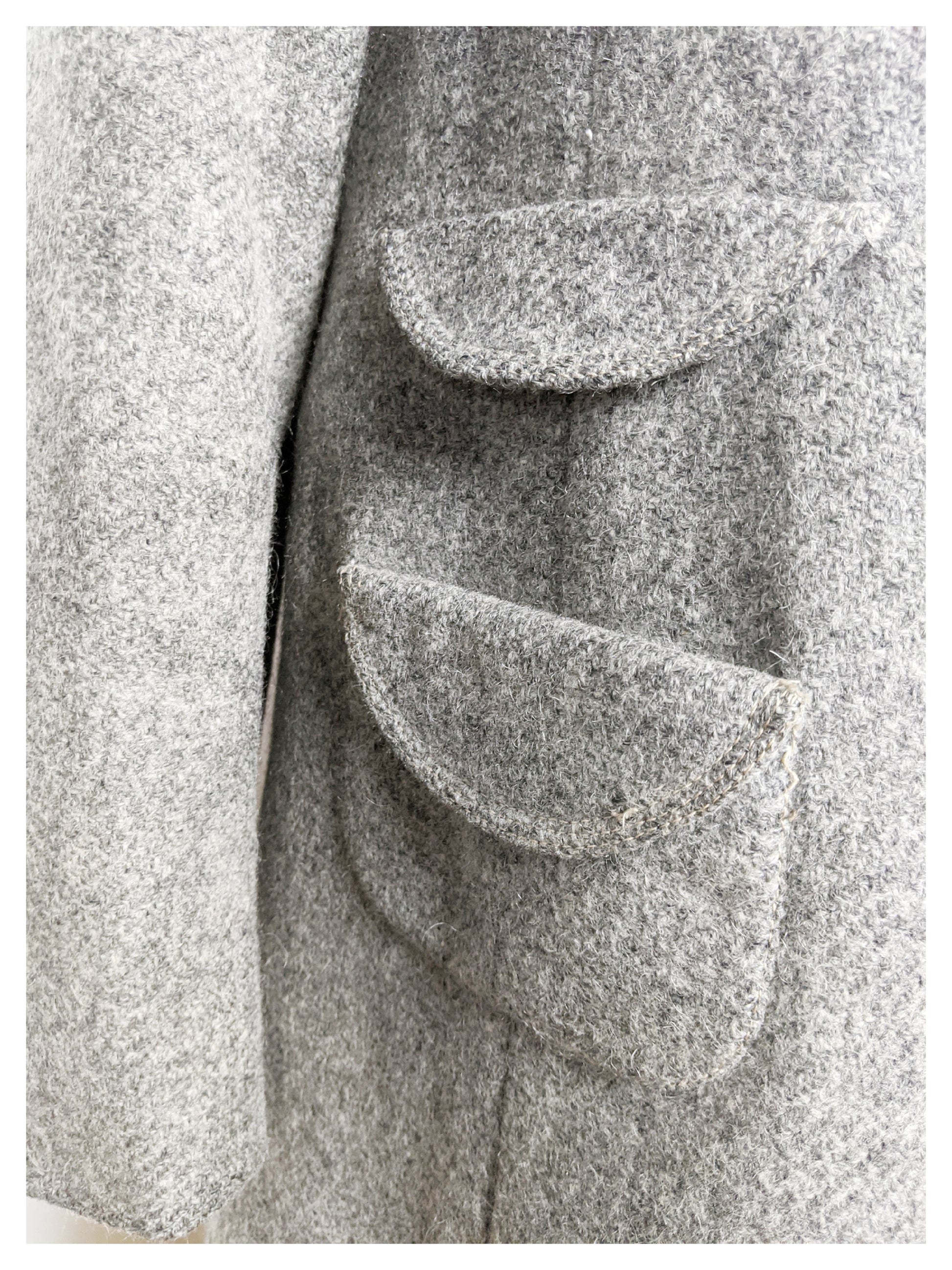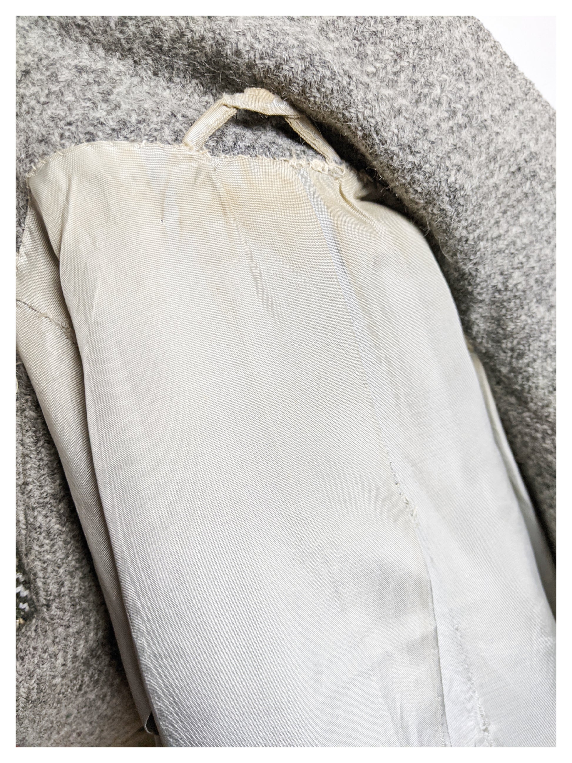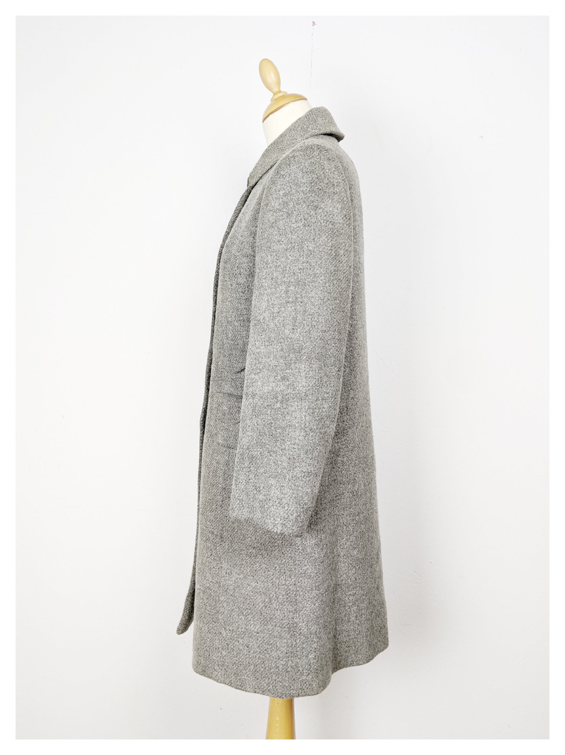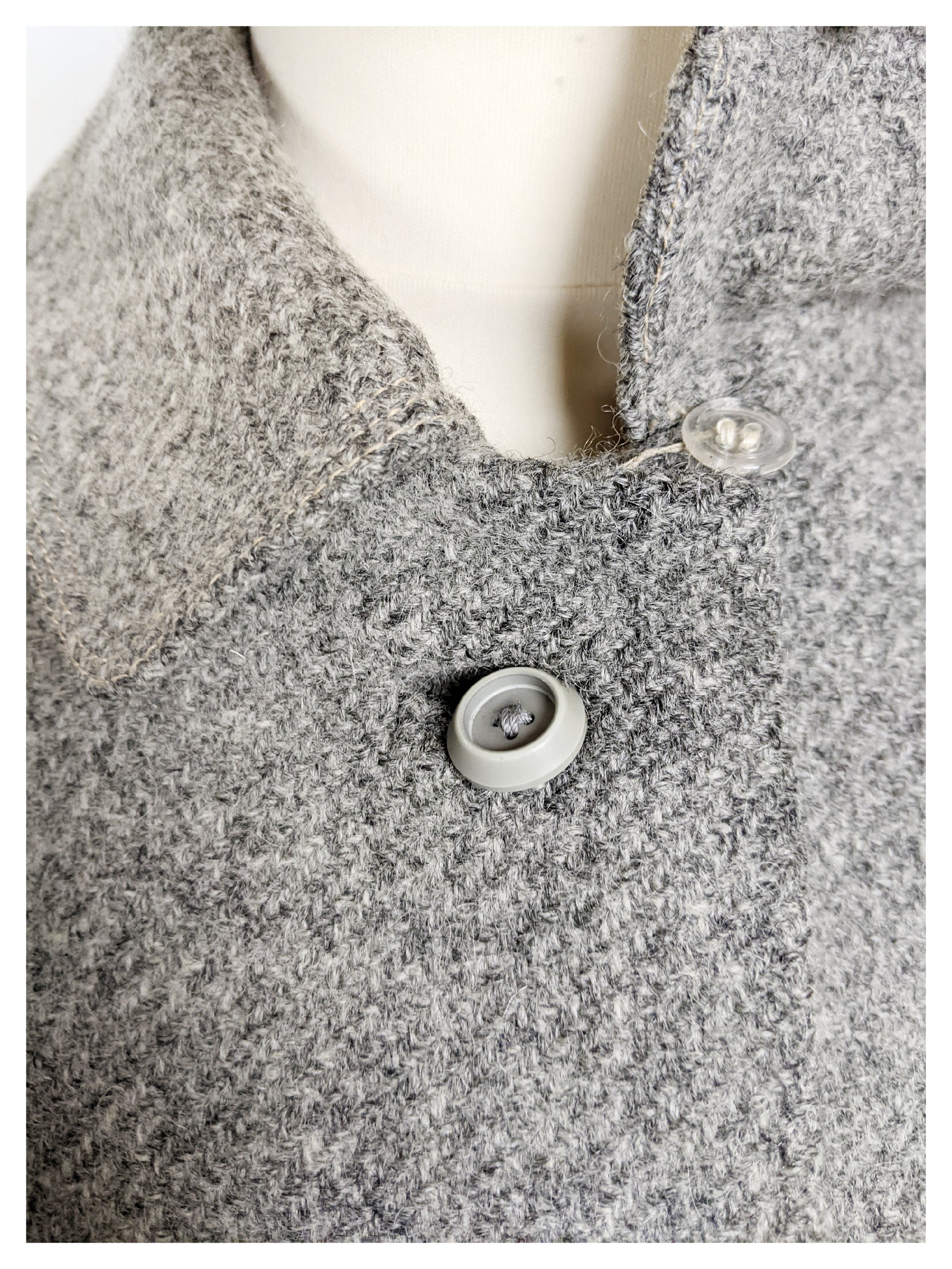 Très joli manteau en laine d'un ton gris souris. Coupe droite, voire trapèze mais cintrée. Col chemisier, presque claudine avec petit bouton caché en dessous du col pour maintenir la fermeture. Fausses poches sur le devant, au dessus des poches plaquées avec faux rabats. Fermeture sur le devant avec six boutons gris. Entièrement doublée.