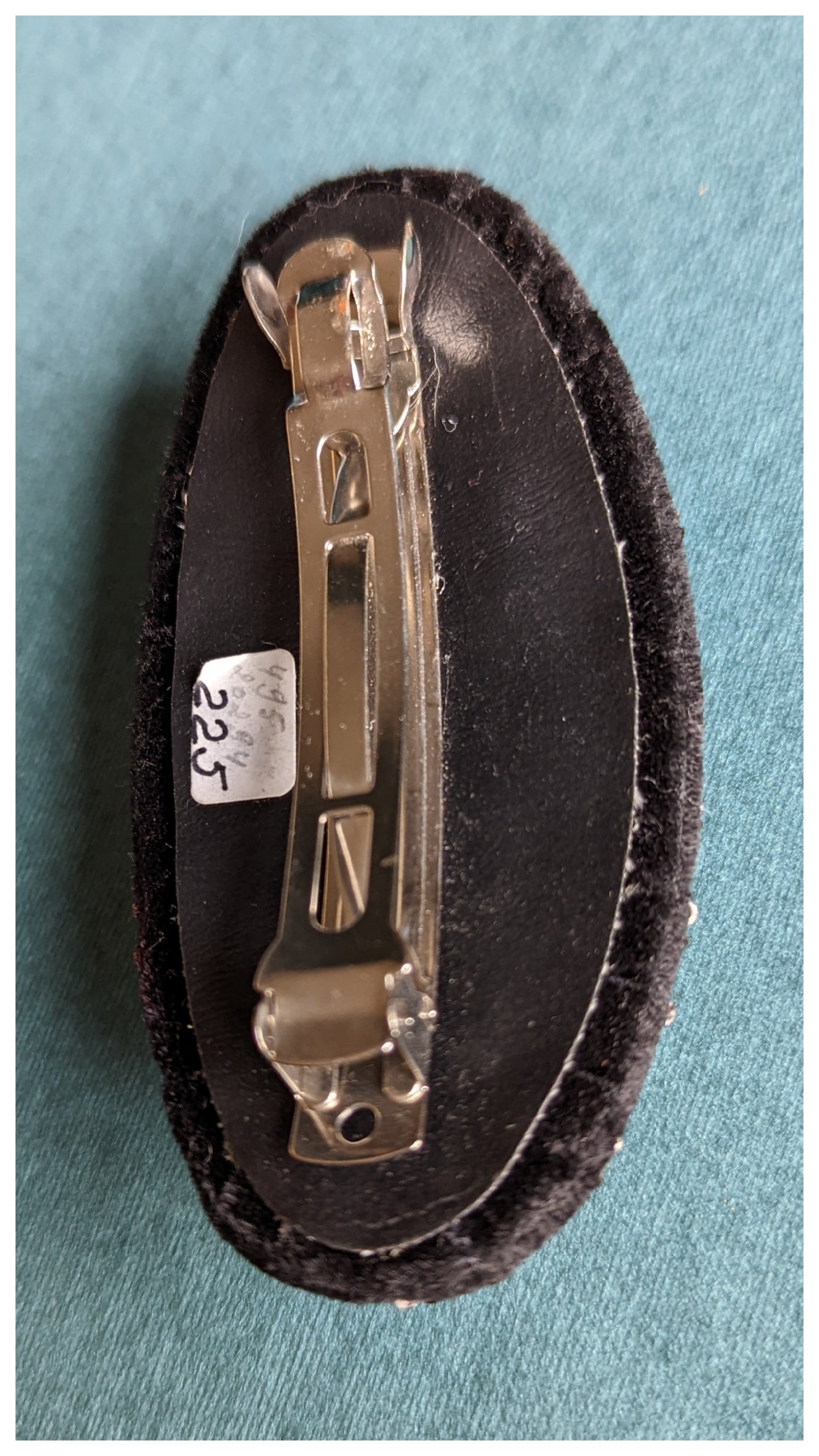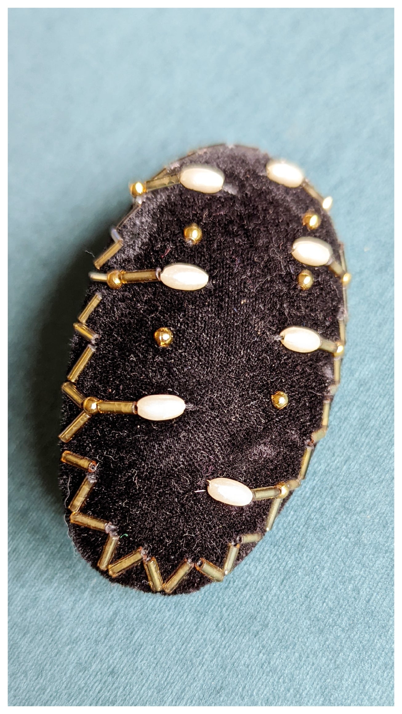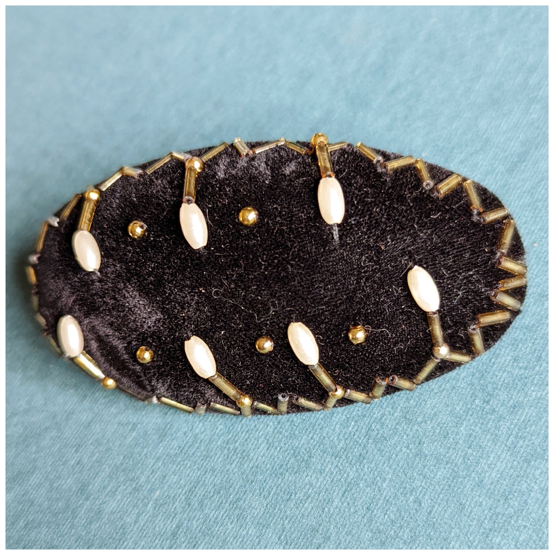 Grosse pince à cheveux en velour noir et perles nacrées et dorées, de forme ovale. Pince métalique.