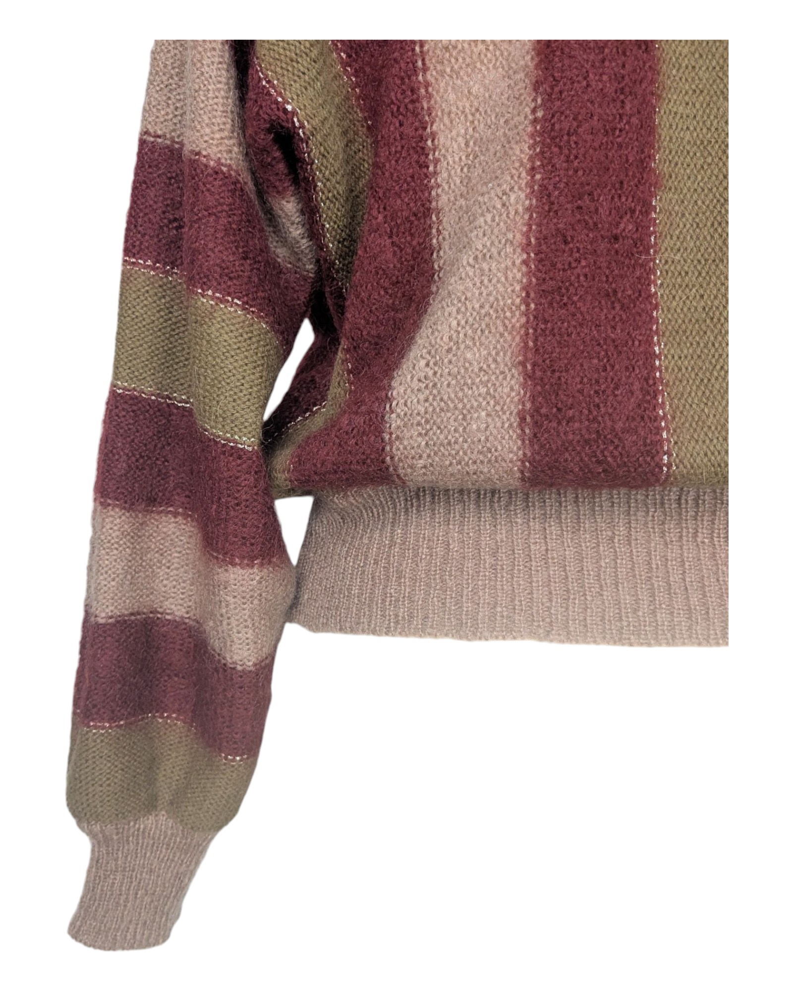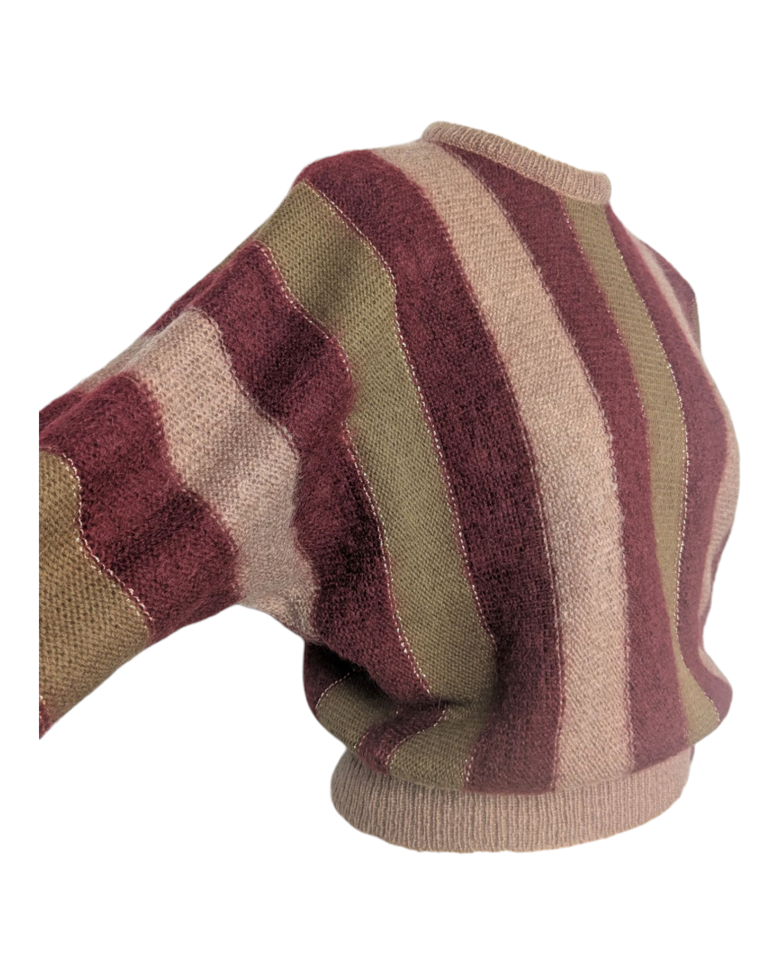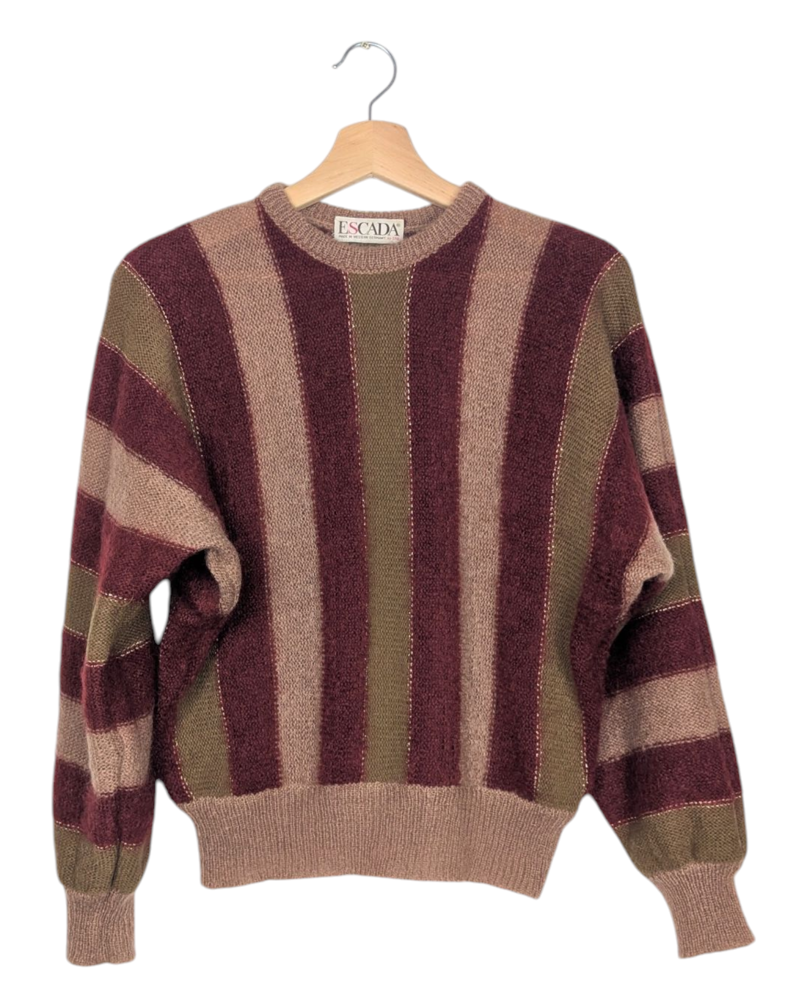 Très beau pull en laine, très douce, de la marque Escada. à lignes avec doré. Manches raglans et chauve-souris. Serré aux poignets et à la taille.