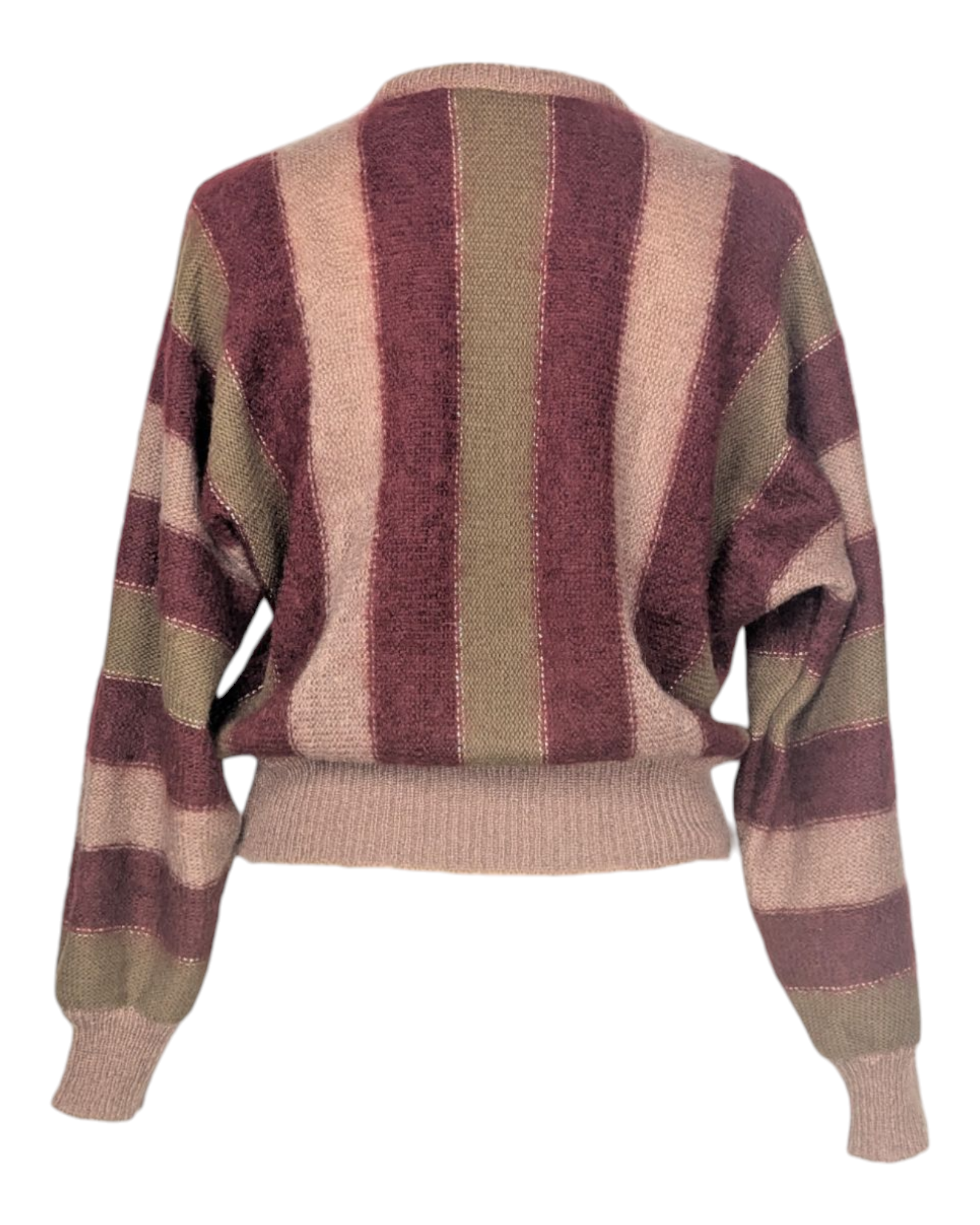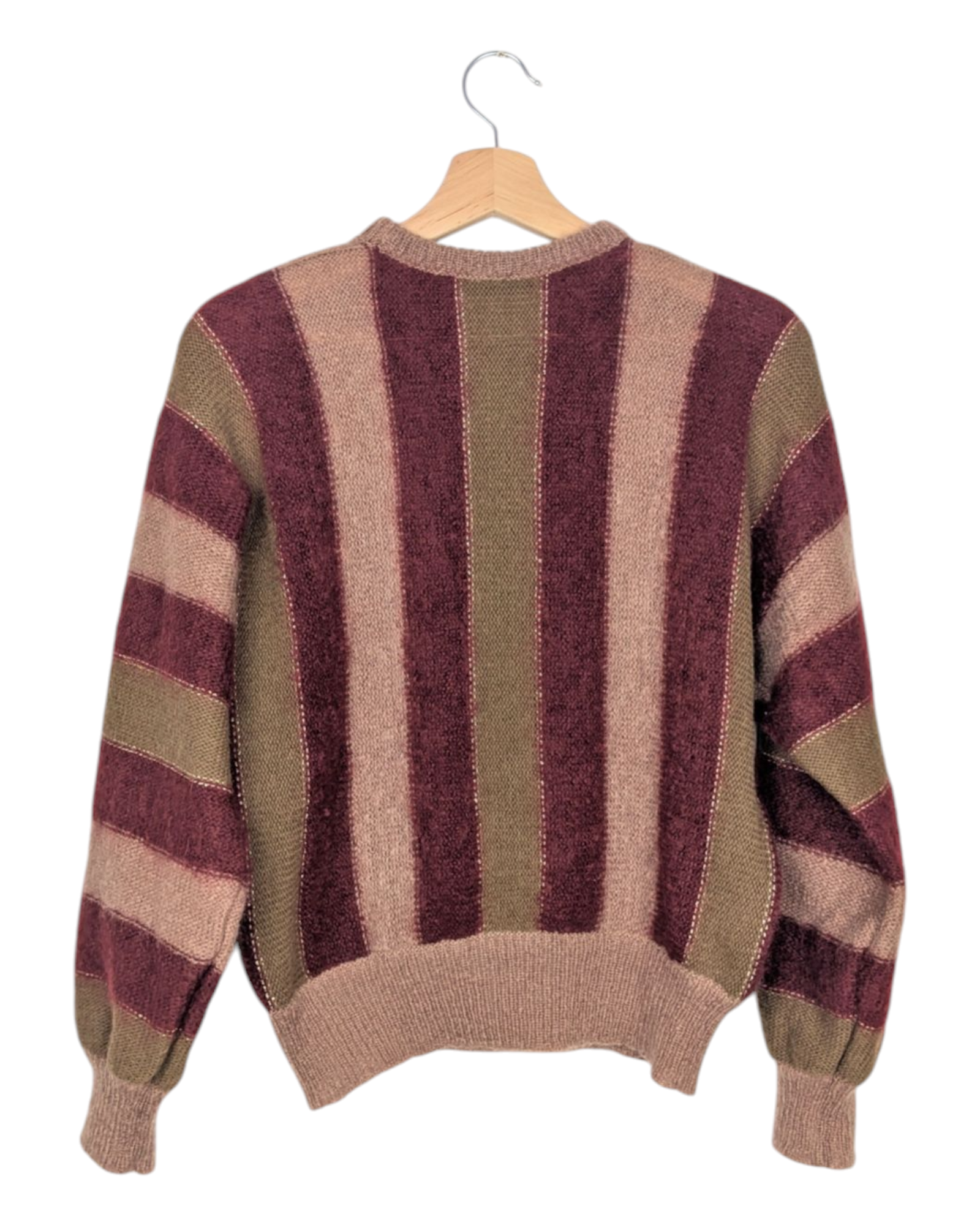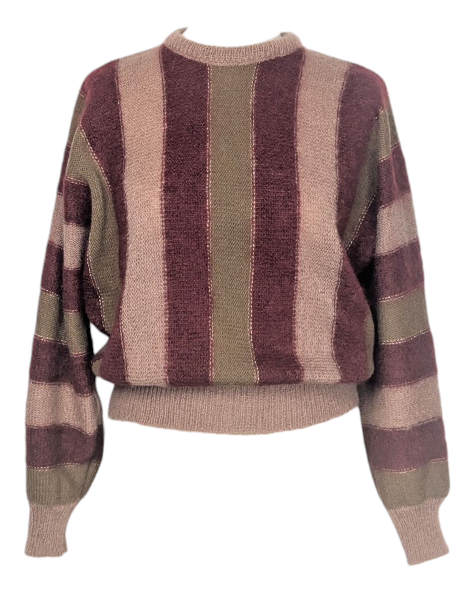 Très beau pull en laine, très douce, de la marque Escada. à lignes avec doré. Manches raglans et chauve-souris. Serré aux poignets et à la taille.