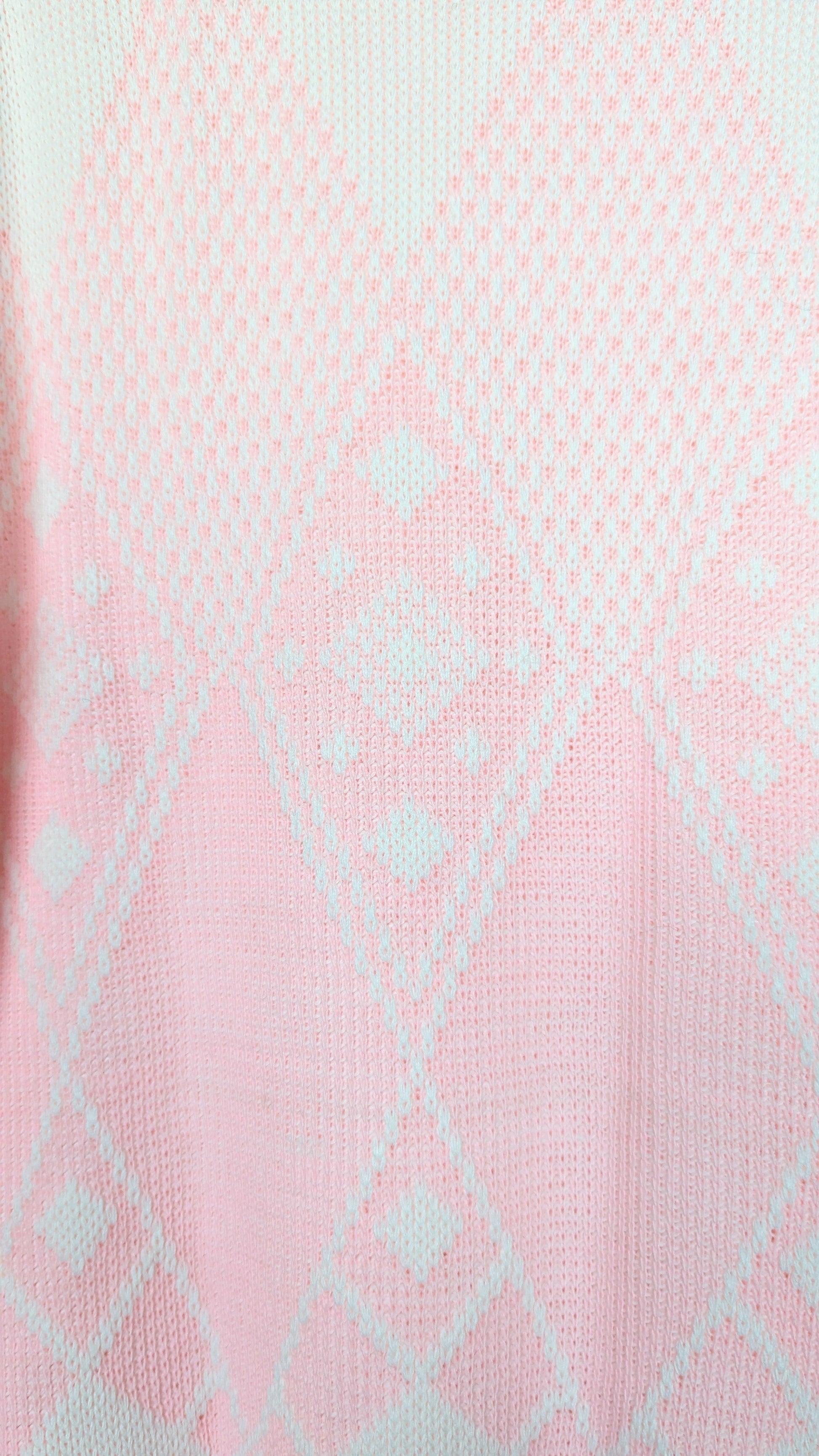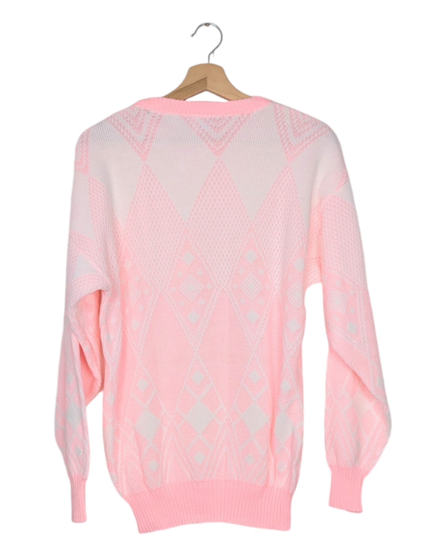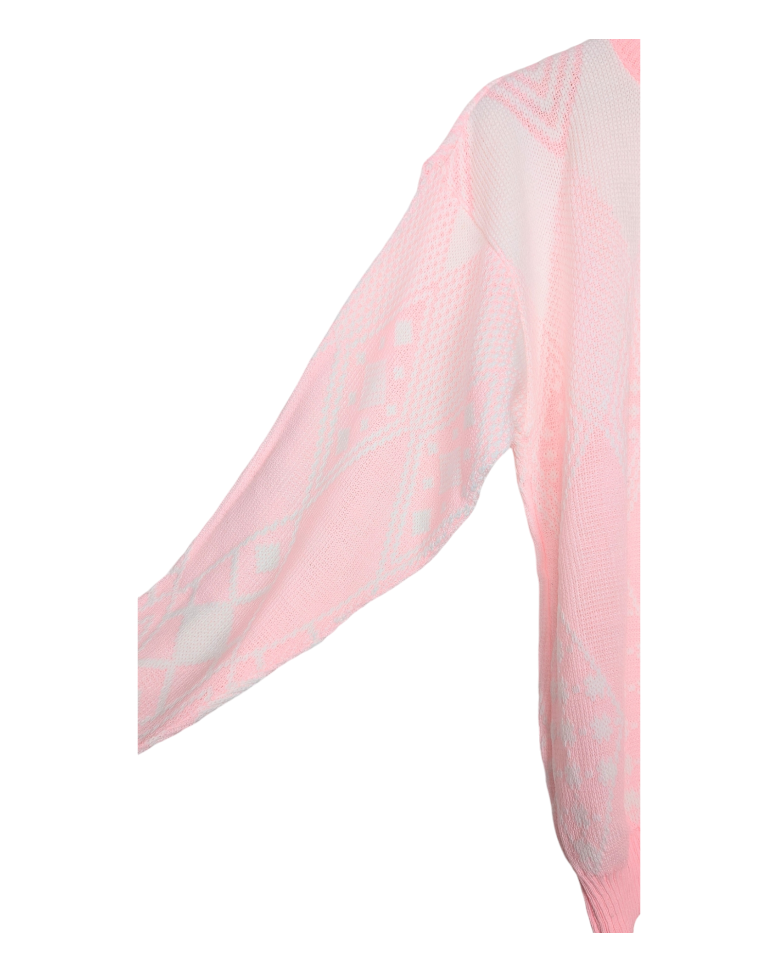Joli pull rose fluoo et blanc avec motifs géométriques. Col rond, manches longues. Resserré à la taille et aux poignets.