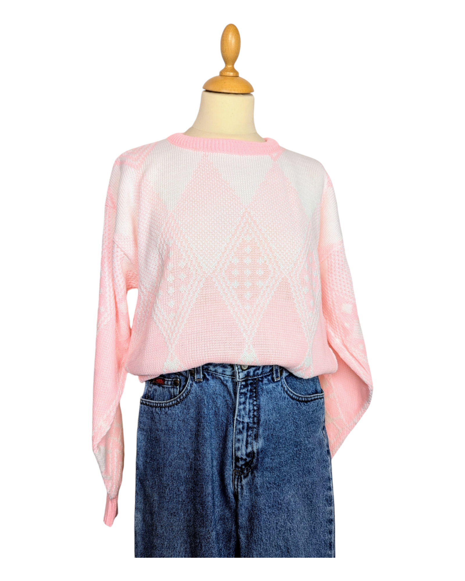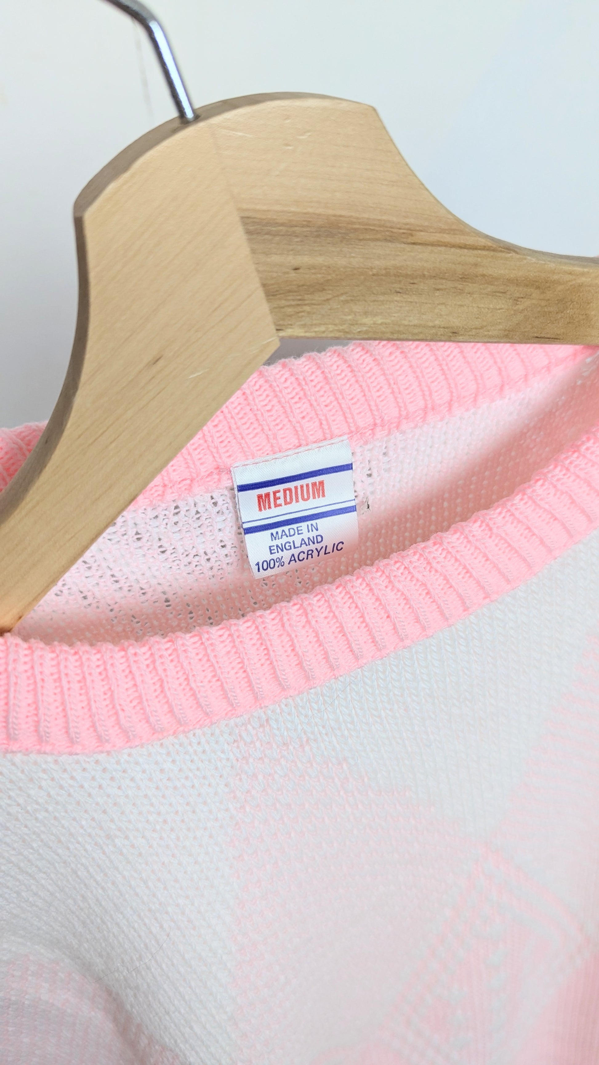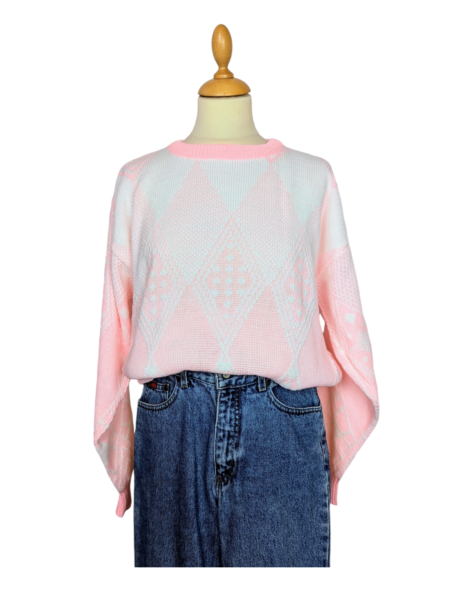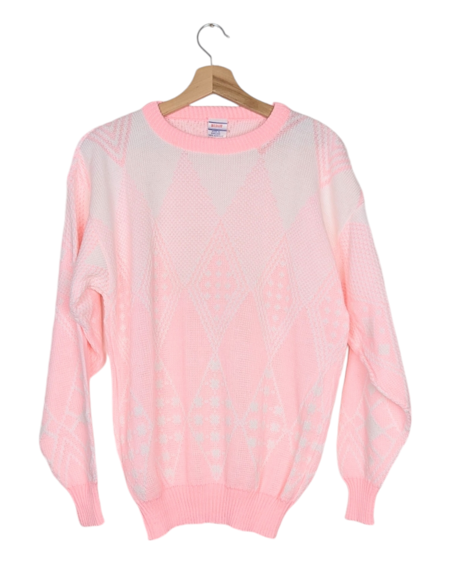 Joli pull rose fluoo et blanc avec motifs géométriques. Col rond, manches longues. Resserré à la taille et aux poignets.