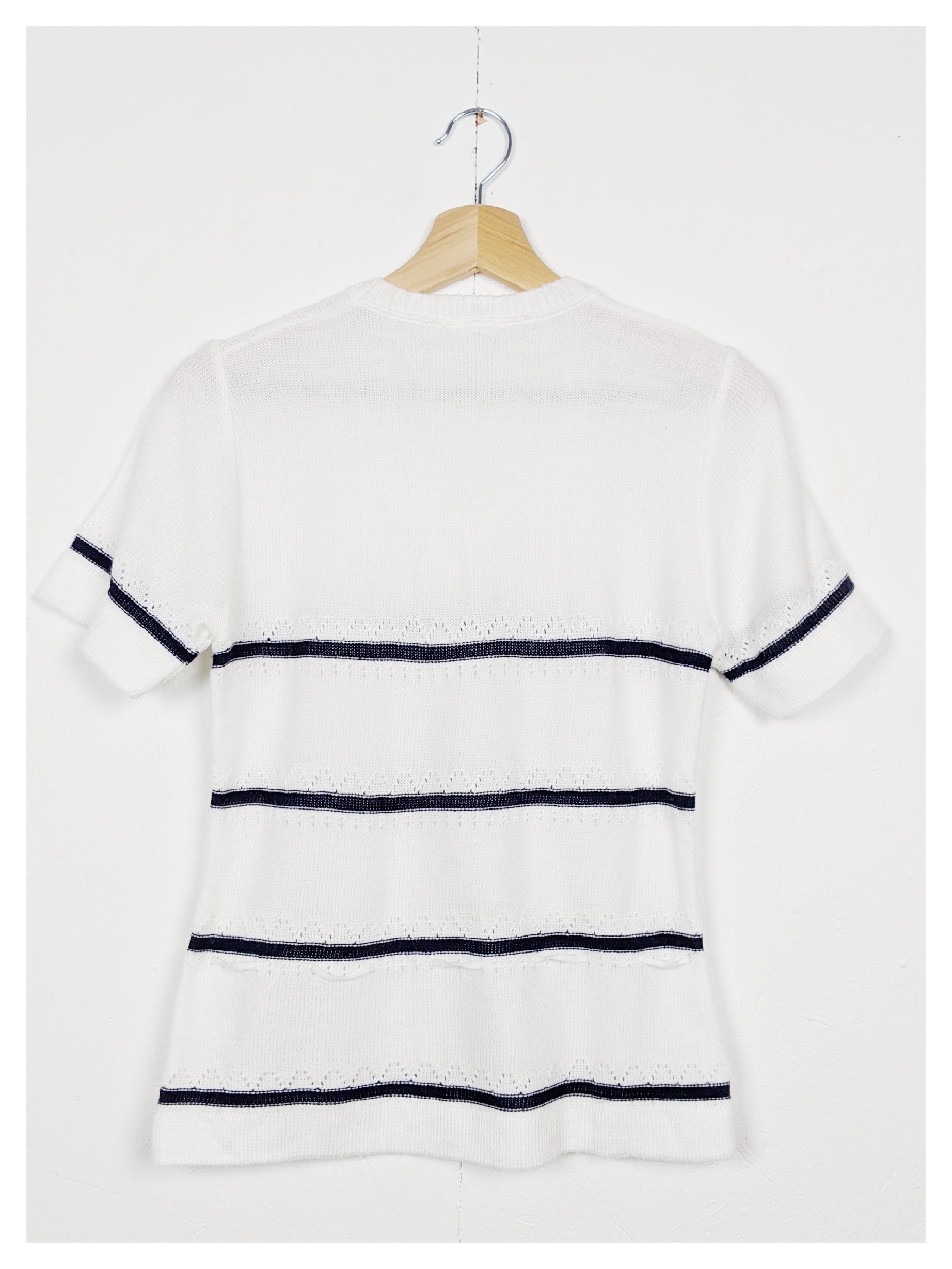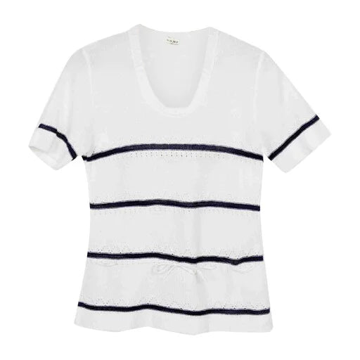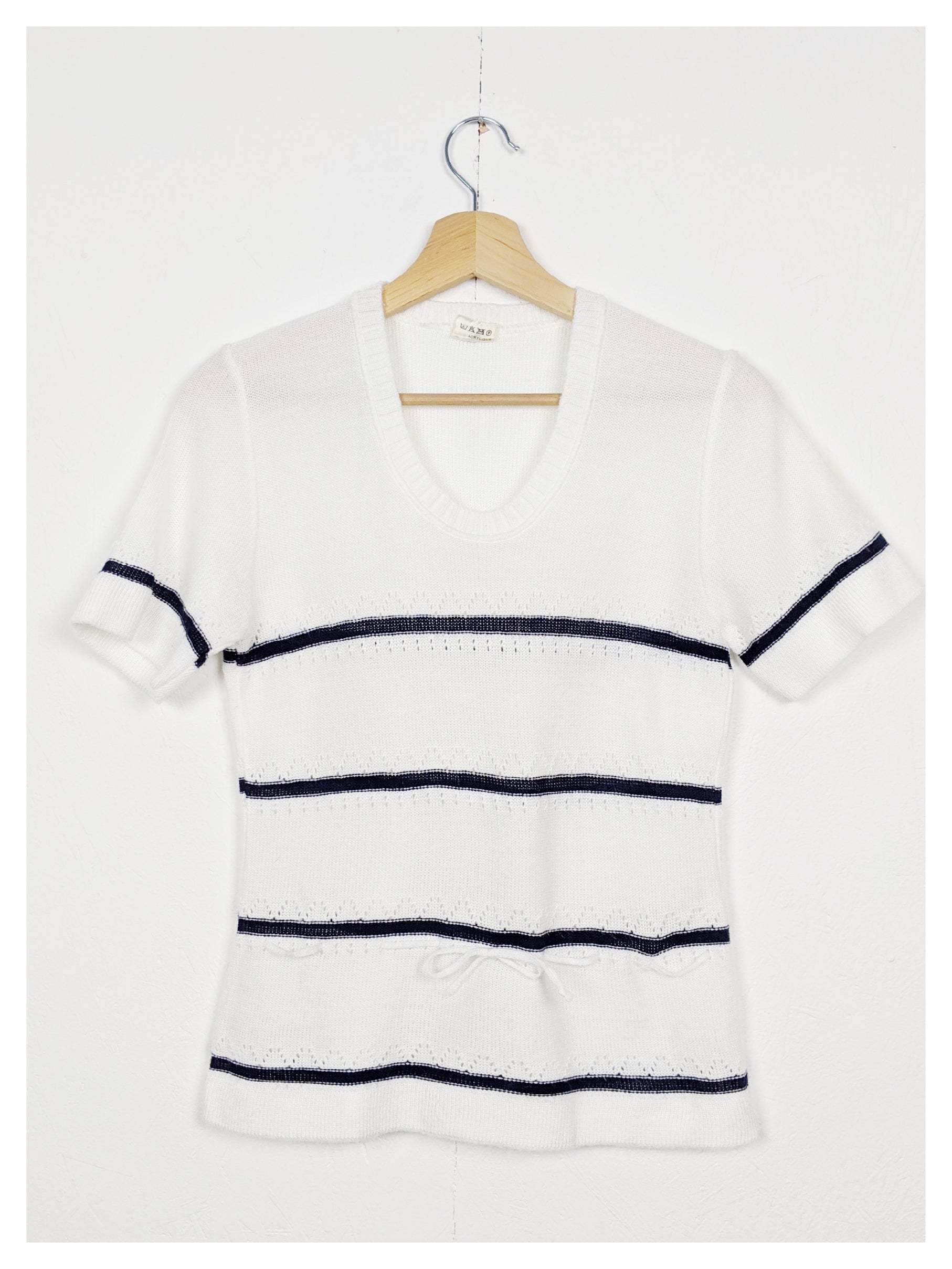 Joli petit pull d'été en tricot à motifs et ligné dans les tons blanc et bleu marine. Col rond, manches courtes. Coupe cintrée avec une petite ceinture-cordon qui peut être resserrer à la taille. Trop féminin !