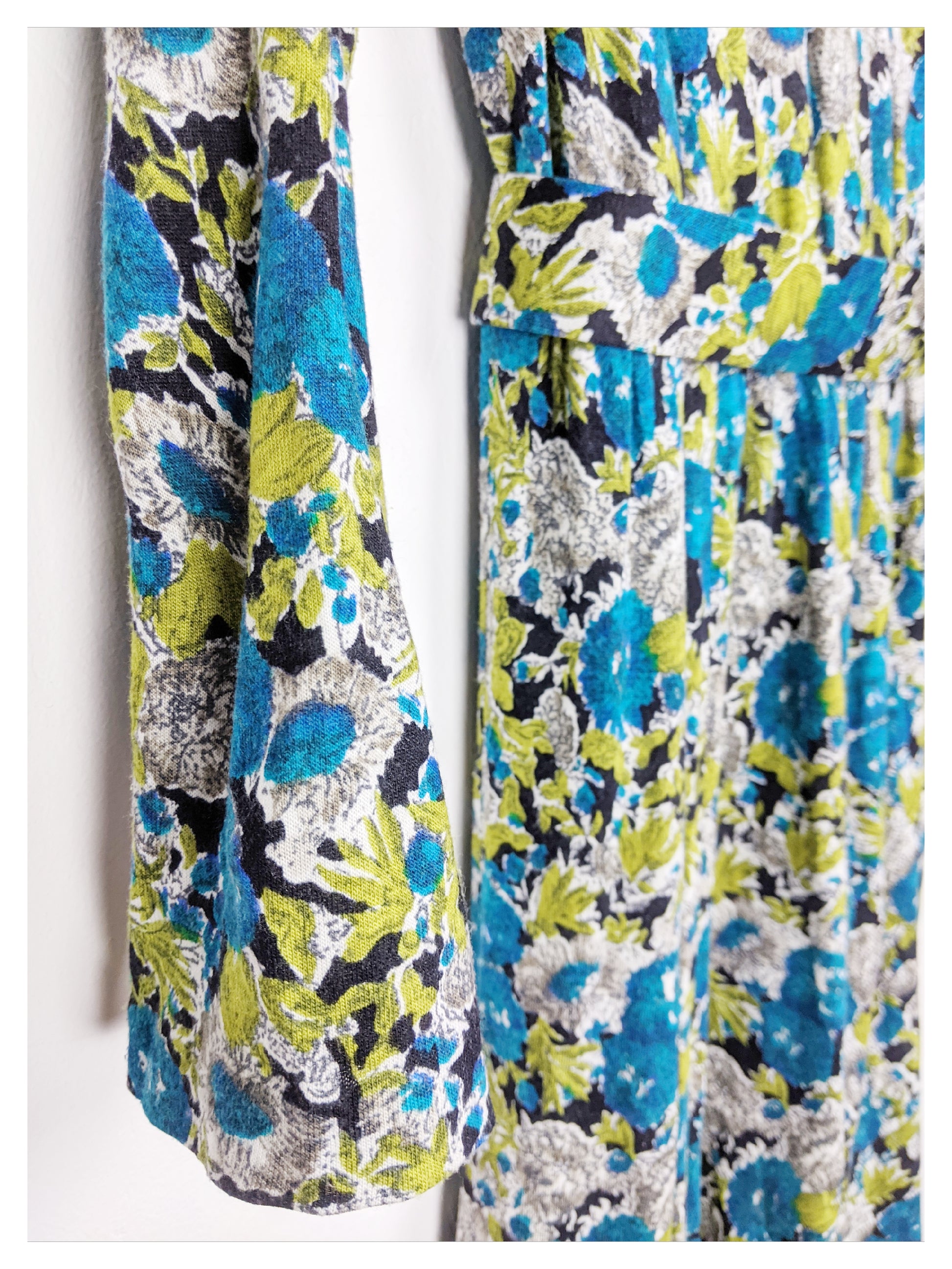 Dimensions : 62 cm de longueur de manches, 39 cm de carrure, 96 cm de tour de poitrine, de 70 à 100 cm de tour de taille, 114 cm de long. Ceinture : de 76 à 84 cm de long.