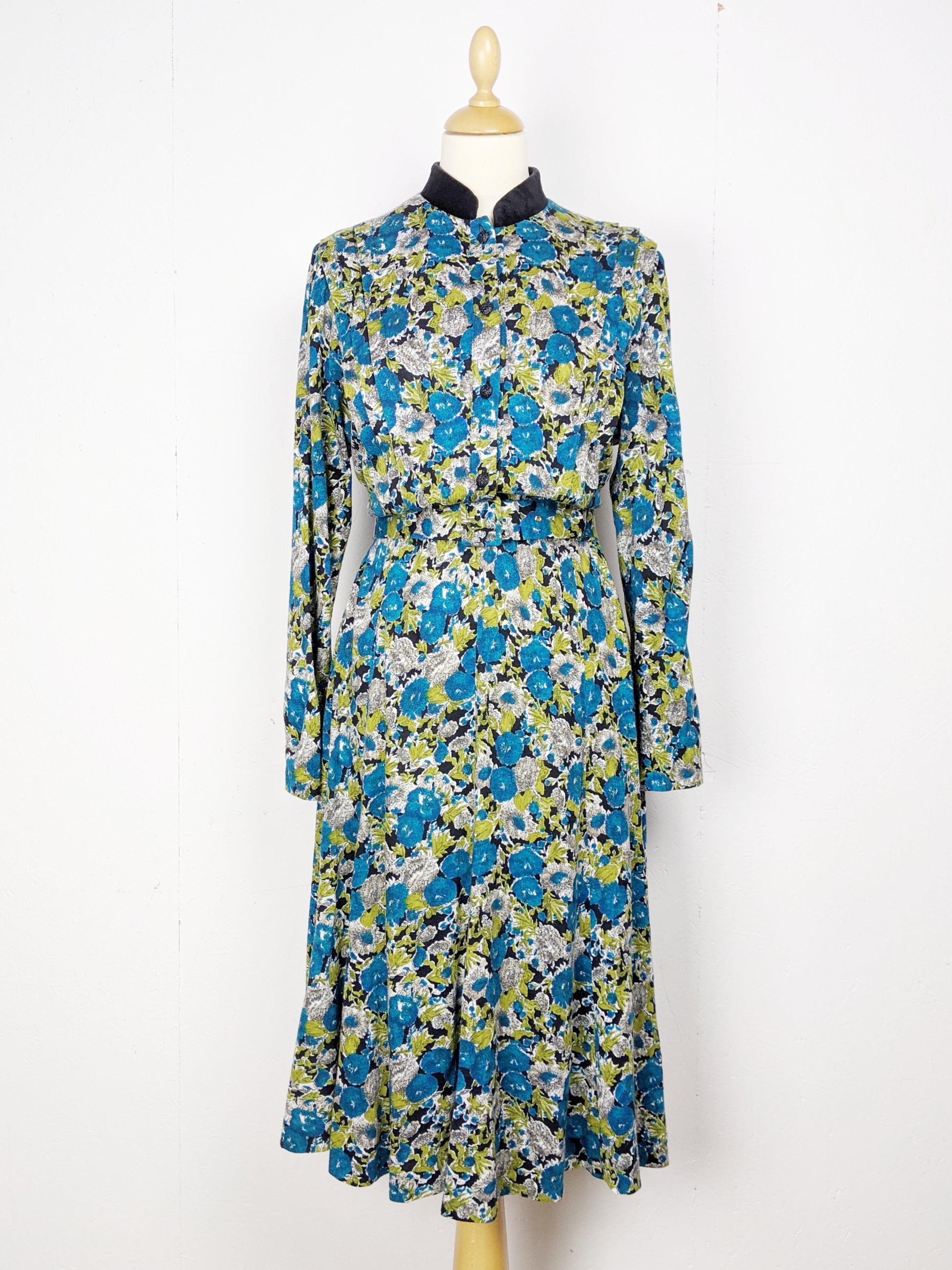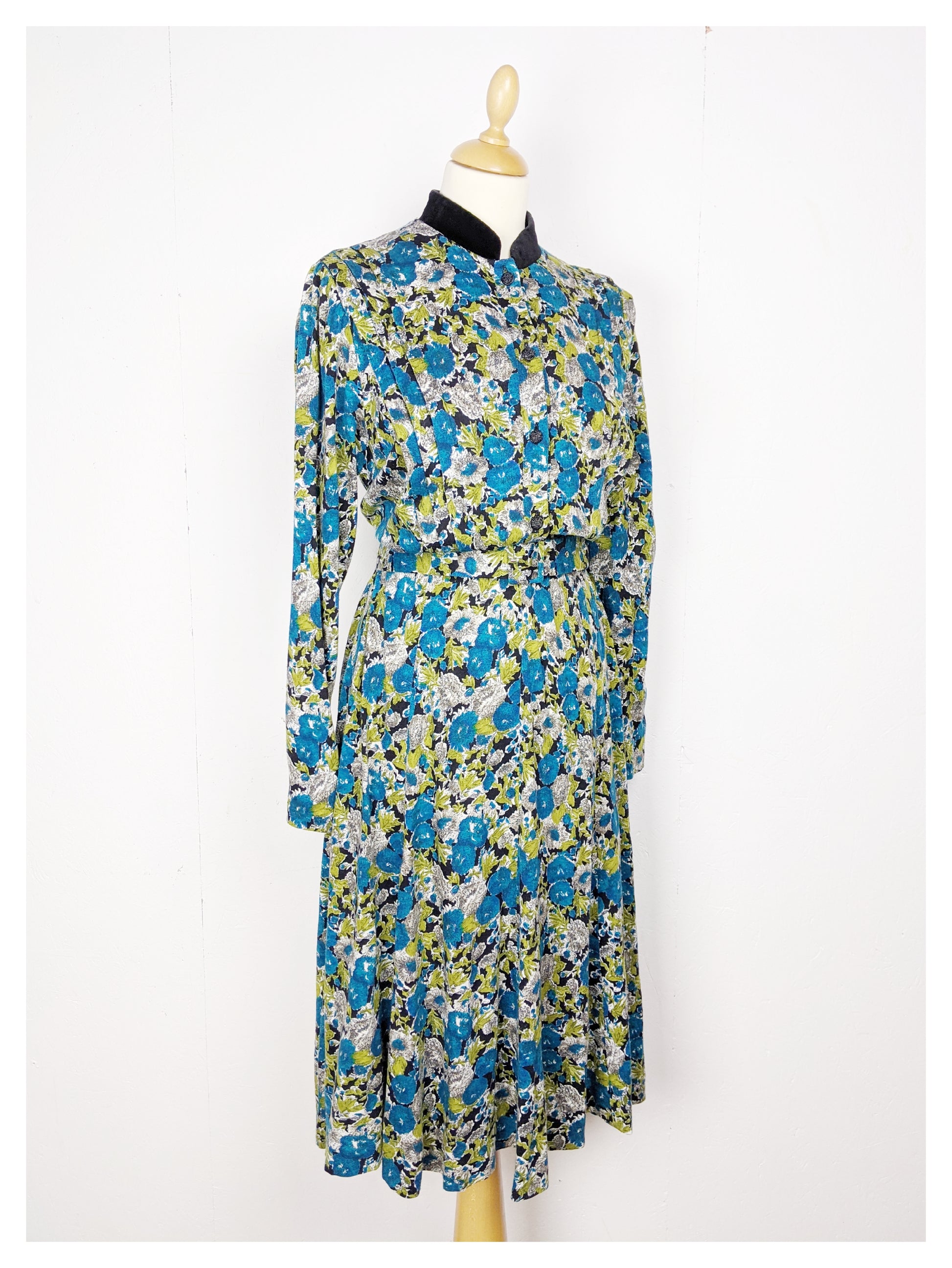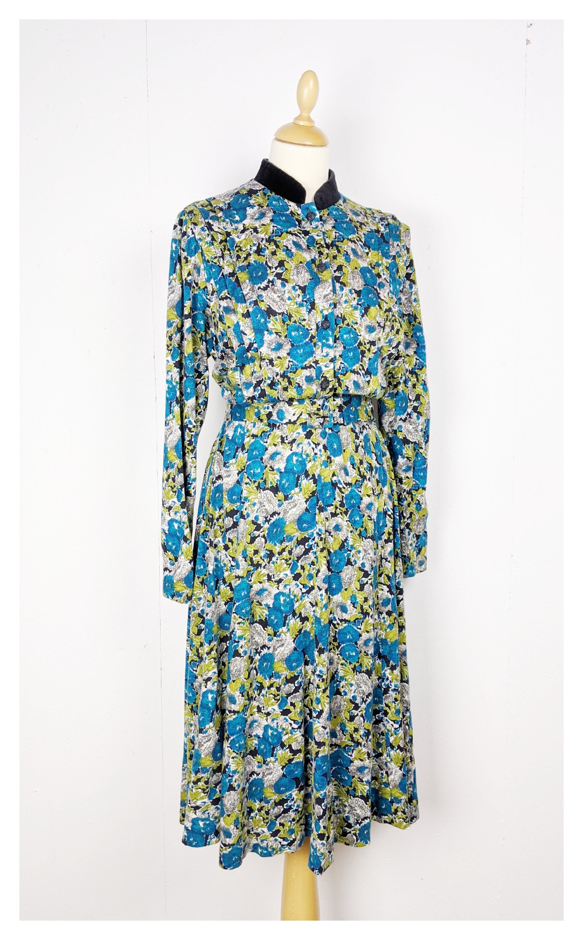Robe. Corsage boutonné sur le devant. Taille élastique. Pas de passant. Très joli col en velours.