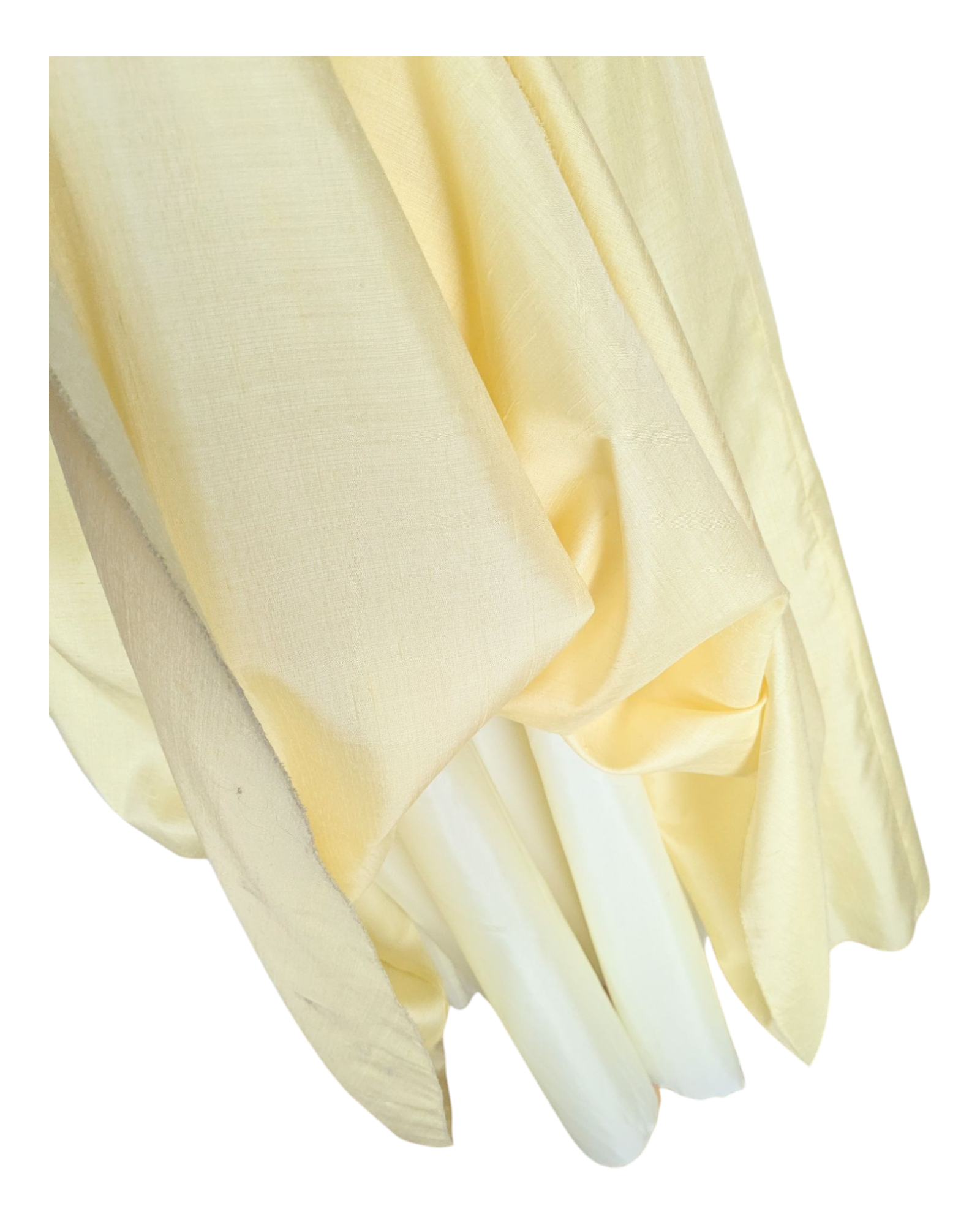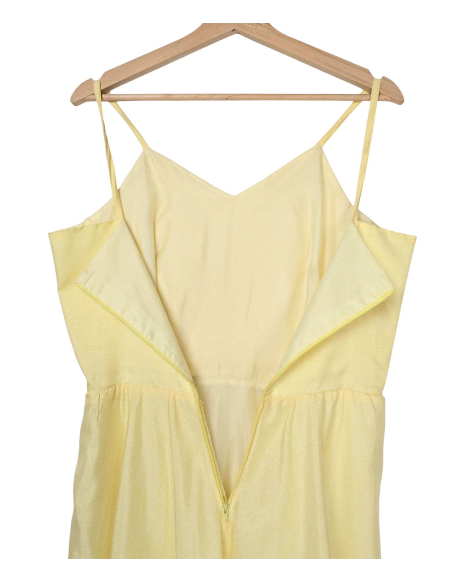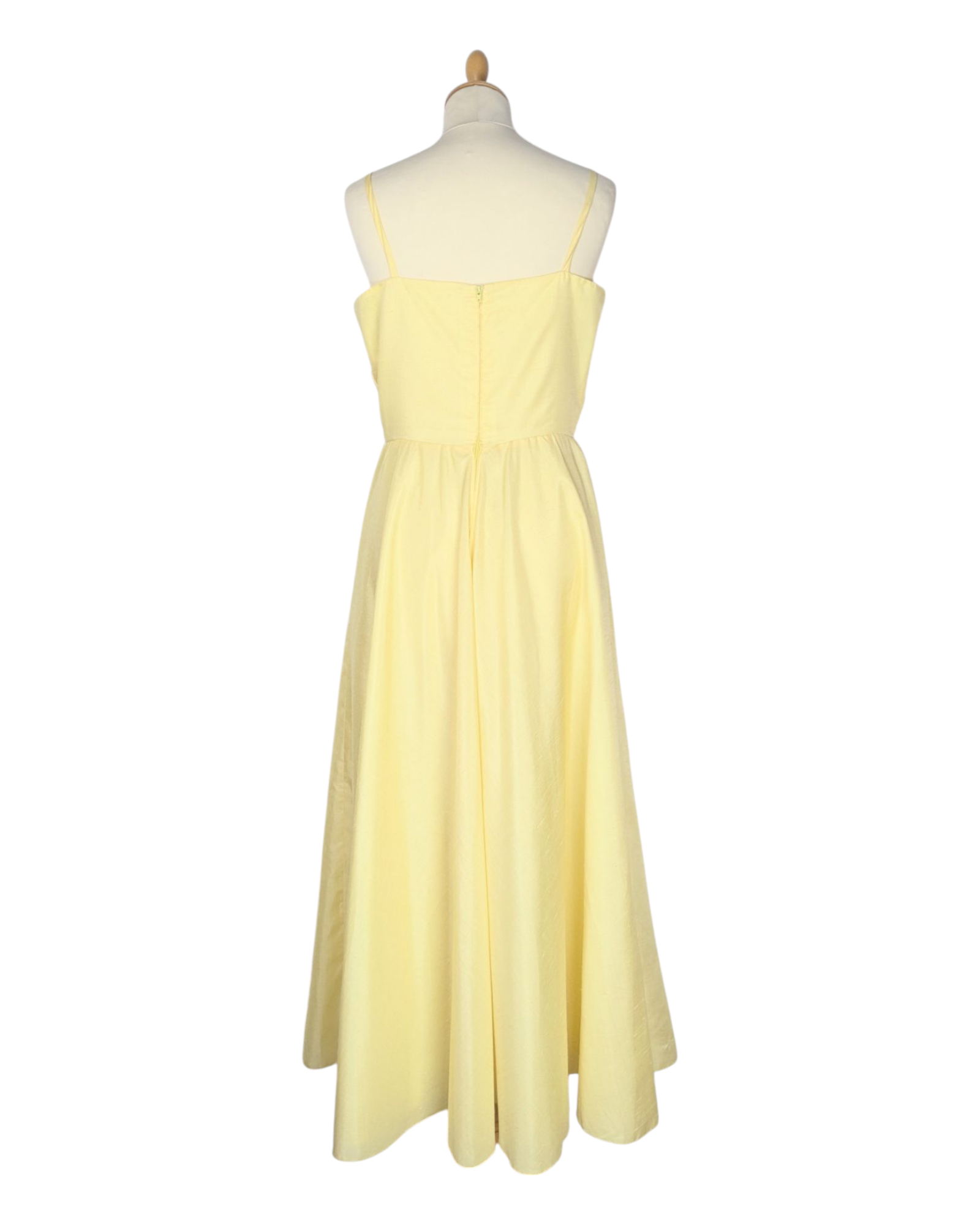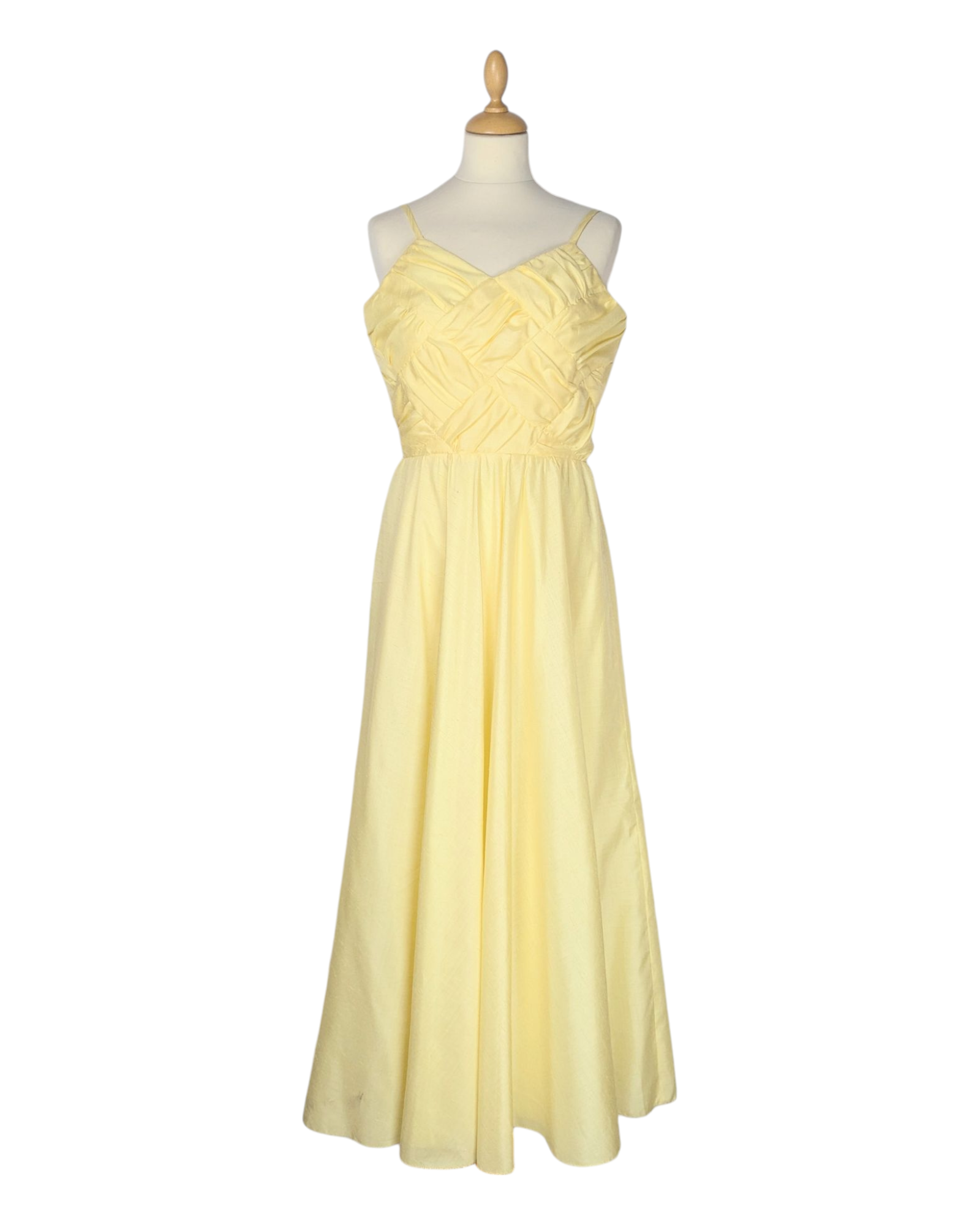 Robe de bal jaune clair. Bustier avec jupe longue corolle. Très joli travail au niveau du corsage tressé.